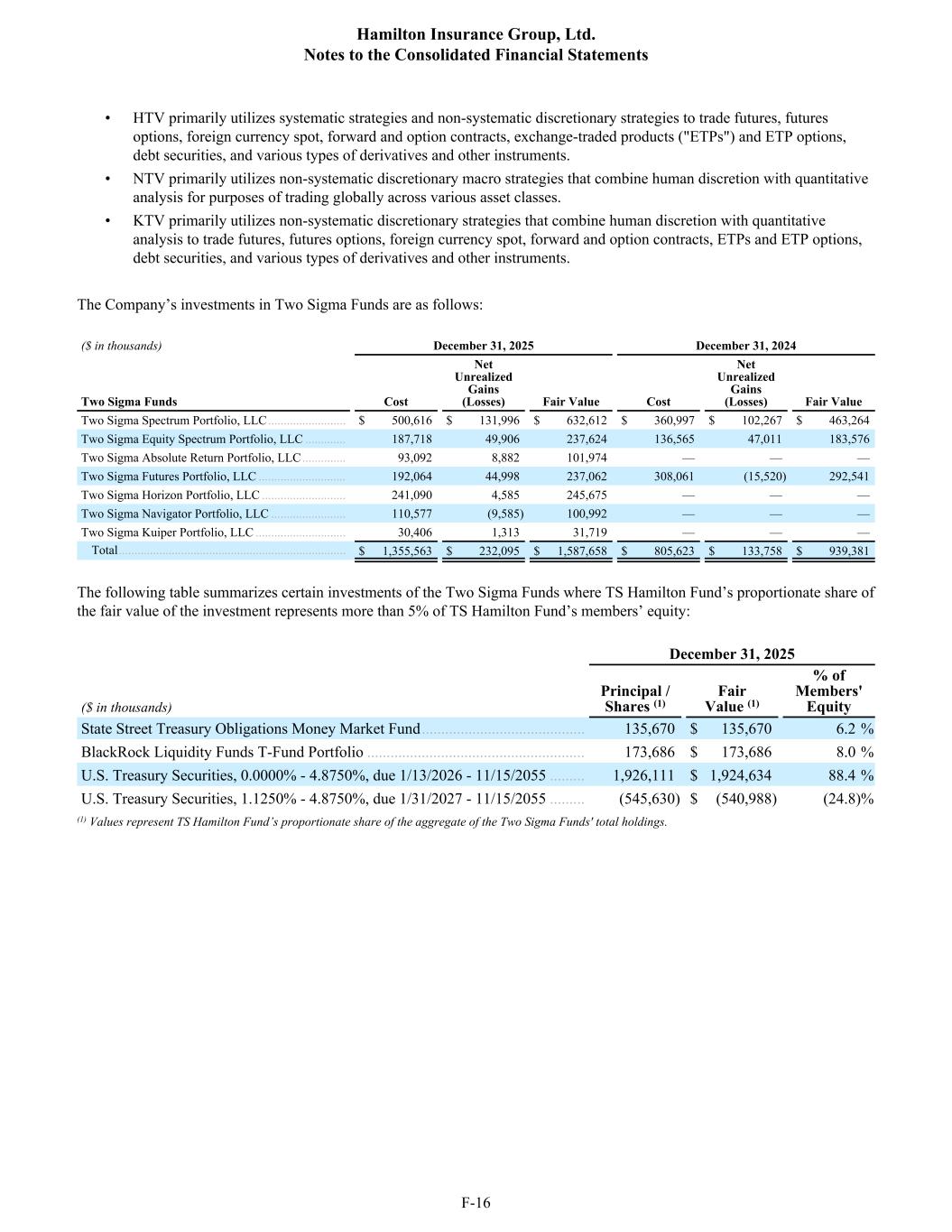 • HTV primarily utilizes systematic strategies and non-systematic discretionary strategies to trade futures, futures options, foreign currency spot, forward and option contracts, exchange-traded products ("ETPs") and ETP options, debt securities, and various types of derivatives and other instruments. • NTV primarily utilizes non-systematic discretionary macro strategies that combine human discretion with quantitative analysis for purposes of trading globally across various asset classes. • KTV primarily utilizes non-systematic discretionary strategies that combine human discretion with quantitative analysis to trade futures, futures options, foreign currency spot, forward and option contracts, ETPs and ETP options, debt securities, and various types of derivatives and other instruments. The Company’s investments in Two Sigma Funds are as follows: ($ in thousands) December 31, 2025 December 31, 2024 Two Sigma Funds Cost Net Unrealized Gains (Losses) Fair Value Cost Net Unrealized Gains (Losses) Fair Value Two Sigma Spectrum Portfolio, LLC ......................... $ 500,616 $ 131,996 $ 632,612 $ 360,997 $ 102,267 $ 463,264 Two Sigma Equity Spectrum Portfolio, LLC ............. 187,718 49,906 237,624 136,565 47,011 183,576 Two Sigma Absolute Return Portfolio, LLC .............. 93,092 8,882 101,974 — — — Two Sigma Futures Portfolio, LLC ............................ 192,064 44,998 237,062 308,061 (15,520) 292,541 Two Sigma Horizon Portfolio, LLC ........................... 241,090 4,585 245,675 — — — Two Sigma Navigator Portfolio, LLC ........................ 110,577 (9,585) 100,992 — — — Two Sigma Kuiper Portfolio, LLC ............................. 30,406 1,313 31,719 — — — Total ......................................................................... $ 1,355,563 $ 232,095 $ 1,587,658 $ 805,623 $ 133,758 $ 939,381 The following table summarizes certain investments of the Two Sigma Funds where TS Hamilton Fund’s proportionate share of the fair value of the investment represents more than 5% of TS Hamilton Fund’s members’ equity: December 31, 2025 ($ in thousands) Principal / Shares (1) Fair Value (1) % of Members' Equity State Street Treasury Obligations Money Market Fund .......................................... 135,670 $ 135,670 6.2 % BlackRock Liquidity Funds T-Fund Portfolio ........................................................ 173,686 $ 173,686 8.0 % U.S. Treasury Securities, 0.0000% - 4.8750%, due 1/13/2026 - 11/15/2055 ......... 1,926,111 $ 1,924,634 88.4 % U.S. Treasury Securities, 1.1250% - 4.8750%, due 1/31/2027 - 11/15/2055 ......... (545,630) $ (540,988) (24.8) % (1) Values represent TS Hamilton Fund’s proportionate share of the aggregate of the Two Sigma Funds' total holdings. Hamilton Insurance Group, Ltd. Notes to the Consolidated Financial Statements F-16