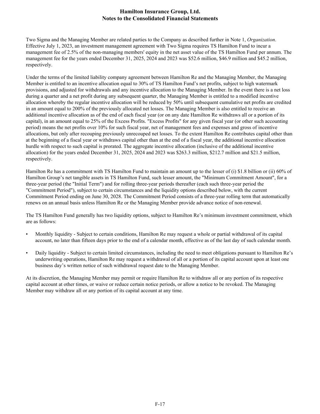 Two Sigma and the Managing Member are related parties to the Company as described further in Note 1, Organization. Effective July 1, 2023, an investment management agreement with Two Sigma requires TS Hamilton Fund to incur a management fee of 2.5% of the non-managing members' equity in the net asset value of the TS Hamilton Fund per annum. The management fee for the years ended December 31, 2025, 2024 and 2023 was $52.6 million, $46.9 million and $45.2 million, respectively. Under the terms of the limited liability company agreement between Hamilton Re and the Managing Member, the Managing Member is entitled to an incentive allocation equal to 30% of TS Hamilton Fund’s net profits, subject to high watermark provisions, and adjusted for withdrawals and any incentive allocation to the Managing Member. In the event there is a net loss during a quarter and a net profit during any subsequent quarter, the Managing Member is entitled to a modified incentive allocation whereby the regular incentive allocation will be reduced by 50% until subsequent cumulative net profits are credited in an amount equal to 200% of the previously allocated net losses. The Managing Member is also entitled to receive an additional incentive allocation as of the end of each fiscal year (or on any date Hamilton Re withdraws all or a portion of its capital), in an amount equal to 25% of the Excess Profits. "Excess Profits" for any given fiscal year (or other such accounting period) means the net profits over 10% for such fiscal year, net of management fees and expenses and gross of incentive allocations, but only after recouping previously unrecouped net losses. To the extent Hamilton Re contributes capital other than at the beginning of a fiscal year or withdraws capital other than at the end of a fiscal year, the additional incentive allocation hurdle with respect to such capital is prorated. The aggregate incentive allocation (inclusive of the additional incentive allocation) for the years ended December 31, 2025, 2024 and 2023 was $263.3 million, $212.7 million and $21.5 million, respectively. Hamilton Re has a commitment with TS Hamilton Fund to maintain an amount up to the lesser of (i) $1.8 billion or (ii) 60% of Hamilton Group’s net tangible assets in TS Hamilton Fund, such lesser amount, the "Minimum Commitment Amount", for a three-year period (the "Initial Term") and for rolling three-year periods thereafter (each such three-year period the "Commitment Period"), subject to certain circumstances and the liquidity options described below, with the current Commitment Period ending on June 30, 2028. The Commitment Period consists of a three-year rolling term that automatically renews on an annual basis unless Hamilton Re or the Managing Member provide advance notice of non-renewal. The TS Hamilton Fund generally has two liquidity options, subject to Hamilton Re’s minimum investment commitment, which are as follows: • Monthly liquidity - Subject to certain conditions, Hamilton Re may request a whole or partial withdrawal of its capital account, no later than fifteen days prior to the end of a calendar month, effective as of the last day of such calendar month. • Daily liquidity - Subject to certain limited circumstances, including the need to meet obligations pursuant to Hamilton Re’s underwriting operations, Hamilton Re may request a withdrawal of all or a portion of its capital account upon at least one business day’s written notice of such withdrawal request date to the Managing Member. At its discretion, the Managing Member may permit or require Hamilton Re to withdraw all or any portion of its respective capital account at other times, or waive or reduce certain notice periods, or allow a notice to be revoked. The Managing Member may withdraw all or any portion of its capital account at any time. Hamilton Insurance Group, Ltd. Notes to the Consolidated Financial Statements F-17