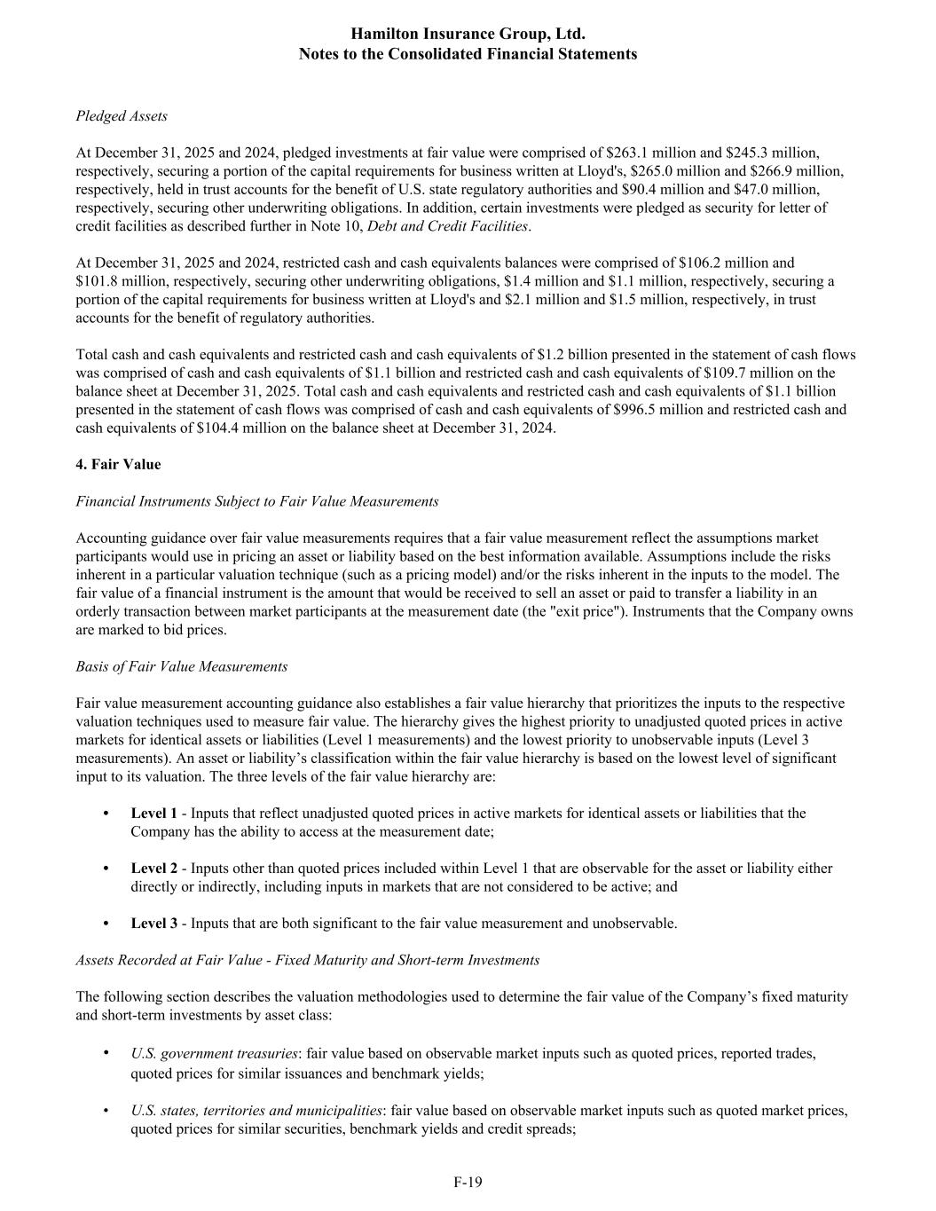 Pledged Assets At December 31, 2025 and 2024, pledged investments at fair value were comprised of $263.1 million and $245.3 million, respectively, securing a portion of the capital requirements for business written at Lloyd's, $265.0 million and $266.9 million, respectively, held in trust accounts for the benefit of U.S. state regulatory authorities and $90.4 million and $47.0 million, respectively, securing other underwriting obligations. In addition, certain investments were pledged as security for letter of credit facilities as described further in Note 10, Debt and Credit Facilities. At December 31, 2025 and 2024, restricted cash and cash equivalents balances were comprised of $106.2 million and $101.8 million, respectively, securing other underwriting obligations, $1.4 million and $1.1 million, respectively, securing a portion of the capital requirements for business written at Lloyd's and $2.1 million and $1.5 million, respectively, in trust accounts for the benefit of regulatory authorities. Total cash and cash equivalents and restricted cash and cash equivalents of $1.2 billion presented in the statement of cash flows was comprised of cash and cash equivalents of $1.1 billion and restricted cash and cash equivalents of $109.7 million on the balance sheet at December 31, 2025. Total cash and cash equivalents and restricted cash and cash equivalents of $1.1 billion presented in the statement of cash flows was comprised of cash and cash equivalents of $996.5 million and restricted cash and cash equivalents of $104.4 million on the balance sheet at December 31, 2024. 4. Fair Value Financial Instruments Subject to Fair Value Measurements Accounting guidance over fair value measurements requires that a fair value measurement reflect the assumptions market participants would use in pricing an asset or liability based on the best information available. Assumptions include the risks inherent in a particular valuation technique (such as a pricing model) and/or the risks inherent in the inputs to the model. The fair value of a financial instrument is the amount that would be received to sell an asset or paid to transfer a liability in an orderly transaction between market participants at the measurement date (the "exit price"). Instruments that the Company owns are marked to bid prices. Basis of Fair Value Measurements Fair value measurement accounting guidance also establishes a fair value hierarchy that prioritizes the inputs to the respective valuation techniques used to measure fair value. The hierarchy gives the highest priority to unadjusted quoted prices in active markets for identical assets or liabilities (Level 1 measurements) and the lowest priority to unobservable inputs (Level 3 measurements). An asset or liability’s classification within the fair value hierarchy is based on the lowest level of significant input to its valuation. The three levels of the fair value hierarchy are: • Level 1 - Inputs that reflect unadjusted quoted prices in active markets for identical assets or liabilities that the Company has the ability to access at the measurement date; • Level 2 - Inputs other than quoted prices included within Level 1 that are observable for the asset or liability either directly or indirectly, including inputs in markets that are not considered to be active; and • Level 3 - Inputs that are both significant to the fair value measurement and unobservable. Assets Recorded at Fair Value - Fixed Maturity and Short-term Investments The following section describes the valuation methodologies used to determine the fair value of the Company’s fixed maturity and short-term investments by asset class: • U.S. government treasuries: fair value based on observable market inputs such as quoted prices, reported trades, quoted prices for similar issuances and benchmark yields; • U.S. states, territories and municipalities: fair value based on observable market inputs such as quoted market prices, quoted prices for similar securities, benchmark yields and credit spreads; Hamilton Insurance Group, Ltd. Notes to the Consolidated Financial Statements F-19
