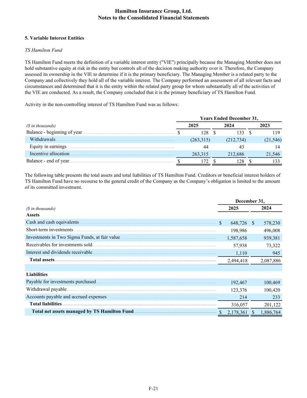 5. Variable Interest Entities TS Hamilton Fund TS Hamilton Fund meets the definition of a variable interest entity ("VIE") principally because the Managing Member does not hold substantive equity at risk in the entity but controls all of the decision making authority over it. Therefore, the Company assessed its ownership in the VIE to determine if it is the primary beneficiary. The Managing Member is a related party to the Company and collectively they hold all of the variable interest. The Company performed an assessment of all relevant facts and circumstances and determined that it is the entity within the related party group for whom substantially all of the activities of the VIE are conducted. As a result, the Company concluded that it is the primary beneficiary of TS Hamilton Fund. Activity in the non-controlling interest of TS Hamilton Fund was as follows: Years Ended December 31, ($ in thousands) 2025 2024 2023 Balance - beginning of year .......................................................................... $ 128 $ 133 $ 119 Withdrawals ............................................................................................... (263,315) (212,734) (21,546) Equity in earnings ...................................................................................... 44 43 14 Incentive allocation .................................................................................... 263,315 212,686 21,546 Balance - end of year .................................................................................... $ 172 $ 128 $ 133 The following table presents the total assets and total liabilities of TS Hamilton Fund. Creditors or beneficial interest holders of TS Hamilton Fund have no recourse to the general credit of the Company as the Company’s obligation is limited to the amount of its committed investment. December 31, ($ in thousands) 2025 2024 Assets Cash and cash equivalents ............................................................................................................. $ 648,726 $ 578,230 Short-term investments .................................................................................................................. 198,986 496,008 Investments in Two Sigma Funds, at fair value ............................................................................ 1,587,658 939,381 Receivables for investments sold ................................................................................................... 57,938 73,322 Interest and dividends receivable ................................................................................................... 1,110 945 Total assets ................................................................................................................................. 2,494,418 2,087,886 Liabilities Payable for investments purchased ................................................................................................ 192,467 100,469 Withdrawal payable ....................................................................................................................... 123,376 100,420 Accounts payable and accrued expenses ....................................................................................... 214 233 Total liabilities ........................................................................................................................... 316,057 201,122 Total net assets managed by TS Hamilton Fund .................................................................. $ 2,178,361 $ 1,886,764 Hamilton Insurance Group, Ltd. Notes to the Consolidated Financial Statements F-21