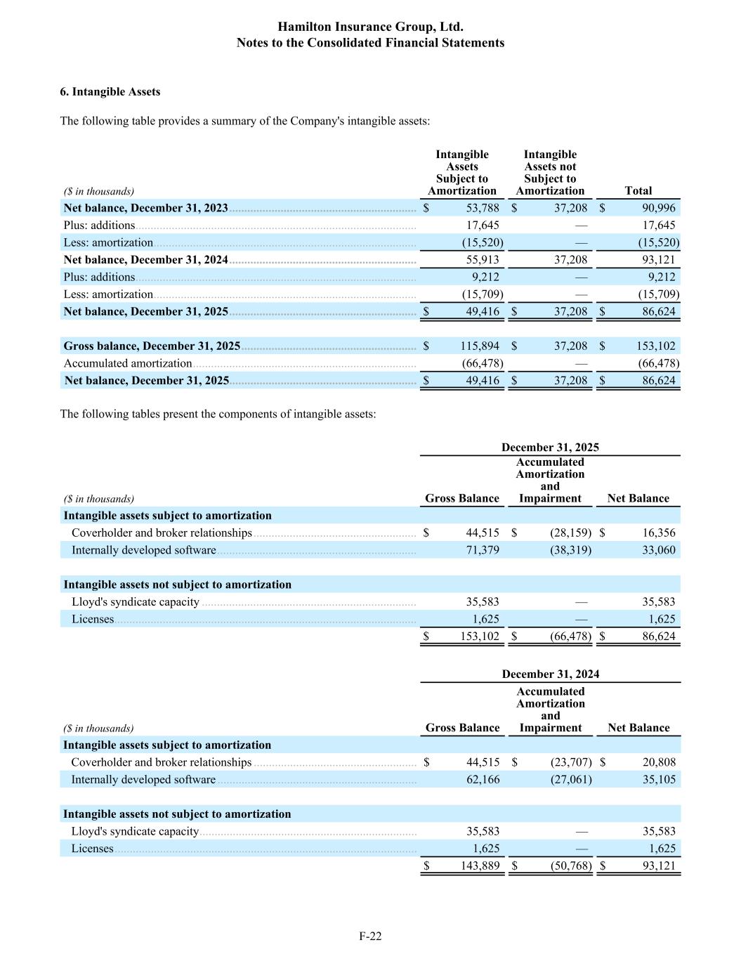6. Intangible Assets The following table provides a summary of the Company's intangible assets: ($ in thousands) Intangible Assets Subject to Amortization Intangible Assets not Subject to Amortization Total Net balance, December 31, 2023 .............................................................. $ 53,788 $ 37,208 $ 90,996 Plus: additions ............................................................................................. 17,645 — 17,645 Less: amortization ....................................................................................... (15,520) — (15,520) Net balance, December 31, 2024 .............................................................. 55,913 37,208 93,121 Plus: additions ............................................................................................. 9,212 — 9,212 Less: amortization ....................................................................................... (15,709) — (15,709) Net balance, December 31, 2025 .............................................................. $ 49,416 $ 37,208 $ 86,624 Gross balance, December 31, 2025 .......................................................... $ 115,894 $ 37,208 $ 153,102 Accumulated amortization .......................................................................... (66,478) — (66,478) Net balance, December 31, 2025.............................................................. $ 49,416 $ 37,208 $ 86,624 The following tables present the components of intangible assets: December 31, 2025 ($ in thousands) Gross Balance Accumulated Amortization and Impairment Net Balance Intangible assets subject to amortization Coverholder and broker relationships ...................................................... $ 44,515 $ (28,159) $ 16,356 Internally developed software .................................................................. 71,379 (38,319) 33,060 Intangible assets not subject to amortization Lloyd's syndicate capacity ....................................................................... 35,583 — 35,583 Licenses .................................................................................................... 1,625 — 1,625 $ 153,102 $ (66,478) $ 86,624 December 31, 2024 ($ in thousands) Gross Balance Accumulated Amortization and Impairment Net Balance Intangible assets subject to amortization Coverholder and broker relationships ...................................................... $ 44,515 $ (23,707) $ 20,808 Internally developed software .................................................................. 62,166 (27,061) 35,105 Intangible assets not subject to amortization Lloyd's syndicate capacity ........................................................................ 35,583 — 35,583 Licenses .................................................................................................... 1,625 — 1,625 $ 143,889 $ (50,768) $ 93,121 Hamilton Insurance Group, Ltd. Notes to the Consolidated Financial Statements F-22