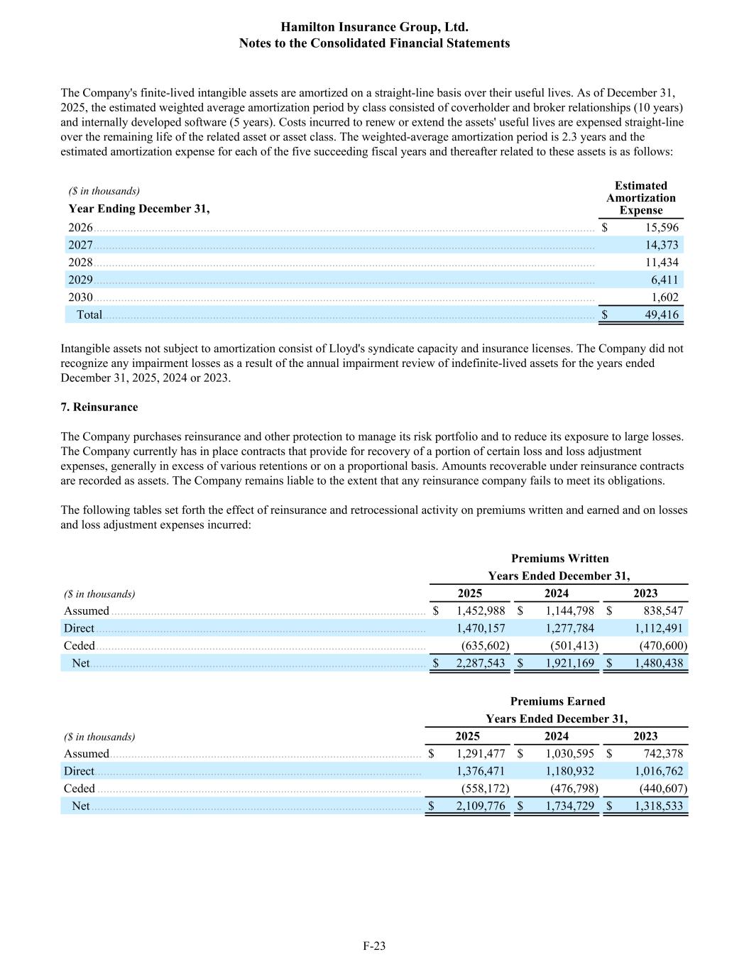 The Company's finite-lived intangible assets are amortized on a straight-line basis over their useful lives. As of December 31, 2025, the estimated weighted average amortization period by class consisted of coverholder and broker relationships (10 years) and internally developed software (5 years). Costs incurred to renew or extend the assets' useful lives are expensed straight-line over the remaining life of the related asset or asset class. The weighted-average amortization period is 2.3 years and the estimated amortization expense for each of the five succeeding fiscal years and thereafter related to these assets is as follows: Estimated Amortization Expense ($ in thousands) Year Ending December 31, 2026 .................................................................................................................................................................... $ 15,596 2027 .................................................................................................................................................................... 14,373 2028 .................................................................................................................................................................... 11,434 2029 .................................................................................................................................................................... 6,411 2030 .................................................................................................................................................................... 1,602 Total ................................................................................................................................................................. $ 49,416 Intangible assets not subject to amortization consist of Lloyd's syndicate capacity and insurance licenses. The Company did not recognize any impairment losses as a result of the annual impairment review of indefinite-lived assets for the years ended December 31, 2025, 2024 or 2023. 7. Reinsurance The Company purchases reinsurance and other protection to manage its risk portfolio and to reduce its exposure to large losses. The Company currently has in place contracts that provide for recovery of a portion of certain loss and loss adjustment expenses, generally in excess of various retentions or on a proportional basis. Amounts recoverable under reinsurance contracts are recorded as assets. The Company remains liable to the extent that any reinsurance company fails to meet its obligations. The following tables set forth the effect of reinsurance and retrocessional activity on premiums written and earned and on losses and loss adjustment expenses incurred: Premiums Written Years Ended December 31, ($ in thousands) 2025 2024 2023 Assumed ....................................................................................................... $ 1,452,988 $ 1,144,798 $ 838,547 Direct ............................................................................................................ 1,470,157 1,277,784 1,112,491 Ceded ............................................................................................................ (635,602) (501,413) (470,600) Net .............................................................................................................. $ 2,287,543 $ 1,921,169 $ 1,480,438 Premiums Earned Years Ended December 31, ($ in thousands) 2025 2024 2023 Assumed ...................................................................................................... $ 1,291,477 $ 1,030,595 $ 742,378 Direct ........................................................................................................... 1,376,471 1,180,932 1,016,762 Ceded .......................................................................................................... (558,172) (476,798) (440,607) Net ............................................................................................................ $ 2,109,776 $ 1,734,729 $ 1,318,533 Hamilton Insurance Group, Ltd. Notes to the Consolidated Financial Statements F-23