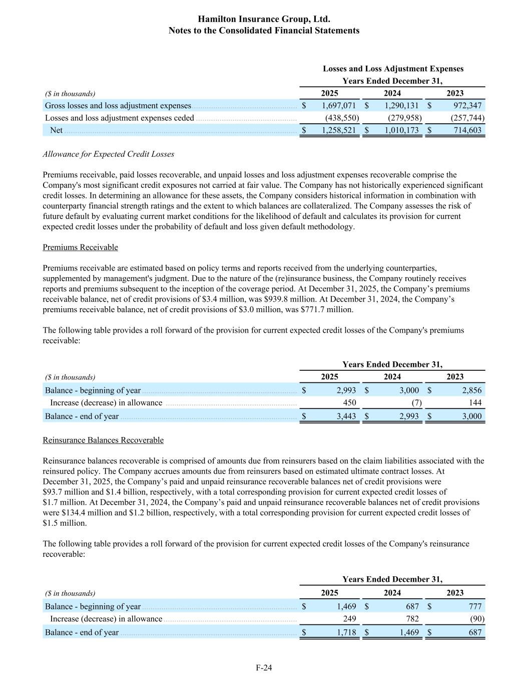 Losses and Loss Adjustment Expenses Years Ended December 31, ($ in thousands) 2025 2024 2023 Gross losses and loss adjustment expenses ................................................. $ 1,697,071 $ 1,290,131 $ 972,347 Losses and loss adjustment expenses ceded ............................................... (438,550) (279,958) (257,744) Net ............................................................................................................ $ 1,258,521 $ 1,010,173 $ 714,603 Allowance for Expected Credit Losses Premiums receivable, paid losses recoverable, and unpaid losses and loss adjustment expenses recoverable comprise the Company's most significant credit exposures not carried at fair value. The Company has not historically experienced significant credit losses. In determining an allowance for these assets, the Company considers historical information in combination with counterparty financial strength ratings and the extent to which balances are collateralized. The Company assesses the risk of future default by evaluating current market conditions for the likelihood of default and calculates its provision for current expected credit losses under the probability of default and loss given default methodology. Premiums Receivable Premiums receivable are estimated based on policy terms and reports received from the underlying counterparties, supplemented by management's judgment. Due to the nature of the (re)insurance business, the Company routinely receives reports and premiums subsequent to the inception of the coverage period. At December 31, 2025, the Company’s premiums receivable balance, net of credit provisions of $3.4 million, was $939.8 million. At December 31, 2024, the Company’s premiums receivable balance, net of credit provisions of $3.0 million, was $771.7 million. The following table provides a roll forward of the provision for current expected credit losses of the Company's premiums receivable: Years Ended December 31, ($ in thousands) 2025 2024 2023 Balance - beginning of year ........................................................................ $ 2,993 $ 3,000 $ 2,856 Increase (decrease) in allowance ............................................................. 450 (7) 144 Balance - end of year .................................................................................. $ 3,443 $ 2,993 $ 3,000 Reinsurance Balances Recoverable Reinsurance balances recoverable is comprised of amounts due from reinsurers based on the claim liabilities associated with the reinsured policy. The Company accrues amounts due from reinsurers based on estimated ultimate contract losses. At December 31, 2025, the Company’s paid and unpaid reinsurance recoverable balances net of credit provisions were $93.7 million and $1.4 billion, respectively, with a total corresponding provision for current expected credit losses of $1.7 million. At December 31, 2024, the Company’s paid and unpaid reinsurance recoverable balances net of credit provisions were $134.4 million and $1.2 billion, respectively, with a total corresponding provision for current expected credit losses of $1.5 million. The following table provides a roll forward of the provision for current expected credit losses of the Company's reinsurance recoverable: Years Ended December 31, ($ in thousands) 2025 2024 2023 Balance - beginning of year ........................................................................ $ 1,469 $ 687 $ 777 Increase (decrease) in allowance .............................................................. 249 782 (90) Balance - end of year .................................................................................. $ 1,718 $ 1,469 $ 687 Hamilton Insurance Group, Ltd. Notes to the Consolidated Financial Statements F-24