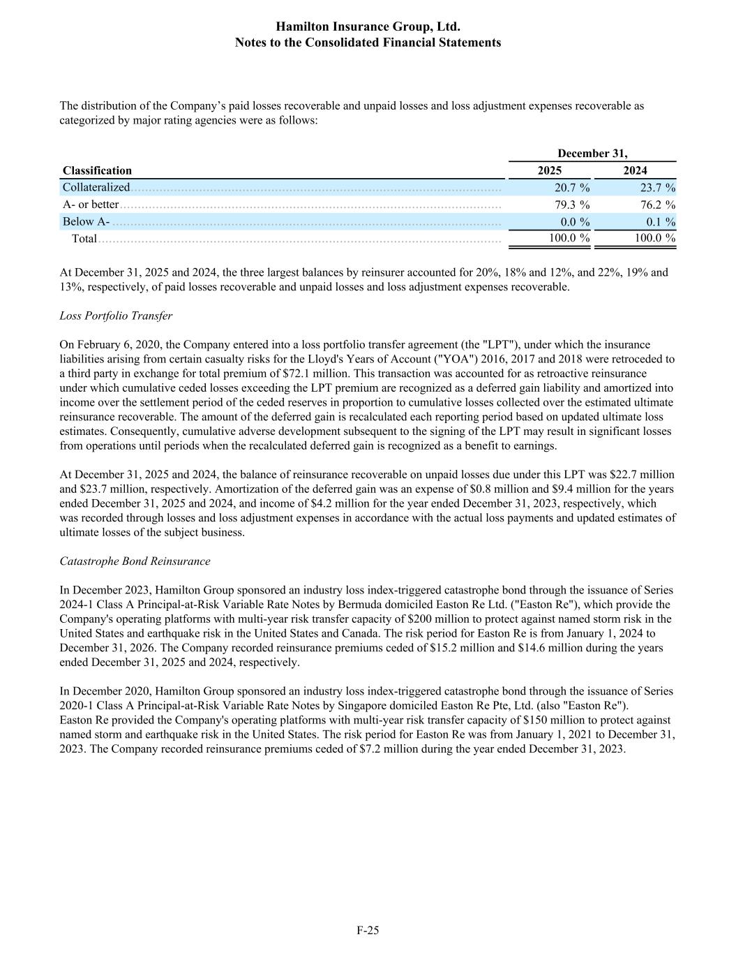 The distribution of the Company’s paid losses recoverable and unpaid losses and loss adjustment expenses recoverable as categorized by major rating agencies were as follows: December 31, Classification 2025 2024 Collateralized ....................................................................................................... 20.7 % 23.7 % A- or better .......................................................................................................... 79.3 % 76.2 % Below A- ............................................................................................................ 0.0 % 0.1 % Total ................................................................................................................ 100.0 % 100.0 % At December 31, 2025 and 2024, the three largest balances by reinsurer accounted for 20%, 18% and 12%, and 22%, 19% and 13%, respectively, of paid losses recoverable and unpaid losses and loss adjustment expenses recoverable. Loss Portfolio Transfer On February 6, 2020, the Company entered into a loss portfolio transfer agreement (the "LPT"), under which the insurance liabilities arising from certain casualty risks for the Lloyd's Years of Account ("YOA") 2016, 2017 and 2018 were retroceded to a third party in exchange for total premium of $72.1 million. This transaction was accounted for as retroactive reinsurance under which cumulative ceded losses exceeding the LPT premium are recognized as a deferred gain liability and amortized into income over the settlement period of the ceded reserves in proportion to cumulative losses collected over the estimated ultimate reinsurance recoverable. The amount of the deferred gain is recalculated each reporting period based on updated ultimate loss estimates. Consequently, cumulative adverse development subsequent to the signing of the LPT may result in significant losses from operations until periods when the recalculated deferred gain is recognized as a benefit to earnings. At December 31, 2025 and 2024, the balance of reinsurance recoverable on unpaid losses due under this LPT was $22.7 million and $23.7 million, respectively. Amortization of the deferred gain was an expense of $0.8 million and $9.4 million for the years ended December 31, 2025 and 2024, and income of $4.2 million for the year ended December 31, 2023, respectively, which was recorded through losses and loss adjustment expenses in accordance with the actual loss payments and updated estimates of ultimate losses of the subject business. Catastrophe Bond Reinsurance In December 2023, Hamilton Group sponsored an industry loss index-triggered catastrophe bond through the issuance of Series 2024-1 Class A Principal-at-Risk Variable Rate Notes by Bermuda domiciled Easton Re Ltd. ("Easton Re"), which provide the Company's operating platforms with multi-year risk transfer capacity of $200 million to protect against named storm risk in the United States and earthquake risk in the United States and Canada. The risk period for Easton Re is from January 1, 2024 to December 31, 2026. The Company recorded reinsurance premiums ceded of $15.2 million and $14.6 million during the years ended December 31, 2025 and 2024, respectively. In December 2020, Hamilton Group sponsored an industry loss index-triggered catastrophe bond through the issuance of Series 2020-1 Class A Principal-at-Risk Variable Rate Notes by Singapore domiciled Easton Re Pte, Ltd. (also "Easton Re"). Easton Re provided the Company's operating platforms with multi-year risk transfer capacity of $150 million to protect against named storm and earthquake risk in the United States. The risk period for Easton Re was from January 1, 2021 to December 31, 2023. The Company recorded reinsurance premiums ceded of $7.2 million during the year ended December 31, 2023. Hamilton Insurance Group, Ltd. Notes to the Consolidated Financial Statements F-25