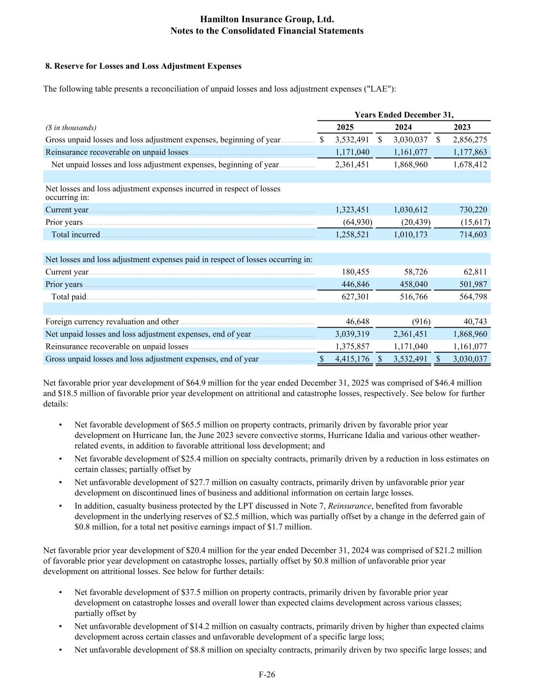 8. Reserve for Losses and Loss Adjustment Expenses The following table presents a reconciliation of unpaid losses and loss adjustment expenses ("LAE"): Years Ended December 31, ($ in thousands) 2025 2024 2023 Gross unpaid losses and loss adjustment expenses, beginning of year ................ $ 3,532,491 $ 3,030,037 $ 2,856,275 Reinsurance recoverable on unpaid losses ........................................................... 1,171,040 1,161,077 1,177,863 Net unpaid losses and loss adjustment expenses, beginning of year ................. 2,361,451 1,868,960 1,678,412 Net losses and loss adjustment expenses incurred in respect of losses occurring in: Current year .......................................................................................................... 1,323,451 1,030,612 730,220 Prior years ............................................................................................................ (64,930) (20,439) (15,617) Total incurred .................................................................................................... 1,258,521 1,010,173 714,603 Net losses and loss adjustment expenses paid in respect of losses occurring in: Current year .......................................................................................................... 180,455 58,726 62,811 Prior years ............................................................................................................ 446,846 458,040 501,987 Total paid ........................................................................................................... 627,301 516,766 564,798 Foreign currency revaluation and other ............................................................... 46,648 (916) 40,743 Net unpaid losses and loss adjustment expenses, end of year ............................. 3,039,319 2,361,451 1,868,960 Reinsurance recoverable on unpaid losses .......................................................... 1,375,857 1,171,040 1,161,077 Gross unpaid losses and loss adjustment expenses, end of year .......................... $ 4,415,176 $ 3,532,491 $ 3,030,037 Net favorable prior year development of $64.9 million for the year ended December 31, 2025 was comprised of $46.4 million and $18.5 million of favorable prior year development on attritional and catastrophe losses, respectively. See below for further details: • Net favorable development of $65.5 million on property contracts, primarily driven by favorable prior year development on Hurricane Ian, the June 2023 severe convective storms, Hurricane Idalia and various other weather- related events, in addition to favorable attritional loss development; and • Net favorable development of $25.4 million on specialty contracts, primarily driven by a reduction in loss estimates on certain classes; partially offset by • Net unfavorable development of $27.7 million on casualty contracts, primarily driven by unfavorable prior year development on discontinued lines of business and additional information on certain large losses. • In addition, casualty business protected by the LPT discussed in Note 7, Reinsurance, benefited from favorable development in the underlying reserves of $2.5 million, which was partially offset by a change in the deferred gain of $0.8 million, for a total net positive earnings impact of $1.7 million. Net favorable prior year development of $20.4 million for the year ended December 31, 2024 was comprised of $21.2 million of favorable prior year development on catastrophe losses, partially offset by $0.8 million of unfavorable prior year development on attritional losses. See below for further details: • Net favorable development of $37.5 million on property contracts, primarily driven by favorable prior year development on catastrophe losses and overall lower than expected claims development across various classes; partially offset by • Net unfavorable development of $14.2 million on casualty contracts, primarily driven by higher than expected claims development across certain classes and unfavorable development of a specific large loss; • Net unfavorable development of $8.8 million on specialty contracts, primarily driven by two specific large losses; and Hamilton Insurance Group, Ltd. Notes to the Consolidated Financial Statements F-26