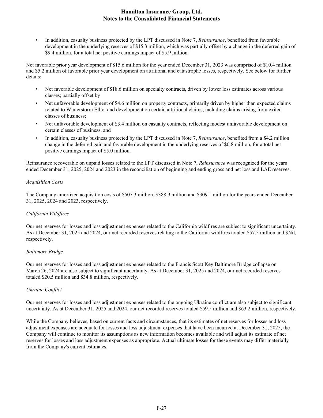• In addition, casualty business protected by the LPT discussed in Note 7, Reinsurance, benefited from favorable development in the underlying reserves of $15.3 million, which was partially offset by a change in the deferred gain of $9.4 million, for a total net positive earnings impact of $5.9 million. Net favorable prior year development of $15.6 million for the year ended December 31, 2023 was comprised of $10.4 million and $5.2 million of favorable prior year development on attritional and catastrophe losses, respectively. See below for further details: • Net favorable development of $18.6 million on specialty contracts, driven by lower loss estimates across various classes; partially offset by • Net unfavorable development of $4.6 million on property contracts, primarily driven by higher than expected claims related to Winterstorm Elliot and development on certain attritional claims, including claims arising from exited classes of business; • Net unfavorable development of $3.4 million on casualty contracts, reflecting modest unfavorable development on certain classes of business; and • In addition, casualty business protected by the LPT discussed in Note 7, Reinsurance, benefited from a $4.2 million change in the deferred gain and favorable development in the underlying reserves of $0.8 million, for a total net positive earnings impact of $5.0 million. Reinsurance recoverable on unpaid losses related to the LPT discussed in Note 7, Reinsurance was recognized for the years ended December 31, 2025, 2024 and 2023 in the reconciliation of beginning and ending gross and net loss and LAE reserves. Acquisition Costs The Company amortized acquisition costs of $507.3 million, $388.9 million and $309.1 million for the years ended December 31, 2025, 2024 and 2023, respectively. California Wildfires Our net reserves for losses and loss adjustment expenses related to the California wildfires are subject to significant uncertainty. As at December 31, 2025 and 2024, our net recorded reserves relating to the California wildfires totaled $57.5 million and $Nil, respectively. Baltimore Bridge Our net reserves for losses and loss adjustment expenses related to the Francis Scott Key Baltimore Bridge collapse on March 26, 2024 are also subject to significant uncertainty. As at December 31, 2025 and 2024, our net recorded reserves totaled $20.5 million and $34.8 million, respectively. Ukraine Conflict Our net reserves for losses and loss adjustment expenses related to the ongoing Ukraine conflict are also subject to significant uncertainty. As at December 31, 2025 and 2024, our net recorded reserves totaled $59.5 million and $63.2 million, respectively. While the Company believes, based on current facts and circumstances, that its estimates of net reserves for losses and loss adjustment expenses are adequate for losses and loss adjustment expenses that have been incurred at December 31, 2025, the Company will continue to monitor its assumptions as new information becomes available and will adjust its estimate of net reserves for losses and loss adjustment expenses as appropriate. Actual ultimate losses for these events may differ materially from the Company's current estimates. Hamilton Insurance Group, Ltd. Notes to the Consolidated Financial Statements F-27