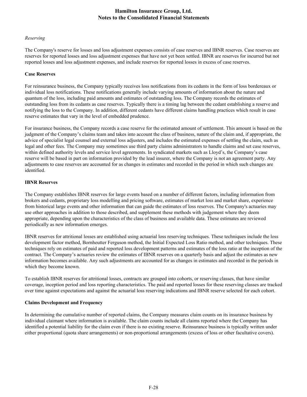Reserving The Company's reserve for losses and loss adjustment expenses consists of case reserves and IBNR reserves. Case reserves are reserves for reported losses and loss adjustment expenses that have not yet been settled. IBNR are reserves for incurred but not reported losses and loss adjustment expenses, and include reserves for reported losses in excess of case reserves. Case Reserves For reinsurance business, the Company typically receives loss notifications from its cedants in the form of loss bordereaux or individual loss notifications. These notifications generally include varying amounts of information about the nature and quantum of the loss, including paid amounts and estimates of outstanding loss. The Company records the estimates of outstanding loss from its cedants as case reserves. Typically there is a timing lag between the cedant establishing a reserve and notifying the loss to the Company. In addition, different cedants have different claims handling practices which result in case reserve estimates that vary in the level of embedded prudence. For insurance business, the Company records a case reserve for the estimated amount of settlement. This amount is based on the judgment of the Company’s claims team and takes into account the class of business, nature of the claim and, if appropriate, the advice of specialist legal counsel and external loss adjusters, and includes the estimated expenses of settling the claim, such as legal and other fees. The Company may sometimes use third party claims administrators to handle claims and set case reserves, within defined authority levels and service level agreements. In syndicated markets such as Lloyd’s, the Company’s case reserve will be based in part on information provided by the lead insurer, where the Company is not an agreement party. Any adjustments to case reserves are accounted for as changes in estimates and recorded in the period in which such changes are identified. IBNR Reserves The Company establishes IBNR reserves for large events based on a number of different factors, including information from brokers and cedants, proprietary loss modelling and pricing software, estimates of market loss and market share, experience from historical large events and other information that can guide the estimates of loss reserves. The Company's actuaries may use other approaches in addition to those described, and supplement these methods with judgement where they deem appropriate, depending upon the characteristics of the class of business and available data. These estimates are reviewed periodically as new information emerges. IBNR reserves for attritional losses are established using actuarial loss reserving techniques. These techniques include the loss development factor method, Bornheutter Ferguson method, the Initial Expected Loss Ratio method, and other techniques. These techniques rely on estimates of paid and reported loss development patterns and estimates of the loss ratio at the inception of the contract. The Company’s actuaries review the estimates of IBNR reserves on a quarterly basis and adjust the estimates as new information becomes available. Any such adjustments are accounted for as changes in estimates and recorded in the periods in which they become known. To establish IBNR reserves for attritional losses, contracts are grouped into cohorts, or reserving classes, that have similar coverage, inception period and loss reporting characteristics. The paid and reported losses for these reserving classes are tracked over time against expectations and against the actuarial loss reserving indications and IBNR reserve selected for each cohort. Claims Development and Frequency In determining the cumulative number of reported claims, the Company measures claim counts on its insurance business by individual claimant where information is available. The claim counts include all claims reported where the Company has identified a potential liability for the claim even if there is no existing reserve. Reinsurance business is typically written under either proportional (quota share arrangements) or non-proportional arrangements (excess of loss or other facultative covers). Hamilton Insurance Group, Ltd. Notes to the Consolidated Financial Statements F-28