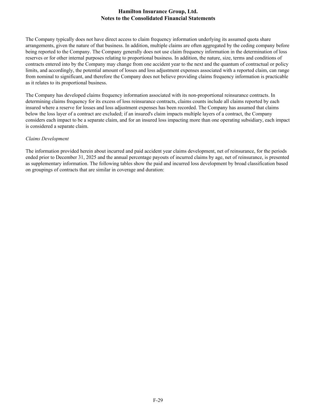 The Company typically does not have direct access to claim frequency information underlying its assumed quota share arrangements, given the nature of that business. In addition, multiple claims are often aggregated by the ceding company before being reported to the Company. The Company generally does not use claim frequency information in the determination of loss reserves or for other internal purposes relating to proportional business. In addition, the nature, size, terms and conditions of contracts entered into by the Company may change from one accident year to the next and the quantum of contractual or policy limits, and accordingly, the potential amount of losses and loss adjustment expenses associated with a reported claim, can range from nominal to significant, and therefore the Company does not believe providing claims frequency information is practicable as it relates to its proportional business. The Company has developed claims frequency information associated with its non-proportional reinsurance contracts. In determining claims frequency for its excess of loss reinsurance contracts, claims counts include all claims reported by each insured where a reserve for losses and loss adjustment expenses has been recorded. The Company has assumed that claims below the loss layer of a contract are excluded; if an insured's claim impacts multiple layers of a contract, the Company considers each impact to be a separate claim, and for an insured loss impacting more than one operating subsidiary, each impact is considered a separate claim. Claims Development The information provided herein about incurred and paid accident year claims development, net of reinsurance, for the periods ended prior to December 31, 2025 and the annual percentage payouts of incurred claims by age, net of reinsurance, is presented as supplementary information. The following tables show the paid and incurred loss development by broad classification based on groupings of contracts that are similar in coverage and duration: Hamilton Insurance Group, Ltd. Notes to the Consolidated Financial Statements F-29
