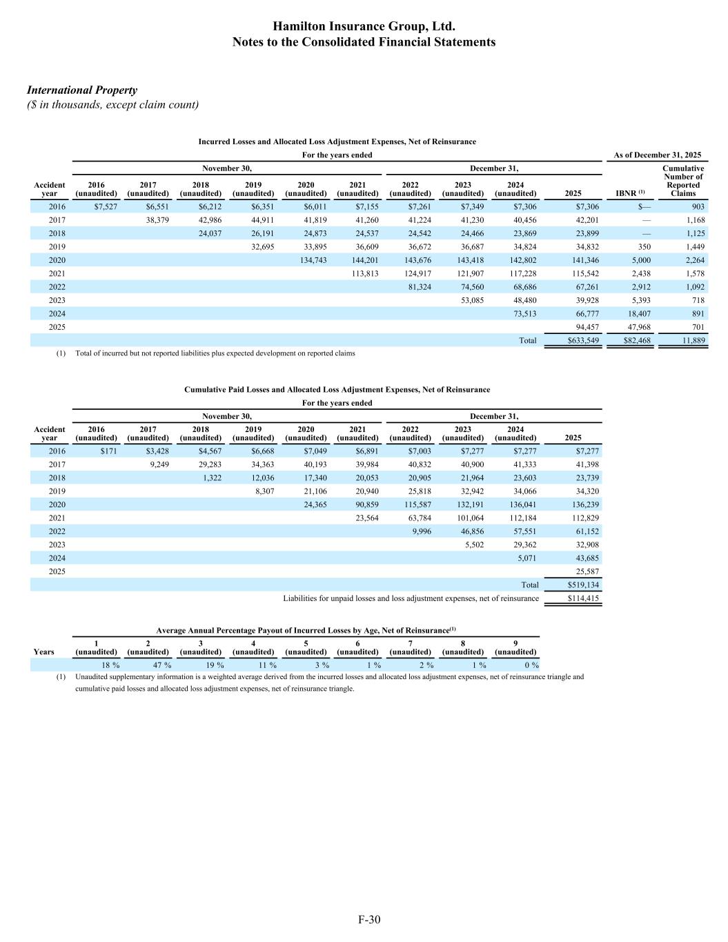 International Property ($ in thousands, except claim count) Incurred Losses and Allocated Loss Adjustment Expenses, Net of Reinsurance For the years ended As of December 31, 2025 November 30, December 31, IBNR (1) Cumulative Number of Reported Claims Accident year 2016 (unaudited) 2017 (unaudited) 2018 (unaudited) 2019 (unaudited) 2020 (unaudited) 2021 (unaudited) 2022 (unaudited) 2023 (unaudited) 2024 (unaudited) 2025 2016 $7,527 $6,551 $6,212 $6,351 $6,011 $7,155 $7,261 $7,349 $7,306 $7,306 $— 903 2017 38,379 42,986 44,911 41,819 41,260 41,224 41,230 40,456 42,201 — 1,168 2018 24,037 26,191 24,873 24,537 24,542 24,466 23,869 23,899 — 1,125 2019 32,695 33,895 36,609 36,672 36,687 34,824 34,832 350 1,449 2020 134,743 144,201 143,676 143,418 142,802 141,346 5,000 2,264 2021 113,813 124,917 121,907 117,228 115,542 2,438 1,578 2022 81,324 74,560 68,686 67,261 2,912 1,092 2023 53,085 48,480 39,928 5,393 718 2024 73,513 66,777 18,407 891 2025 94,457 47,968 701 Total $633,549 $82,468 11,889 (1) Total of incurred but not reported liabilities plus expected development on reported claims Cumulative Paid Losses and Allocated Loss Adjustment Expenses, Net of Reinsurance For the years ended November 30, December 31, Accident year 2016 (unaudited) 2017 (unaudited) 2018 (unaudited) 2019 (unaudited) 2020 (unaudited) 2021 (unaudited) 2022 (unaudited) 2023 (unaudited) 2024 (unaudited) 2025 2016 $171 $3,428 $4,567 $6,668 $7,049 $6,891 $7,003 $7,277 $7,277 $7,277 2017 9,249 29,283 34,363 40,193 39,984 40,832 40,900 41,333 41,398 2018 1,322 12,036 17,340 20,053 20,905 21,964 23,603 23,739 2019 8,307 21,106 20,940 25,818 32,942 34,066 34,320 2020 24,365 90,859 115,587 132,191 136,041 136,239 2021 23,564 63,784 101,064 112,184 112,829 2022 9,996 46,856 57,551 61,152 2023 5,502 29,362 32,908 2024 5,071 43,685 2025 25,587 Total $519,134 Liabilities for unpaid losses and loss adjustment expenses, net of reinsurance $114,415 Average Annual Percentage Payout of Incurred Losses by Age, Net of Reinsurance(1) Years 1 (unaudited) 2 (unaudited) 3 (unaudited) 4 (unaudited) 5 (unaudited) 6 (unaudited) 7 (unaudited) 8 (unaudited) 9 (unaudited) 18 % 47 % 19 % 11 % 3 % 1 % 2 % 1 % 0 % (1) Unaudited supplementary information is a weighted average derived from the incurred losses and allocated loss adjustment expenses, net of reinsurance triangle and cumulative paid losses and allocated loss adjustment expenses, net of reinsurance triangle. Hamilton Insurance Group, Ltd. Notes to the Consolidated Financial Statements F-30