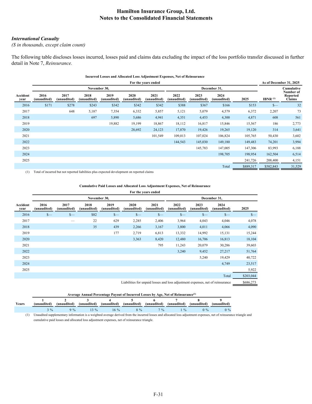 International Casualty ($ in thousands, except claim count) The following table discloses losses incurred, losses paid and claims data excluding the impact of the loss portfolio transfer discussed in further detail in Note 7, Reinsurance. Incurred Losses and Allocated Loss Adjustment Expenses, Net of Reinsurance For the years ended As of December 31, 2025 November 30, December 31, IBNR (1) Cumulative Number of Reported Claims Accident year 2016 (unaudited) 2017 (unaudited) 2018 (unaudited) 2019 (unaudited) 2020 (unaudited) 2021 (unaudited) 2022 (unaudited) 2023 (unaudited) 2024 (unaudited) 2025 2016 $171 $278 $243 $342 $342 $342 $388 $367 $166 $153 $— 32 2017 648 5,187 7,354 6,332 5,857 5,121 5,079 4,579 6,372 2,207 73 2018 697 5,890 5,686 4,941 4,351 4,453 4,300 4,871 608 561 2019 19,882 19,199 18,867 18,112 16,817 15,846 15,567 186 2,773 2020 28,692 24,123 17,870 19,426 19,265 19,120 314 3,641 2021 101,549 109,013 107,024 106,824 105,765 50,430 3,602 2022 144,543 145,030 149,180 149,483 74,201 3,994 2023 145,783 147,005 147,306 83,993 6,188 2024 198,705 198,954 162,504 6,514 2025 241,726 208,400 4,151 Total $889,317 $582,843 31,529 (1) Total of incurred but not reported liabilities plus expected development on reported claims Cumulative Paid Losses and Allocated Loss Adjustment Expenses, Net of Reinsurance For the years ended November 30, December 31, Accident year 2016 (unaudited) 2017 (unaudited) 2018 (unaudited) 2019 (unaudited) 2020 (unaudited) 2021 (unaudited) 2022 (unaudited) 2023 (unaudited) 2024 (unaudited) 2025 2016 $— $— $82 $— $— $— $— $— $— $— 2017 — 22 629 2,285 2,406 3,964 4,043 4,046 4,078 2018 35 439 2,266 3,167 3,800 4,011 4,066 4,090 2019 177 2,719 6,813 13,332 14,992 15,131 15,244 2020 3,363 8,420 12,480 16,706 16,813 18,104 2021 795 11,243 20,079 30,286 39,603 2022 3,240 9,452 27,217 51,764 2023 5,240 19,429 40,722 2024 4,749 23,517 2025 5,922 Total $203,044 Liabilities for unpaid losses and loss adjustment expenses, net of reinsurance $686,273 Average Annual Percentage Payout of Incurred Losses by Age, Net of Reinsurance(1) Years 1 (unaudited) 2 (unaudited) 3 (unaudited) 4 (unaudited) 5 (unaudited) 6 (unaudited) 7 (unaudited) 8 (unaudited) 9 (unaudited) 3 % 9 % 13 % 16 % 8 % 7 % 1 % 0 % 0 % (1) Unaudited supplementary information is a weighted average derived from the incurred losses and allocated loss adjustment expenses, net of reinsurance triangle and cumulative paid losses and allocated loss adjustment expenses, net of reinsurance triangle. Hamilton Insurance Group, Ltd. Notes to the Consolidated Financial Statements F-31