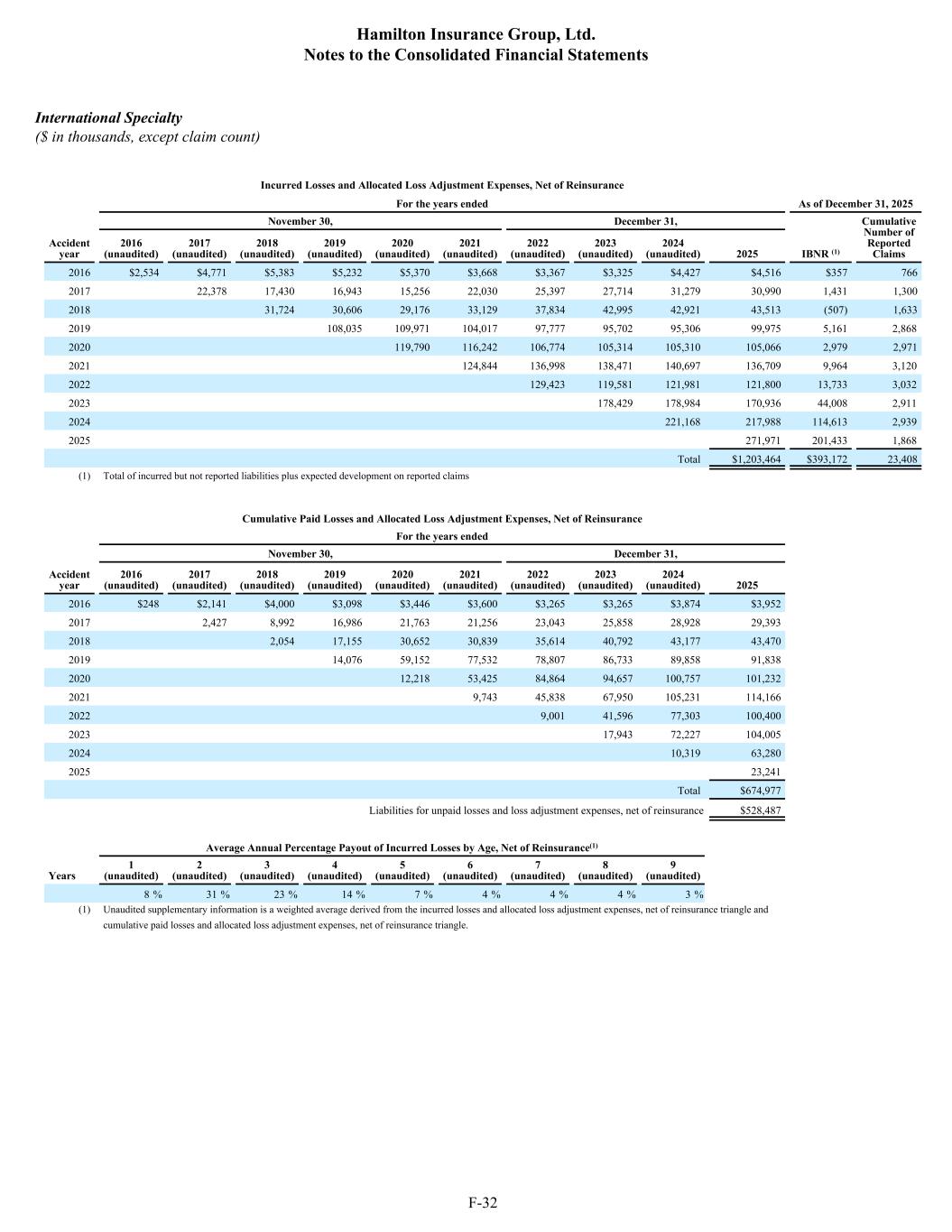 International Specialty ($ in thousands, except claim count) Incurred Losses and Allocated Loss Adjustment Expenses, Net of Reinsurance For the years ended As of December 31, 2025 November 30, December 31, IBNR (1) Cumulative Number of Reported Claims Accident year 2016 (unaudited) 2017 (unaudited) 2018 (unaudited) 2019 (unaudited) 2020 (unaudited) 2021 (unaudited) 2022 (unaudited) 2023 (unaudited) 2024 (unaudited) 2025 2016 $2,534 $4,771 $5,383 $5,232 $5,370 $3,668 $3,367 $3,325 $4,427 $4,516 $357 766 2017 22,378 17,430 16,943 15,256 22,030 25,397 27,714 31,279 30,990 1,431 1,300 2018 31,724 30,606 29,176 33,129 37,834 42,995 42,921 43,513 (507) 1,633 2019 108,035 109,971 104,017 97,777 95,702 95,306 99,975 5,161 2,868 2020 119,790 116,242 106,774 105,314 105,310 105,066 2,979 2,971 2021 124,844 136,998 138,471 140,697 136,709 9,964 3,120 2022 129,423 119,581 121,981 121,800 13,733 3,032 2023 178,429 178,984 170,936 44,008 2,911 2024 221,168 217,988 114,613 2,939 2025 271,971 201,433 1,868 Total $1,203,464 $393,172 23,408 (1) Total of incurred but not reported liabilities plus expected development on reported claims Cumulative Paid Losses and Allocated Loss Adjustment Expenses, Net of Reinsurance For the years ended November 30, December 31, Accident year 2016 (unaudited) 2017 (unaudited) 2018 (unaudited) 2019 (unaudited) 2020 (unaudited) 2021 (unaudited) 2022 (unaudited) 2023 (unaudited) 2024 (unaudited) 2025 2016 $248 $2,141 $4,000 $3,098 $3,446 $3,600 $3,265 $3,265 $3,874 $3,952 2017 2,427 8,992 16,986 21,763 21,256 23,043 25,858 28,928 29,393 2018 2,054 17,155 30,652 30,839 35,614 40,792 43,177 43,470 2019 14,076 59,152 77,532 78,807 86,733 89,858 91,838 2020 12,218 53,425 84,864 94,657 100,757 101,232 2021 9,743 45,838 67,950 105,231 114,166 2022 9,001 41,596 77,303 100,400 2023 17,943 72,227 104,005 2024 10,319 63,280 2025 23,241 Total $674,977 Liabilities for unpaid losses and loss adjustment expenses, net of reinsurance $528,487 Average Annual Percentage Payout of Incurred Losses by Age, Net of Reinsurance(1) Years 1 (unaudited) 2 (unaudited) 3 (unaudited) 4 (unaudited) 5 (unaudited) 6 (unaudited) 7 (unaudited) 8 (unaudited) 9 (unaudited) 8 % 31 % 23 % 14 % 7 % 4 % 4 % 4 % 3 % (1) Unaudited supplementary information is a weighted average derived from the incurred losses and allocated loss adjustment expenses, net of reinsurance triangle and cumulative paid losses and allocated loss adjustment expenses, net of reinsurance triangle. Hamilton Insurance Group, Ltd. Notes to the Consolidated Financial Statements F-32