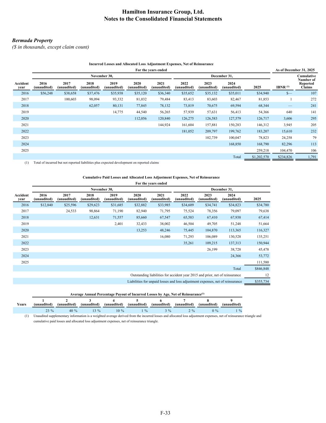 Bermuda Property ($ in thousands, except claim count) Incurred Losses and Allocated Loss Adjustment Expenses, Net of Reinsurance For the years ended As of December 31, 2025 November 30, December 31, IBNR (1) Cumulative Number of Reported Claims Accident year 2016 (unaudited) 2017 (unaudited) 2018 (unaudited) 2019 (unaudited) 2020 (unaudited) 2021 (unaudited) 2022 (unaudited) 2023 (unaudited) 2024 (unaudited) 2025 2016 $56,248 $38,658 $37,476 $35,938 $35,120 $36,340 $35,652 $35,132 $35,011 $34,940 $— 107 2017 100,603 98,094 93,332 81,032 79,484 83,413 83,603 82,467 81,853 1 272 2018 62,057 80,131 77,845 78,132 73,819 70,675 69,594 68,344 — 241 2019 14,775 44,540 56,265 57,939 57,631 56,413 54,366 640 141 2020 112,056 120,840 126,275 126,583 127,579 126,717 3,606 295 2021 144,924 161,604 157,881 150,283 146,312 3,945 205 2022 181,052 209,797 199,762 183,207 15,610 232 2023 102,739 100,047 78,823 24,258 79 2024 168,850 168,790 82,296 113 2025 259,218 104,470 106 Total $1,202,570 $234,826 1,791 (1) Total of incurred but not reported liabilities plus expected development on reported claims Cumulative Paid Losses and Allocated Loss Adjustment Expenses, Net of Reinsurance For the years ended November 30, December 31, Accident year 2016 (unaudited) 2017 (unaudited) 2018 (unaudited) 2019 (unaudited) 2020 (unaudited) 2021 (unaudited) 2022 (unaudited) 2023 (unaudited) 2024 (unaudited) 2025 2016 $12,840 $25,596 $29,623 $31,685 $32,882 $33,985 $34,609 $34,741 $34,823 $34,780 2017 24,533 90,864 71,190 82,940 71,795 75,524 78,356 79,097 79,638 2018 12,631 71,557 85,660 67,547 65,583 67,410 67,938 67,414 2019 2,401 32,433 38,002 46,504 49,705 51,248 51,664 2020 13,253 48,246 75,445 104,870 113,365 116,327 2021 16,080 71,293 106,089 130,528 135,251 2022 35,261 109,215 137,313 150,944 2023 26,199 38,728 45,478 2024 24,366 53,772 2025 111,580 Total $846,848 Outstanding liabilities for accident year 2015 and prior, net of reinsurance 12 Liabilities for unpaid losses and loss adjustment expenses, net of reinsurance $355,734 Average Annual Percentage Payout of Incurred Losses by Age, Net of Reinsurance(1) Years 1 (unaudited) 2 (unaudited) 3 (unaudited) 4 (unaudited) 5 (unaudited) 6 (unaudited) 7 (unaudited) 8 (unaudited) 9 (unaudited) 23 % 40 % 13 % 10 % 1 % 3 % 2 % 0 % 1 % (1) Unaudited supplementary information is a weighted average derived from the incurred losses and allocated loss adjustment expenses, net of reinsurance triangle and cumulative paid losses and allocated loss adjustment expenses, net of reinsurance triangle. Hamilton Insurance Group, Ltd. Notes to the Consolidated Financial Statements F-33