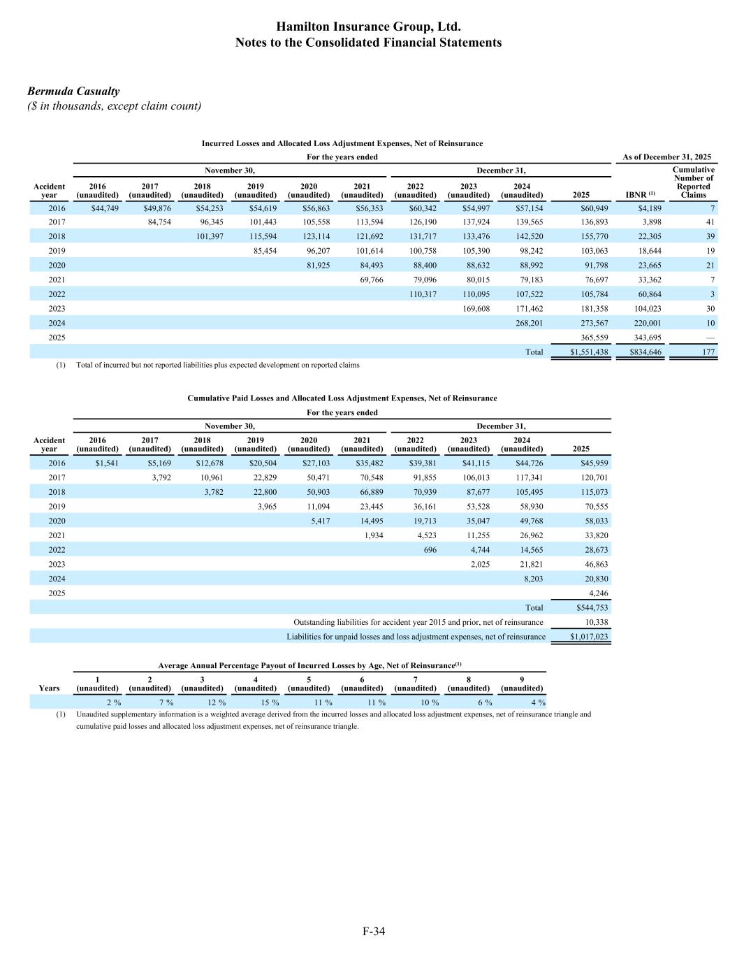 Bermuda Casualty ($ in thousands, except claim count) Incurred Losses and Allocated Loss Adjustment Expenses, Net of Reinsurance For the years ended As of December 31, 2025 November 30, December 31, IBNR (1) Cumulative Number of Reported Claims Accident year 2016 (unaudited) 2017 (unaudited) 2018 (unaudited) 2019 (unaudited) 2020 (unaudited) 2021 (unaudited) 2022 (unaudited) 2023 (unaudited) 2024 (unaudited) 2025 2016 $44,749 $49,876 $54,253 $54,619 $56,863 $56,353 $60,342 $54,997 $57,154 $60,949 $4,189 7 2017 84,754 96,345 101,443 105,558 113,594 126,190 137,924 139,565 136,893 3,898 41 2018 101,397 115,594 123,114 121,692 131,717 133,476 142,520 155,770 22,305 39 2019 85,454 96,207 101,614 100,758 105,390 98,242 103,063 18,644 19 2020 81,925 84,493 88,400 88,632 88,992 91,798 23,665 21 2021 69,766 79,096 80,015 79,183 76,697 33,362 7 2022 110,317 110,095 107,522 105,784 60,864 3 2023 169,608 171,462 181,358 104,023 30 2024 268,201 273,567 220,001 10 2025 365,559 343,695 — Total $1,551,438 $834,646 177 (1) Total of incurred but not reported liabilities plus expected development on reported claims Cumulative Paid Losses and Allocated Loss Adjustment Expenses, Net of Reinsurance For the years ended November 30, December 31, Accident year 2016 (unaudited) 2017 (unaudited) 2018 (unaudited) 2019 (unaudited) 2020 (unaudited) 2021 (unaudited) 2022 (unaudited) 2023 (unaudited) 2024 (unaudited) 2025 2016 $1,541 $5,169 $12,678 $20,504 $27,103 $35,482 $39,381 $41,115 $44,726 $45,959 2017 3,792 10,961 22,829 50,471 70,548 91,855 106,013 117,341 120,701 2018 3,782 22,800 50,903 66,889 70,939 87,677 105,495 115,073 2019 3,965 11,094 23,445 36,161 53,528 58,930 70,555 2020 5,417 14,495 19,713 35,047 49,768 58,033 2021 1,934 4,523 11,255 26,962 33,820 2022 696 4,744 14,565 28,673 2023 2,025 21,821 46,863 2024 8,203 20,830 2025 4,246 Total $544,753 Outstanding liabilities for accident year 2015 and prior, net of reinsurance 10,338 Liabilities for unpaid losses and loss adjustment expenses, net of reinsurance $1,017,023 Average Annual Percentage Payout of Incurred Losses by Age, Net of Reinsurance(1) Years 1 (unaudited) 2 (unaudited) 3 (unaudited) 4 (unaudited) 5 (unaudited) 6 (unaudited) 7 (unaudited) 8 (unaudited) 9 (unaudited) 2 % 7 % 12 % 15 % 11 % 11 % 10 % 6 % 4 % (1) Unaudited supplementary information is a weighted average derived from the incurred losses and allocated loss adjustment expenses, net of reinsurance triangle and cumulative paid losses and allocated loss adjustment expenses, net of reinsurance triangle. Hamilton Insurance Group, Ltd. Notes to the Consolidated Financial Statements F-34
