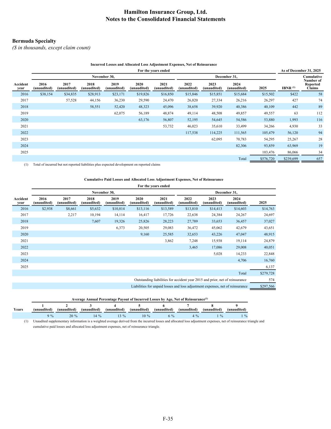 Bermuda Specialty ($ in thousands, except claim count) Incurred Losses and Allocated Loss Adjustment Expenses, Net of Reinsurance For the years ended As of December 31, 2025 November 30, December 31, IBNR (1) Cumulative Number of Reported Claims Accident year 2016 (unaudited) 2017 (unaudited) 2018 (unaudited) 2019 (unaudited) 2020 (unaudited) 2021 (unaudited) 2022 (unaudited) 2023 (unaudited) 2024 (unaudited) 2025 2016 $38,154 $34,835 $28,913 $23,171 $19,826 $16,850 $15,846 $15,851 $15,684 $15,502 $422 58 2017 57,528 44,156 36,230 29,590 24,470 26,820 27,334 26,216 26,297 427 74 2018 58,551 52,420 48,323 45,096 38,658 39,920 40,386 40,109 442 89 2019 62,075 56,189 48,874 49,114 48,508 49,857 49,557 63 112 2020 63,176 56,807 52,195 54,645 54,586 53,880 1,993 116 2021 53,732 46,023 35,610 33,499 34,266 4,930 33 2022 117,538 114,225 111,565 105,479 56,120 94 2023 62,095 70,783 54,295 25,267 28 2024 82,306 93,859 63,969 19 2025 103,476 86,066 34 Total $576,720 $239,699 657 (1) Total of incurred but not reported liabilities plus expected development on reported claims Cumulative Paid Losses and Allocated Loss Adjustment Expenses, Net of Reinsurance For the years ended November 30, December 31, Accident year 2016 (unaudited) 2017 (unaudited) 2018 (unaudited) 2019 (unaudited) 2020 (unaudited) 2021 (unaudited) 2022 (unaudited) 2023 (unaudited) 2024 (unaudited) 2025 2016 $2,938 $8,661 $5,632 $10,814 $13,116 $13,589 $13,810 $14,413 $14,603 $14,763 2017 2,217 10,194 14,114 16,417 17,726 22,638 24,384 24,267 24,697 2018 7,607 19,326 25,826 28,223 27,789 33,653 36,457 37,027 2019 6,373 20,505 29,083 36,472 45,062 42,679 43,651 2020 9,160 25,585 32,653 43,226 47,047 48,915 2021 3,862 7,248 15,938 19,114 24,879 2022 3,465 17,086 29,008 40,051 2023 5,028 14,233 22,848 2024 4,706 16,760 2025 6,137 Total $279,728 Outstanding liabilities for accident year 2015 and prior, net of reinsurance 574 Liabilities for unpaid losses and loss adjustment expenses, net of reinsurance $297,566 Average Annual Percentage Payout of Incurred Losses by Age, Net of Reinsurance(1) Years 1 (unaudited) 2 (unaudited) 3 (unaudited) 4 (unaudited) 5 (unaudited) 6 (unaudited) 7 (unaudited) 8 (unaudited) 9 (unaudited) 9 % 20 % 14 % 13 % 10 % 6 % 4 % 1 % 1 % (1) Unaudited supplementary information is a weighted average derived from the incurred losses and allocated loss adjustment expenses, net of reinsurance triangle and cumulative paid losses and allocated loss adjustment expenses, net of reinsurance triangle. Hamilton Insurance Group, Ltd. Notes to the Consolidated Financial Statements F-35