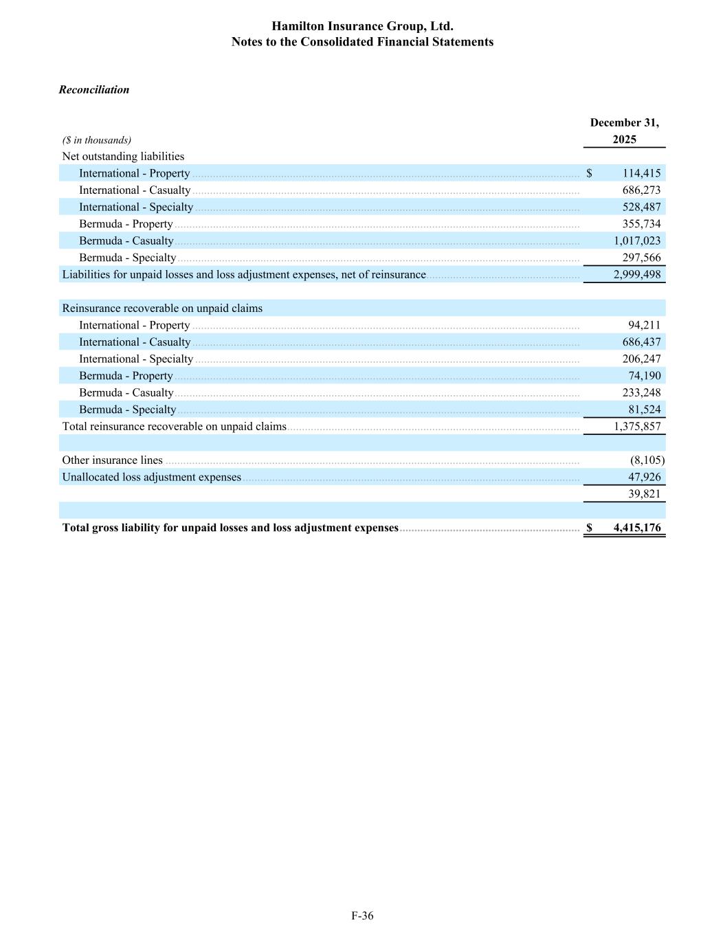 Reconciliation December 31, ($ in thousands) 2025 Net outstanding liabilities International - Property ................................................................................................................................... $ 114,415 International - Casualty ................................................................................................................................... 686,273 International - Specialty .................................................................................................................................. 528,487 Bermuda - Property ......................................................................................................................................... 355,734 Bermuda - Casualty ......................................................................................................................................... 1,017,023 Bermuda - Specialty ........................................................................................................................................ 297,566 Liabilities for unpaid losses and loss adjustment expenses, net of reinsurance .................................................... 2,999,498 Reinsurance recoverable on unpaid claims International - Property ................................................................................................................................... 94,211 International - Casualty ................................................................................................................................... 686,437 International - Specialty .................................................................................................................................. 206,247 Bermuda - Property ......................................................................................................................................... 74,190 Bermuda - Casualty ......................................................................................................................................... 233,248 Bermuda - Specialty ........................................................................................................................................ 81,524 Total reinsurance recoverable on unpaid claims ................................................................................................... 1,375,857 Other insurance lines ............................................................................................................................................ (8,105) Unallocated loss adjustment expenses .................................................................................................................. 47,926 39,821 Total gross liability for unpaid losses and loss adjustment expenses ............................................................. $ 4,415,176 Hamilton Insurance Group, Ltd. Notes to the Consolidated Financial Statements F-36