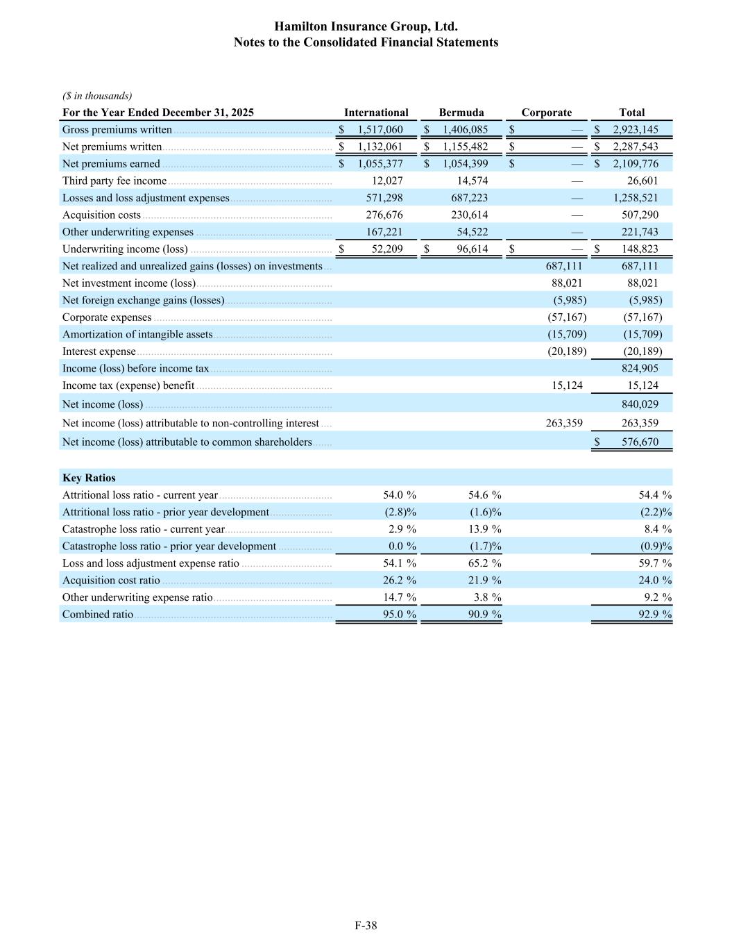 ($ in thousands) For the Year Ended December 31, 2025 International Bermuda Corporate Total Gross premiums written ........................................................ $ 1,517,060 $ 1,406,085 $ — $ 2,923,145 Net premiums written ............................................................ $ 1,132,061 $ 1,155,482 $ — $ 2,287,543 Net premiums earned ............................................................ $ 1,055,377 $ 1,054,399 $ — $ 2,109,776 Third party fee income .......................................................... 12,027 14,574 — 26,601 Losses and loss adjustment expenses .................................... 571,298 687,223 — 1,258,521 Acquisition costs ................................................................... 276,676 230,614 — 507,290 Other underwriting expenses ................................................ 167,221 54,522 — 221,743 Underwriting income (loss) .................................................. $ 52,209 $ 96,614 $ — $ 148,823 Net realized and unrealized gains (losses) on investments ... 687,111 687,111 Net investment income (loss) ................................................ 88,021 88,021 Net foreign exchange gains (losses) ...................................... (5,985) (5,985) Corporate expenses ............................................................... (57,167) (57,167) Amortization of intangible assets .......................................... (15,709) (15,709) Interest expense ..................................................................... (20,189) (20,189) Income (loss) before income tax ........................................... 824,905 Income tax (expense) benefit ................................................ 15,124 15,124 Net income (loss) .................................................................. 840,029 Net income (loss) attributable to non-controlling interest .... 263,359 263,359 Net income (loss) attributable to common shareholders ....... $ 576,670 Key Ratios Attritional loss ratio - current year ........................................ 54.0 % 54.6 % 54.4 % Attritional loss ratio - prior year development ...................... (2.8) % (1.6) % (2.2) % Catastrophe loss ratio - current year ...................................... 2.9 % 13.9 % 8.4 % Catastrophe loss ratio - prior year development ................... 0.0 % (1.7) % (0.9) % Loss and loss adjustment expense ratio ................................ 54.1 % 65.2 % 59.7 % Acquisition cost ratio ............................................................ 26.2 % 21.9 % 24.0 % Other underwriting expense ratio .......................................... 14.7 % 3.8 % 9.2 % Combined ratio ...................................................................... 95.0 % 90.9 % 92.9 % Hamilton Insurance Group, Ltd. Notes to the Consolidated Financial Statements F-38