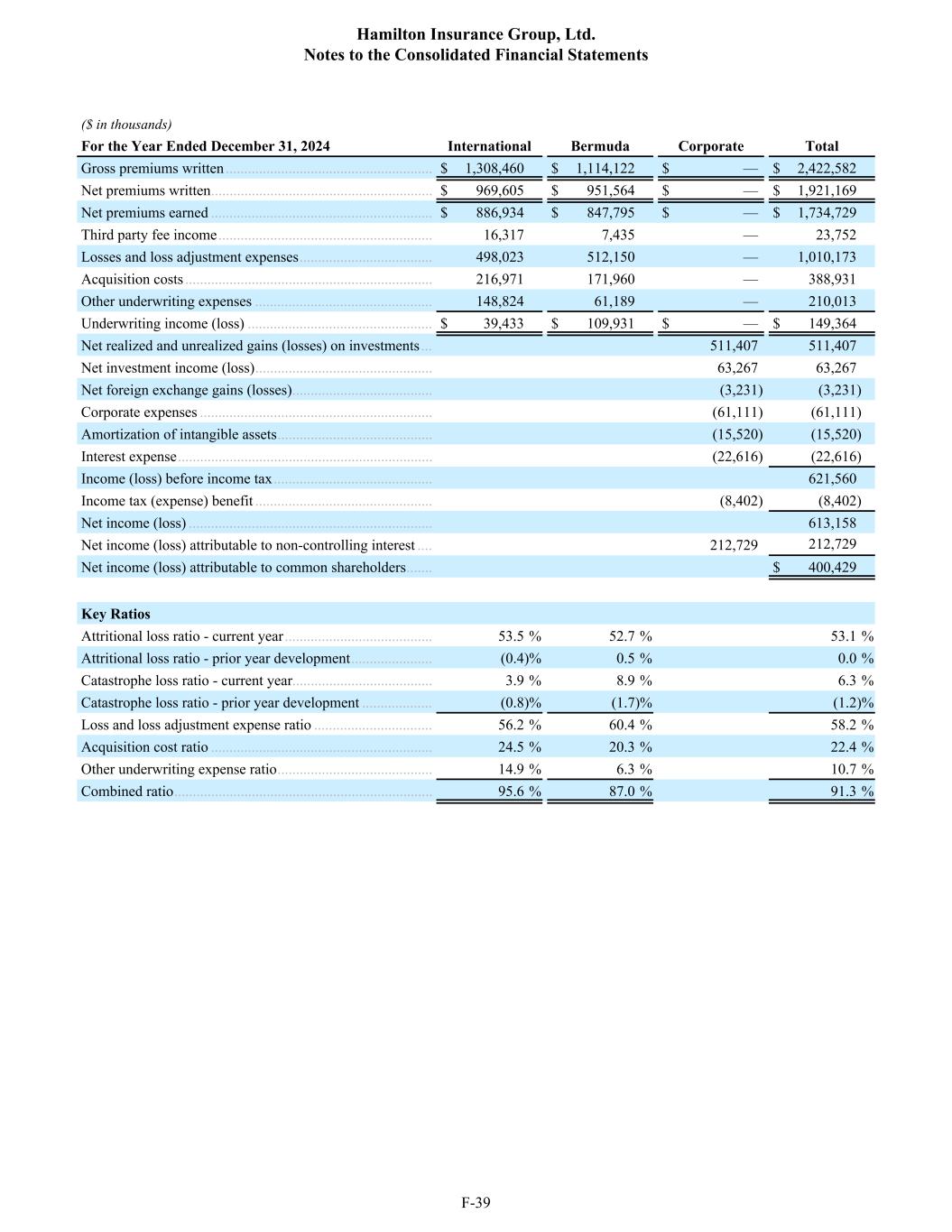 ($ in thousands) For the Year Ended December 31, 2024 International Bermuda Corporate Total Gross premiums written ........................................................ $ 1,308,460 $ 1,114,122 $ — $ 2,422,582 Net premiums written ............................................................ $ 969,605 $ 951,564 $ — $ 1,921,169 Net premiums earned ............................................................ $ 886,934 $ 847,795 $ — $ 1,734,729 Third party fee income .......................................................... 16,317 7,435 — 23,752 Losses and loss adjustment expenses .................................... 498,023 512,150 — 1,010,173 Acquisition costs ................................................................... 216,971 171,960 — 388,931 Other underwriting expenses ................................................ 148,824 61,189 — 210,013 Underwriting income (loss) .................................................. $ 39,433 $ 109,931 $ — $ 149,364 Net realized and unrealized gains (losses) on investments ... 511,407 511,407 Net investment income (loss) ................................................ 63,267 63,267 Net foreign exchange gains (losses) ...................................... (3,231) (3,231) Corporate expenses ............................................................... (61,111) (61,111) Amortization of intangible assets .......................................... (15,520) (15,520) Interest expense ..................................................................... (22,616) (22,616) Income (loss) before income tax ........................................... 621,560 Income tax (expense) benefit ................................................ (8,402) (8,402) Net income (loss) .................................................................. 613,158 Net income (loss) attributable to non-controlling interest .... 212,729 212,729 Net income (loss) attributable to common shareholders ....... $ 400,429 Key Ratios Attritional loss ratio - current year ........................................ 53.5 % 52.7 % 53.1 % Attritional loss ratio - prior year development ...................... (0.4) % 0.5 % 0.0 % Catastrophe loss ratio - current year ...................................... 3.9 % 8.9 % 6.3 % Catastrophe loss ratio - prior year development ................... (0.8) % (1.7) % (1.2) % Loss and loss adjustment expense ratio ................................ 56.2 % 60.4 % 58.2 % Acquisition cost ratio ............................................................ 24.5 % 20.3 % 22.4 % Other underwriting expense ratio .......................................... 14.9 % 6.3 % 10.7 % Combined ratio ...................................................................... 95.6 % 87.0 % 91.3 % Hamilton Insurance Group, Ltd. Notes to the Consolidated Financial Statements F-39