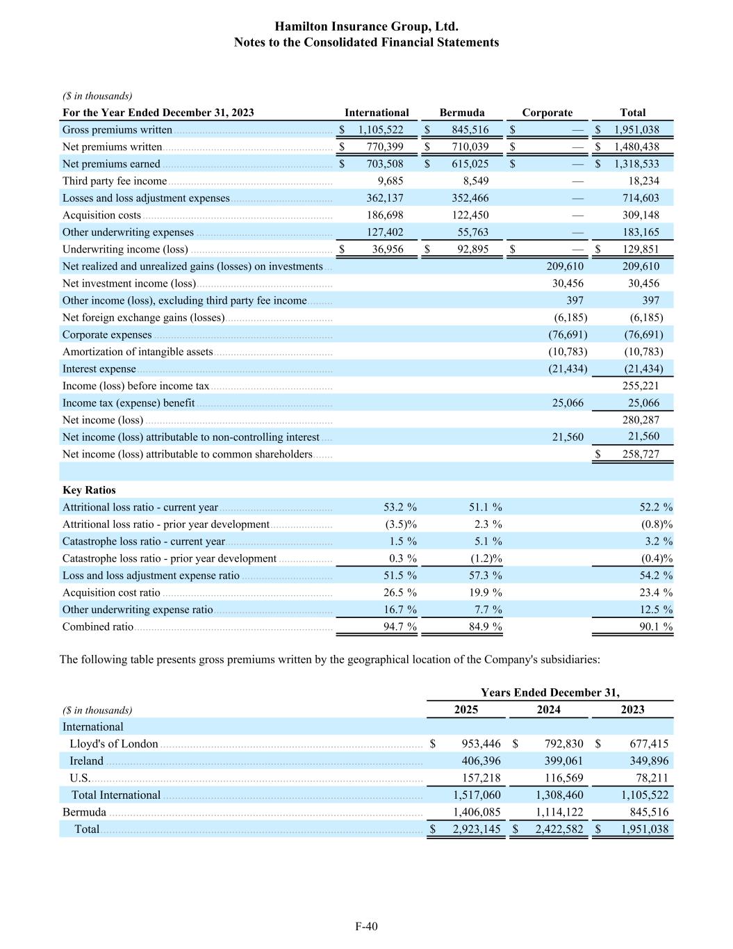 ($ in thousands) For the Year Ended December 31, 2023 International Bermuda Corporate Total Gross premiums written ........................................................ $ 1,105,522 $ 845,516 $ — $ 1,951,038 Net premiums written ............................................................ $ 770,399 $ 710,039 $ — $ 1,480,438 Net premiums earned ............................................................ $ 703,508 $ 615,025 $ — $ 1,318,533 Third party fee income .......................................................... 9,685 8,549 — 18,234 Losses and loss adjustment expenses .................................... 362,137 352,466 — 714,603 Acquisition costs ................................................................... 186,698 122,450 — 309,148 Other underwriting expenses ................................................ 127,402 55,763 — 183,165 Underwriting income (loss) .................................................. $ 36,956 $ 92,895 $ — $ 129,851 Net realized and unrealized gains (losses) on investments ... 209,610 209,610 Net investment income (loss) ................................................ 30,456 30,456 Other income (loss), excluding third party fee income ......... 397 397 Net foreign exchange gains (losses) ...................................... (6,185) (6,185) Corporate expenses ............................................................... (76,691) (76,691) Amortization of intangible assets .......................................... (10,783) (10,783) Interest expense ..................................................................... (21,434) (21,434) Income (loss) before income tax ........................................... 255,221 Income tax (expense) benefit ................................................ 25,066 25,066 Net income (loss) .................................................................. 280,287 Net income (loss) attributable to non-controlling interest .... 21,560 21,560 Net income (loss) attributable to common shareholders ....... $ 258,727 Key Ratios Attritional loss ratio - current year ........................................ 53.2 % 51.1 % 52.2 % Attritional loss ratio - prior year development ...................... (3.5) % 2.3 % (0.8) % Catastrophe loss ratio - current year ...................................... 1.5 % 5.1 % 3.2 % Catastrophe loss ratio - prior year development ................... 0.3 % (1.2) % (0.4) % Loss and loss adjustment expense ratio ................................ 51.5 % 57.3 % 54.2 % Acquisition cost ratio ............................................................ 26.5 % 19.9 % 23.4 % Other underwriting expense ratio .......................................... 16.7 % 7.7 % 12.5 % Combined ratio ...................................................................... 94.7 % 84.9 % 90.1 % The following table presents gross premiums written by the geographical location of the Company's subsidiaries: Years Ended December 31, ($ in thousands) 2025 2024 2023 International Lloyd's of London ........................................................................................ $ 953,446 $ 792,830 $ 677,415 Ireland .......................................................................................................... 406,396 399,061 349,896 U.S. ............................................................................................................... 157,218 116,569 78,211 Total International ....................................................................................... 1,517,060 1,308,460 1,105,522 Bermuda ......................................................................................................... 1,406,085 1,114,122 845,516 Total ............................................................................................................ $ 2,923,145 $ 2,422,582 $ 1,951,038 Hamilton Insurance Group, Ltd. Notes to the Consolidated Financial Statements F-40