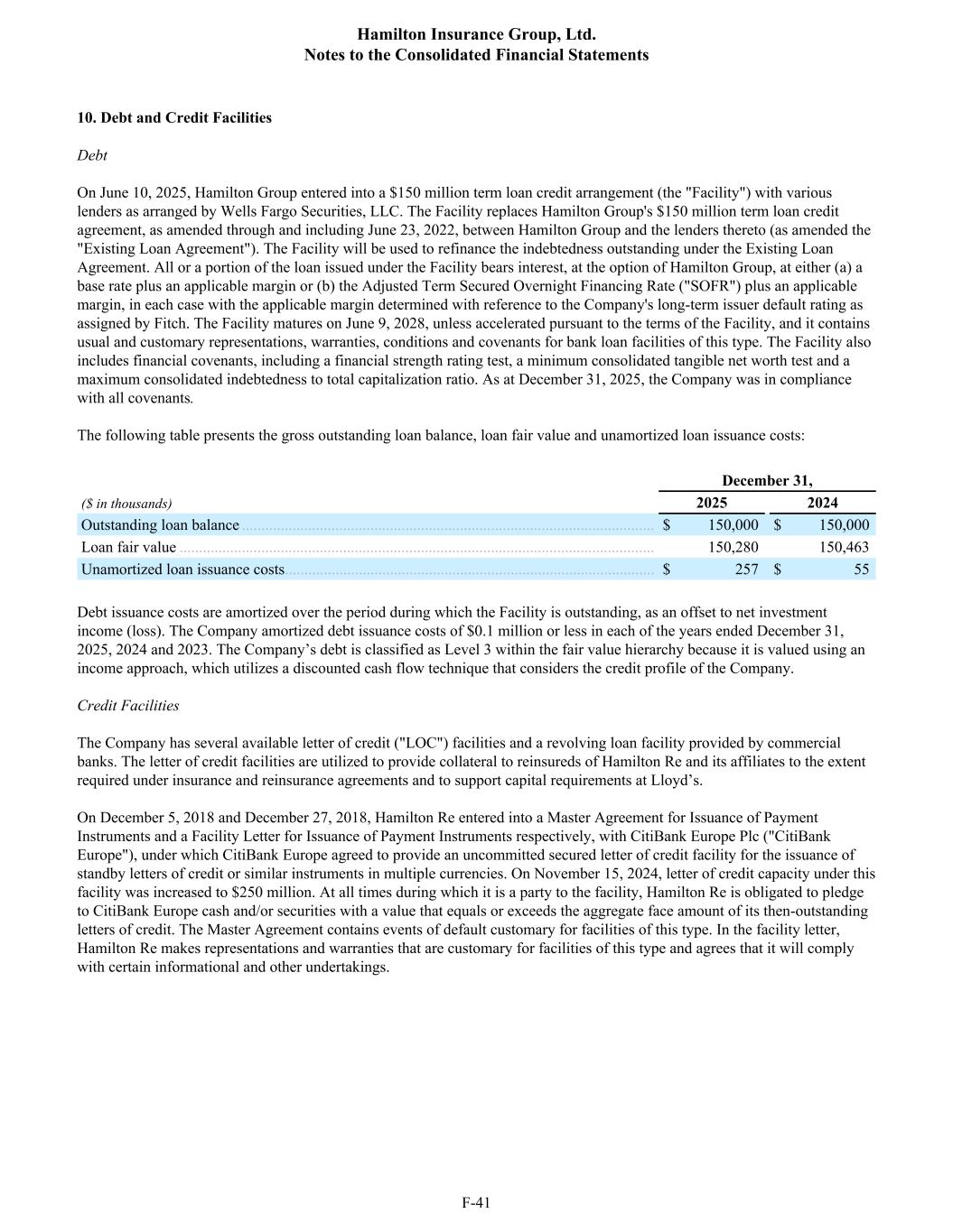 10. Debt and Credit Facilities Debt On June 10, 2025, Hamilton Group entered into a $150 million term loan credit arrangement (the "Facility") with various lenders as arranged by Wells Fargo Securities, LLC. The Facility replaces Hamilton Group's $150 million term loan credit agreement, as amended through and including June 23, 2022, between Hamilton Group and the lenders thereto (as amended the "Existing Loan Agreement"). The Facility will be used to refinance the indebtedness outstanding under the Existing Loan Agreement. All or a portion of the loan issued under the Facility bears interest, at the option of Hamilton Group, at either (a) a base rate plus an applicable margin or (b) the Adjusted Term Secured Overnight Financing Rate ("SOFR") plus an applicable margin, in each case with the applicable margin determined with reference to the Company's long-term issuer default rating as assigned by Fitch. The Facility matures on June 9, 2028, unless accelerated pursuant to the terms of the Facility, and it contains usual and customary representations, warranties, conditions and covenants for bank loan facilities of this type. The Facility also includes financial covenants, including a financial strength rating test, a minimum consolidated tangible net worth test and a maximum consolidated indebtedness to total capitalization ratio. As at December 31, 2025, the Company was in compliance with all covenants. The following table presents the gross outstanding loan balance, loan fair value and unamortized loan issuance costs: December 31, ($ in thousands) 2025 2024 Outstanding loan balance .......................................................................................................... $ 150,000 $ 150,000 Loan fair value .......................................................................................................................... 150,280 150,463 Unamortized loan issuance costs ............................................................................................... $ 257 $ 55 Debt issuance costs are amortized over the period during which the Facility is outstanding, as an offset to net investment income (loss). The Company amortized debt issuance costs of $0.1 million or less in each of the years ended December 31, 2025, 2024 and 2023. The Company’s debt is classified as Level 3 within the fair value hierarchy because it is valued using an income approach, which utilizes a discounted cash flow technique that considers the credit profile of the Company. Credit Facilities The Company has several available letter of credit ("LOC") facilities and a revolving loan facility provided by commercial banks. The letter of credit facilities are utilized to provide collateral to reinsureds of Hamilton Re and its affiliates to the extent required under insurance and reinsurance agreements and to support capital requirements at Lloyd’s. On December 5, 2018 and December 27, 2018, Hamilton Re entered into a Master Agreement for Issuance of Payment Instruments and a Facility Letter for Issuance of Payment Instruments respectively, with CitiBank Europe Plc ("CitiBank Europe"), under which CitiBank Europe agreed to provide an uncommitted secured letter of credit facility for the issuance of standby letters of credit or similar instruments in multiple currencies. On November 15, 2024, letter of credit capacity under this facility was increased to $250 million. At all times during which it is a party to the facility, Hamilton Re is obligated to pledge to CitiBank Europe cash and/or securities with a value that equals or exceeds the aggregate face amount of its then-outstanding letters of credit. The Master Agreement contains events of default customary for facilities of this type. In the facility letter, Hamilton Re makes representations and warranties that are customary for facilities of this type and agrees that it will comply with certain informational and other undertakings. Hamilton Insurance Group, Ltd. Notes to the Consolidated Financial Statements F-41