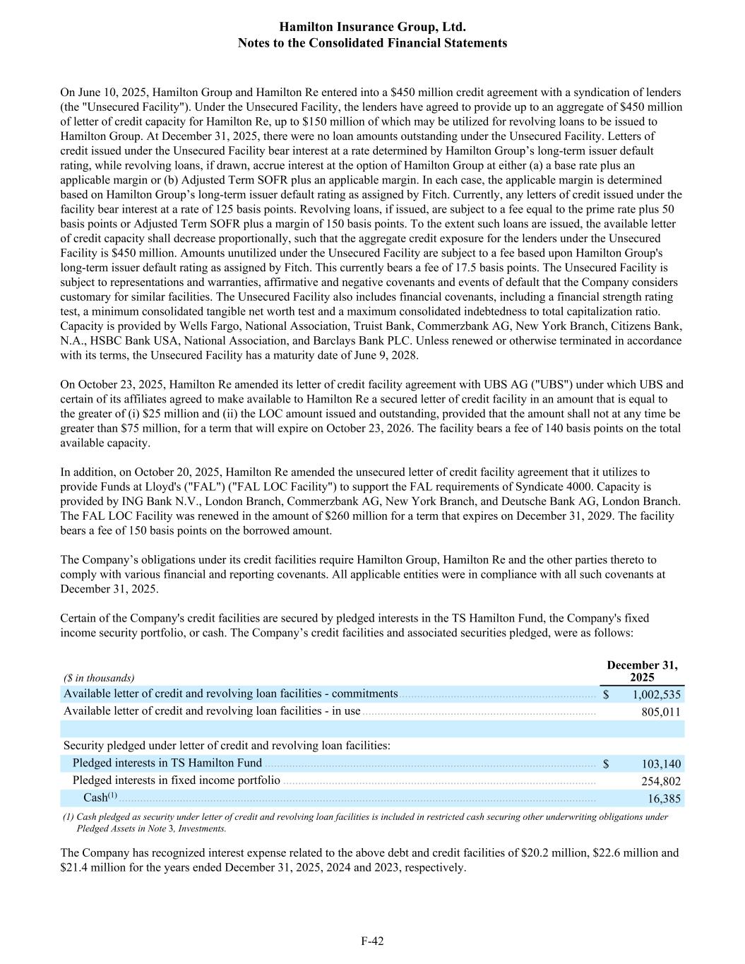 On June 10, 2025, Hamilton Group and Hamilton Re entered into a $450 million credit agreement with a syndication of lenders (the "Unsecured Facility"). Under the Unsecured Facility, the lenders have agreed to provide up to an aggregate of $450 million of letter of credit capacity for Hamilton Re, up to $150 million of which may be utilized for revolving loans to be issued to Hamilton Group. At December 31, 2025, there were no loan amounts outstanding under the Unsecured Facility. Letters of credit issued under the Unsecured Facility bear interest at a rate determined by Hamilton Group’s long-term issuer default rating, while revolving loans, if drawn, accrue interest at the option of Hamilton Group at either (a) a base rate plus an applicable margin or (b) Adjusted Term SOFR plus an applicable margin. In each case, the applicable margin is determined based on Hamilton Group’s long-term issuer default rating as assigned by Fitch. Currently, any letters of credit issued under the facility bear interest at a rate of 125 basis points. Revolving loans, if issued, are subject to a fee equal to the prime rate plus 50 basis points or Adjusted Term SOFR plus a margin of 150 basis points. To the extent such loans are issued, the available letter of credit capacity shall decrease proportionally, such that the aggregate credit exposure for the lenders under the Unsecured Facility is $450 million. Amounts unutilized under the Unsecured Facility are subject to a fee based upon Hamilton Group's long-term issuer default rating as assigned by Fitch. This currently bears a fee of 17.5 basis points. The Unsecured Facility is subject to representations and warranties, affirmative and negative covenants and events of default that the Company considers customary for similar facilities. The Unsecured Facility also includes financial covenants, including a financial strength rating test, a minimum consolidated tangible net worth test and a maximum consolidated indebtedness to total capitalization ratio. Capacity is provided by Wells Fargo, National Association, Truist Bank, Commerzbank AG, New York Branch, Citizens Bank, N.A., HSBC Bank USA, National Association, and Barclays Bank PLC. Unless renewed or otherwise terminated in accordance with its terms, the Unsecured Facility has a maturity date of June 9, 2028. On October 23, 2025, Hamilton Re amended its letter of credit facility agreement with UBS AG ("UBS") under which UBS and certain of its affiliates agreed to make available to Hamilton Re a secured letter of credit facility in an amount that is equal to the greater of (i) $25 million and (ii) the LOC amount issued and outstanding, provided that the amount shall not at any time be greater than $75 million, for a term that will expire on October 23, 2026. The facility bears a fee of 140 basis points on the total available capacity. In addition, on October 20, 2025, Hamilton Re amended the unsecured letter of credit facility agreement that it utilizes to provide Funds at Lloyd's ("FAL") ("FAL LOC Facility") to support the FAL requirements of Syndicate 4000. Capacity is provided by ING Bank N.V., London Branch, Commerzbank AG, New York Branch, and Deutsche Bank AG, London Branch. The FAL LOC Facility was renewed in the amount of $260 million for a term that expires on December 31, 2029. The facility bears a fee of 150 basis points on the borrowed amount. The Company’s obligations under its credit facilities require Hamilton Group, Hamilton Re and the other parties thereto to comply with various financial and reporting covenants. All applicable entities were in compliance with all such covenants at December 31, 2025. Certain of the Company's credit facilities are secured by pledged interests in the TS Hamilton Fund, the Company's fixed income security portfolio, or cash. The Company’s credit facilities and associated securities pledged, were as follows: ($ in thousands) December 31, 2025 Available letter of credit and revolving loan facilities - commitments ................................................................. $ 1,002,535 Available letter of credit and revolving loan facilities - in use ............................................................................. 805,011 Security pledged under letter of credit and revolving loan facilities: Pledged interests in TS Hamilton Fund ............................................................................................................. $ 103,140 Pledged interests in fixed income portfolio ....................................................................................................... 254,802 Cash(1) ............................................................................................................................................................. 16,385 (1) Cash pledged as security under letter of credit and revolving loan facilities is included in restricted cash securing other underwriting obligations under Pledged Assets in Note 3, Investments. The Company has recognized interest expense related to the above debt and credit facilities of $20.2 million, $22.6 million and $21.4 million for the years ended December 31, 2025, 2024 and 2023, respectively. Hamilton Insurance Group, Ltd. Notes to the Consolidated Financial Statements F-42