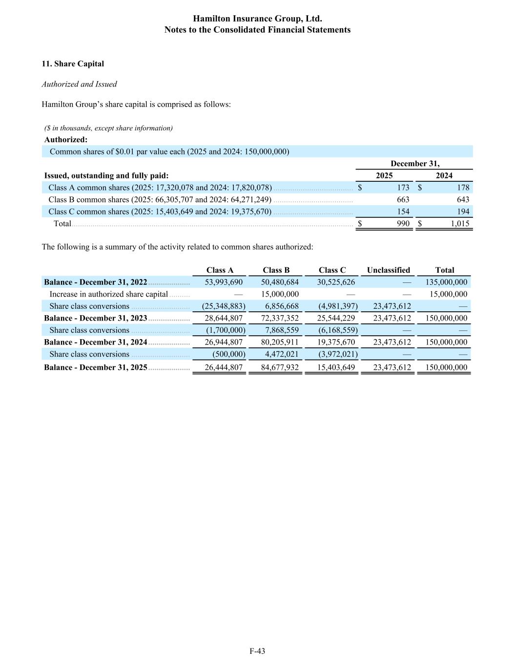 11. Share Capital Authorized and Issued Hamilton Group’s share capital is comprised as follows: ($ in thousands, except share information) Authorized: Common shares of $0.01 par value each (2025 and 2024: 150,000,000) December 31, Issued, outstanding and fully paid: 2025 2024 Class A common shares (2025: 17,320,078 and 2024: 17,820,078) ...................................... $ 173 $ 178 Class B common shares (2025: 66,305,707 and 2024: 64,271,249) ...................................... 663 643 Class C common shares (2025: 15,403,649 and 2024: 19,375,670) ...................................... 154 194 Total ...................................................................................................................................... $ 990 $ 1,015 The following is a summary of the activity related to common shares authorized: Class A Class B Class C Unclassified Total Balance - December 31, 2022 .................... 53,993,690 50,480,684 30,525,626 — 135,000,000 Increase in authorized share capital .......... — 15,000,000 — — 15,000,000 Share class conversions ............................ (25,348,883) 6,856,668 (4,981,397) 23,473,612 — Balance - December 31, 2023 .................... 28,644,807 72,337,352 25,544,229 23,473,612 150,000,000 Share class conversions ............................ (1,700,000) 7,868,559 (6,168,559) — — Balance - December 31, 2024 .................... 26,944,807 80,205,911 19,375,670 23,473,612 150,000,000 Share class conversions ............................ (500,000) 4,472,021 (3,972,021) — — Balance - December 31, 2025 .................... 26,444,807 84,677,932 15,403,649 23,473,612 150,000,000 Hamilton Insurance Group, Ltd. Notes to the Consolidated Financial Statements F-43