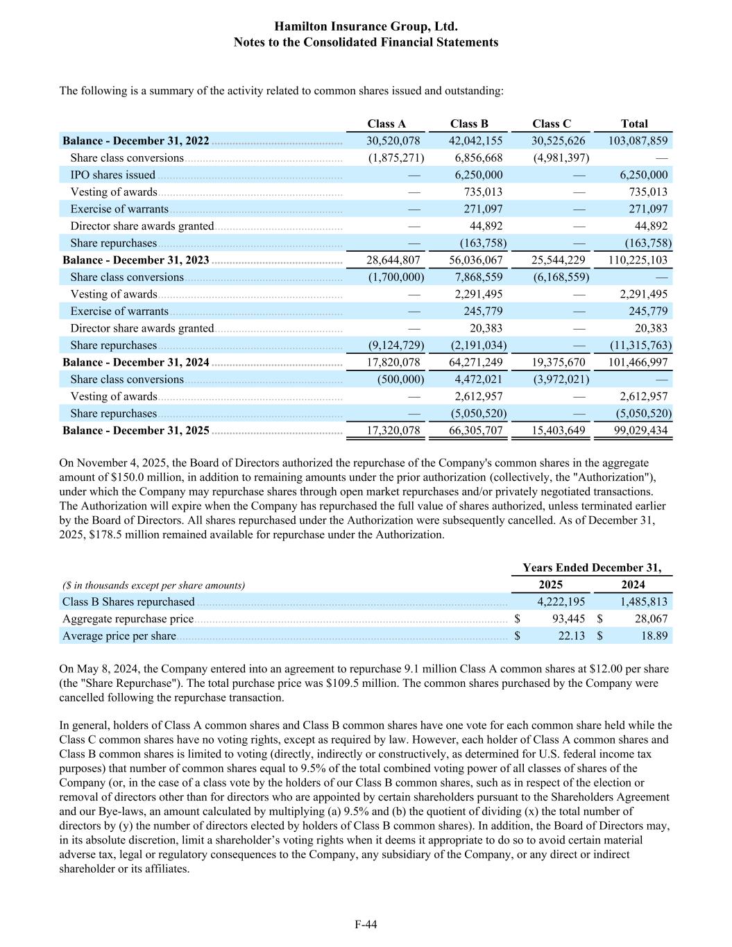 The following is a summary of the activity related to common shares issued and outstanding: Class A Class B Class C Total Balance - December 31, 2022 ............................................ 30,520,078 42,042,155 30,525,626 103,087,859 Share class conversions ..................................................... (1,875,271) 6,856,668 (4,981,397) — IPO shares issued .............................................................. — 6,250,000 — 6,250,000 Vesting of awards .............................................................. — 735,013 — 735,013 Exercise of warrants .......................................................... — 271,097 — 271,097 Director share awards granted ........................................... — 44,892 — 44,892 Share repurchases .............................................................. — (163,758) — (163,758) Balance - December 31, 2023 ............................................ 28,644,807 56,036,067 25,544,229 110,225,103 Share class conversions ..................................................... (1,700,000) 7,868,559 (6,168,559) — Vesting of awards .............................................................. — 2,291,495 — 2,291,495 Exercise of warrants .......................................................... — 245,779 — 245,779 Director share awards granted ........................................... — 20,383 — 20,383 Share repurchases .............................................................. (9,124,729) (2,191,034) — (11,315,763) Balance - December 31, 2024 ............................................ 17,820,078 64,271,249 19,375,670 101,466,997 Share class conversions ..................................................... (500,000) 4,472,021 (3,972,021) — Vesting of awards .............................................................. — 2,612,957 — 2,612,957 Share repurchases .............................................................. — (5,050,520) — (5,050,520) Balance - December 31, 2025 ............................................ 17,320,078 66,305,707 15,403,649 99,029,434 On November 4, 2025, the Board of Directors authorized the repurchase of the Company's common shares in the aggregate amount of $150.0 million, in addition to remaining amounts under the prior authorization (collectively, the "Authorization"), under which the Company may repurchase shares through open market repurchases and/or privately negotiated transactions. The Authorization will expire when the Company has repurchased the full value of shares authorized, unless terminated earlier by the Board of Directors. All shares repurchased under the Authorization were subsequently cancelled. As of December 31, 2025, $178.5 million remained available for repurchase under the Authorization. Years Ended December 31, ($ in thousands except per share amounts) 2025 2024 Class B Shares repurchased ........................................................................................................ 4,222,195 1,485,813 Aggregate repurchase price ......................................................................................................... $ 93,445 $ 28,067 Average price per share ............................................................................................................... $ 22.13 $ 18.89 On May 8, 2024, the Company entered into an agreement to repurchase 9.1 million Class A common shares at $12.00 per share (the "Share Repurchase"). The total purchase price was $109.5 million. The common shares purchased by the Company were cancelled following the repurchase transaction. In general, holders of Class A common shares and Class B common shares have one vote for each common share held while the Class C common shares have no voting rights, except as required by law. However, each holder of Class A common shares and Class B common shares is limited to voting (directly, indirectly or constructively, as determined for U.S. federal income tax purposes) that number of common shares equal to 9.5% of the total combined voting power of all classes of shares of the Company (or, in the case of a class vote by the holders of our Class B common shares, such as in respect of the election or removal of directors other than for directors who are appointed by certain shareholders pursuant to the Shareholders Agreement and our Bye-laws, an amount calculated by multiplying (a) 9.5% and (b) the quotient of dividing (x) the total number of directors by (y) the number of directors elected by holders of Class B common shares). In addition, the Board of Directors may, in its absolute discretion, limit a shareholder’s voting rights when it deems it appropriate to do so to avoid certain material adverse tax, legal or regulatory consequences to the Company, any subsidiary of the Company, or any direct or indirect shareholder or its affiliates. Hamilton Insurance Group, Ltd. Notes to the Consolidated Financial Statements F-44