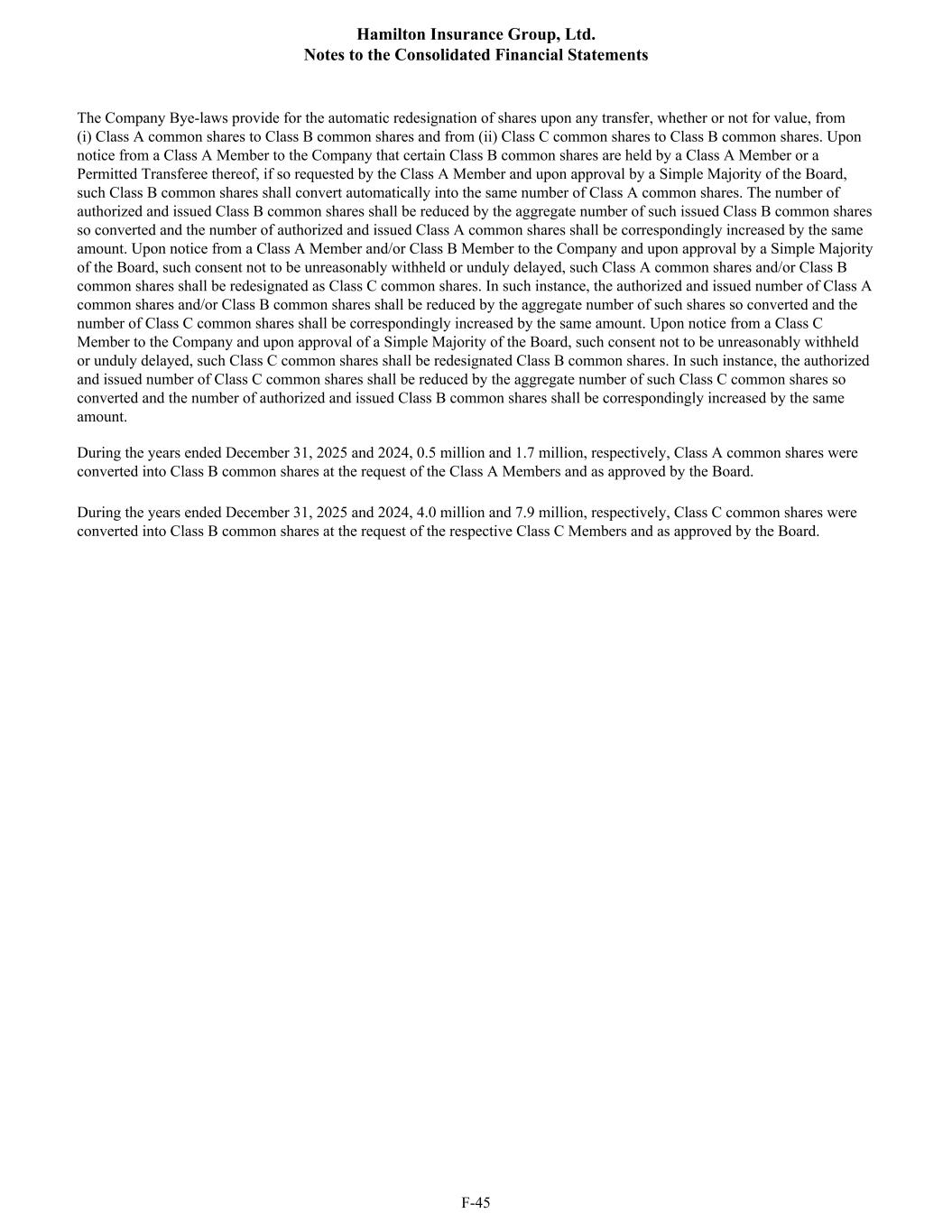 The Company Bye-laws provide for the automatic redesignation of shares upon any transfer, whether or not for value, from (i) Class A common shares to Class B common shares and from (ii) Class C common shares to Class B common shares. Upon notice from a Class A Member to the Company that certain Class B common shares are held by a Class A Member or a Permitted Transferee thereof, if so requested by the Class A Member and upon approval by a Simple Majority of the Board, such Class B common shares shall convert automatically into the same number of Class A common shares. The number of authorized and issued Class B common shares shall be reduced by the aggregate number of such issued Class B common shares so converted and the number of authorized and issued Class A common shares shall be correspondingly increased by the same amount. Upon notice from a Class A Member and/or Class B Member to the Company and upon approval by a Simple Majority of the Board, such consent not to be unreasonably withheld or unduly delayed, such Class A common shares and/or Class B common shares shall be redesignated as Class C common shares. In such instance, the authorized and issued number of Class A common shares and/or Class B common shares shall be reduced by the aggregate number of such shares so converted and the number of Class C common shares shall be correspondingly increased by the same amount. Upon notice from a Class C Member to the Company and upon approval of a Simple Majority of the Board, such consent not to be unreasonably withheld or unduly delayed, such Class C common shares shall be redesignated Class B common shares. In such instance, the authorized and issued number of Class C common shares shall be reduced by the aggregate number of such Class C common shares so converted and the number of authorized and issued Class B common shares shall be correspondingly increased by the same amount. During the years ended December 31, 2025 and 2024, 0.5 million and 1.7 million, respectively, Class A common shares were converted into Class B common shares at the request of the Class A Members and as approved by the Board. During the years ended December 31, 2025 and 2024, 4.0 million and 7.9 million, respectively, Class C common shares were converted into Class B common shares at the request of the respective Class C Members and as approved by the Board. Hamilton Insurance Group, Ltd. Notes to the Consolidated Financial Statements F-45