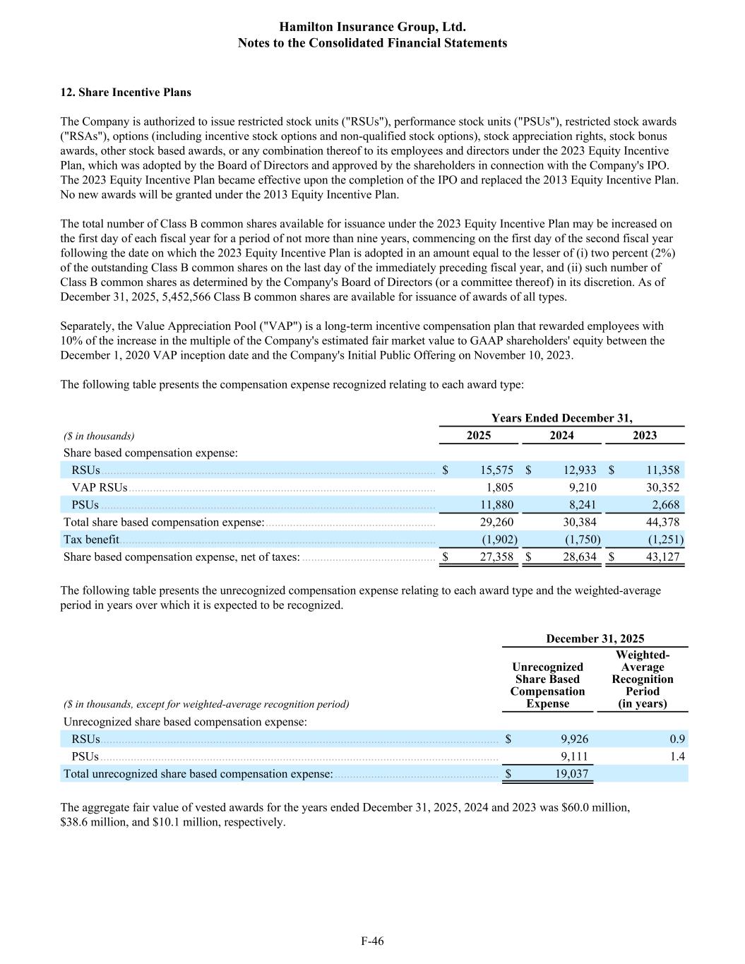 12. Share Incentive Plans The Company is authorized to issue restricted stock units ("RSUs"), performance stock units ("PSUs"), restricted stock awards ("RSAs"), options (including incentive stock options and non-qualified stock options), stock appreciation rights, stock bonus awards, other stock based awards, or any combination thereof to its employees and directors under the 2023 Equity Incentive Plan, which was adopted by the Board of Directors and approved by the shareholders in connection with the Company's IPO. The 2023 Equity Incentive Plan became effective upon the completion of the IPO and replaced the 2013 Equity Incentive Plan. No new awards will be granted under the 2013 Equity Incentive Plan. The total number of Class B common shares available for issuance under the 2023 Equity Incentive Plan may be increased on the first day of each fiscal year for a period of not more than nine years, commencing on the first day of the second fiscal year following the date on which the 2023 Equity Incentive Plan is adopted in an amount equal to the lesser of (i) two percent (2%) of the outstanding Class B common shares on the last day of the immediately preceding fiscal year, and (ii) such number of Class B common shares as determined by the Company's Board of Directors (or a committee thereof) in its discretion. As of December 31, 2025, 5,452,566 Class B common shares are available for issuance of awards of all types. Separately, the Value Appreciation Pool ("VAP") is a long-term incentive compensation plan that rewarded employees with 10% of the increase in the multiple of the Company's estimated fair market value to GAAP shareholders' equity between the December 1, 2020 VAP inception date and the Company's Initial Public Offering on November 10, 2023. The following table presents the compensation expense recognized relating to each award type: Years Ended December 31, ($ in thousands) 2025 2024 2023 Share based compensation expense: RSUs .............................................................................................................. $ 15,575 $ 12,933 $ 11,358 VAP RSUs ..................................................................................................... 1,805 9,210 30,352 PSUs .............................................................................................................. 11,880 8,241 2,668 Total share based compensation expense: ........................................................ 29,260 30,384 44,378 Tax benefit ........................................................................................................ (1,902) (1,750) (1,251) Share based compensation expense, net of taxes: ............................................ $ 27,358 $ 28,634 $ 43,127 The following table presents the unrecognized compensation expense relating to each award type and the weighted-average period in years over which it is expected to be recognized. December 31, 2025 ($ in thousands, except for weighted-average recognition period) Unrecognized Share Based Compensation Expense Weighted- Average Recognition Period (in years) Unrecognized share based compensation expense: RSUs ................................................................................................................................... $ 9,926 0.9 PSUs ................................................................................................................................... 9,111 1.4 Total unrecognized share based compensation expense: ...................................................... $ 19,037 The aggregate fair value of vested awards for the years ended December 31, 2025, 2024 and 2023 was $60.0 million, $38.6 million, and $10.1 million, respectively. Hamilton Insurance Group, Ltd. Notes to the Consolidated Financial Statements F-46