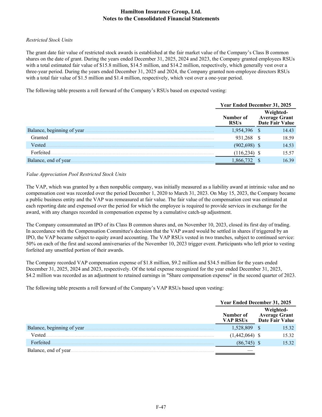 Restricted Stock Units The grant date fair value of restricted stock awards is established at the fair market value of the Company’s Class B common shares on the date of grant. During the years ended December 31, 2025, 2024 and 2023, the Company granted employees RSUs with a total estimated fair value of $15.8 million, $14.5 million, and $14.2 million, respectively, which generally vest over a three-year period. During the years ended December 31, 2025 and 2024, the Company granted non-employee directors RSUs with a total fair value of $1.5 million and $1.4 million, respectively, which vest over a one-year period. The following table presents a roll forward of the Company’s RSUs based on expected vesting: Year Ended December 31, 2025 Number of RSUs Weighted- Average Grant Date Fair Value Balance, beginning of year .................................................................................................. 1,954,396 $ 14.43 Granted .............................................................................................................................. 931,268 $ 18.59 Vested ................................................................................................................................ (902,698) $ 14.53 Forfeited ............................................................................................................................ (116,234) $ 15.57 Balance, end of year ............................................................................................................. 1,866,732 $ 16.39 Value Appreciation Pool Restricted Stock Units The VAP, which was granted by a then nonpublic company, was initially measured as a liability award at intrinsic value and no compensation cost was recorded over the period December 1, 2020 to March 31, 2023. On May 15, 2023, the Company became a public business entity and the VAP was remeasured at fair value. The fair value of the compensation cost was estimated at each reporting date and expensed over the period for which the employee is required to provide services in exchange for the award, with any changes recorded in compensation expense by a cumulative catch-up adjustment. The Company consummated an IPO of its Class B common shares and, on November 10, 2023, closed its first day of trading. In accordance with the Compensation Committee's decision that the VAP award would be settled in shares if triggered by an IPO, the VAP became subject to equity award accounting. The VAP RSUs vested in two tranches, subject to continued service: 50% on each of the first and second anniversaries of the November 10, 2023 trigger event. Participants who left prior to vesting forfeited any unsettled portion of their awards. The Company recorded VAP compensation expense of $1.8 million, $9.2 million and $34.5 million for the years ended December 31, 2025, 2024 and 2023, respectively. Of the total expense recognized for the year ended December 31, 2023, $4.2 million was recorded as an adjustment to retained earnings in "Share compensation expense" in the second quarter of 2023. The following table presents a roll forward of the Company’s VAP RSUs based upon vesting: Year Ended December 31, 2025 Number of VAP RSUs Weighted- Average Grant Date Fair Value Balance, beginning of year .................................................................................................. 1,528,809 $ 15.32 Vested ................................................................................................................................ (1,442,064) $ 15.32 Forfeited ............................................................................................................................ (86,745) $ 15.32 Balance, end of year ............................................................................................................. — Hamilton Insurance Group, Ltd. Notes to the Consolidated Financial Statements F-47
