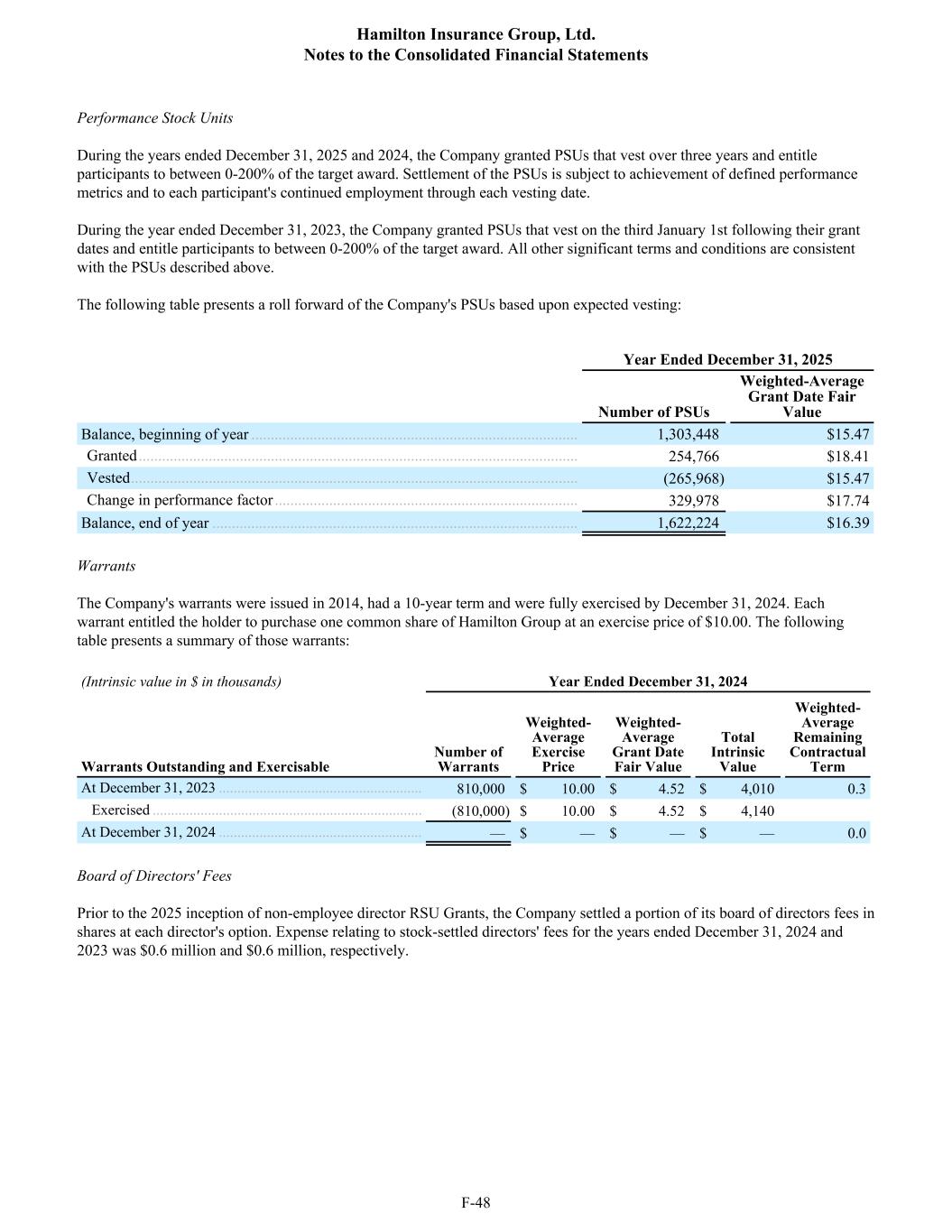 Performance Stock Units During the years ended December 31, 2025 and 2024, the Company granted PSUs that vest over three years and entitle participants to between 0-200% of the target award. Settlement of the PSUs is subject to achievement of defined performance metrics and to each participant's continued employment through each vesting date. During the year ended December 31, 2023, the Company granted PSUs that vest on the third January 1st following their grant dates and entitle participants to between 0-200% of the target award. All other significant terms and conditions are consistent with the PSUs described above. The following table presents a roll forward of the Company's PSUs based upon expected vesting: Year Ended December 31, 2025 Number of PSUs Weighted-Average Grant Date Fair Value Balance, beginning of year .................................................................................... 1,303,448 $15.47 Granted ................................................................................................................. 254,766 $18.41 Vested ................................................................................................................... (265,968) $15.47 Change in performance factor .............................................................................. 329,978 $17.74 Balance, end of year .............................................................................................. 1,622,224 $16.39 Warrants The Company's warrants were issued in 2014, had a 10-year term and were fully exercised by December 31, 2024. Each warrant entitled the holder to purchase one common share of Hamilton Group at an exercise price of $10.00. The following table presents a summary of those warrants: (Intrinsic value in $ in thousands) Year Ended December 31, 2024 Warrants Outstanding and Exercisable Number of Warrants Weighted- Average Exercise Price Weighted- Average Grant Date Fair Value Total Intrinsic Value Weighted- Average Remaining Contractual Term At December 31, 2023 ....................................................... 810,000 $ 10.00 $ 4.52 $ 4,010 0.3 Exercised ......................................................................... (810,000) $ 10.00 $ 4.52 $ 4,140 At December 31, 2024 ....................................................... — $ — $ — $ — 0.0 Board of Directors' Fees Prior to the 2025 inception of non-employee director RSU Grants, the Company settled a portion of its board of directors fees in shares at each director's option. Expense relating to stock-settled directors' fees for the years ended December 31, 2024 and 2023 was $0.6 million and $0.6 million, respectively. Hamilton Insurance Group, Ltd. Notes to the Consolidated Financial Statements F-48