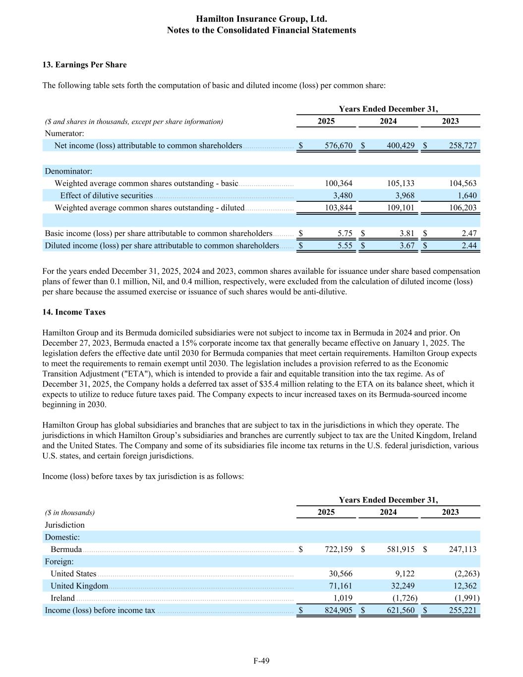 13. Earnings Per Share The following table sets forth the computation of basic and diluted income (loss) per common share: Years Ended December 31, ($ and shares in thousands, except per share information) 2025 2024 2023 Numerator: Net income (loss) attributable to common shareholders ........................ $ 576,670 $ 400,429 $ 258,727 Denominator: Weighted average common shares outstanding - basic .......................... 100,364 105,133 104,563 Effect of dilutive securities .................................................................. 3,480 3,968 1,640 Weighted average common shares outstanding - diluted ....................... 103,844 109,101 106,203 Basic income (loss) per share attributable to common shareholders .......... $ 5.75 $ 3.81 $ 2.47 Diluted income (loss) per share attributable to common shareholders ....... $ 5.55 $ 3.67 $ 2.44 For the years ended December 31, 2025, 2024 and 2023, common shares available for issuance under share based compensation plans of fewer than 0.1 million, Nil, and 0.4 million, respectively, were excluded from the calculation of diluted income (loss) per share because the assumed exercise or issuance of such shares would be anti-dilutive. 14. Income Taxes Hamilton Group and its Bermuda domiciled subsidiaries were not subject to income tax in Bermuda in 2024 and prior. On December 27, 2023, Bermuda enacted a 15% corporate income tax that generally became effective on January 1, 2025. The legislation defers the effective date until 2030 for Bermuda companies that meet certain requirements. Hamilton Group expects to meet the requirements to remain exempt until 2030. The legislation includes a provision referred to as the Economic Transition Adjustment ("ETA"), which is intended to provide a fair and equitable transition into the tax regime. As of December 31, 2025, the Company holds a deferred tax asset of $35.4 million relating to the ETA on its balance sheet, which it expects to utilize to reduce future taxes paid. The Company expects to incur increased taxes on its Bermuda-sourced income beginning in 2030. Hamilton Group has global subsidiaries and branches that are subject to tax in the jurisdictions in which they operate. The jurisdictions in which Hamilton Group’s subsidiaries and branches are currently subject to tax are the United Kingdom, Ireland and the United States. The Company and some of its subsidiaries file income tax returns in the U.S. federal jurisdiction, various U.S. states, and certain foreign jurisdictions. Income (loss) before taxes by tax jurisdiction is as follows: Years Ended December 31, ($ in thousands) 2025 2024 2023 Jurisdiction Domestic: Bermuda ................................................................................................... $ 722,159 $ 581,915 $ 247,113 Foreign: United States ............................................................................................ 30,566 9,122 (2,263) United Kingdom ....................................................................................... 71,161 32,249 12,362 Ireland ...................................................................................................... 1,019 (1,726) (1,991) Income (loss) before income tax ................................................................ $ 824,905 $ 621,560 $ 255,221 Hamilton Insurance Group, Ltd. Notes to the Consolidated Financial Statements F-49
