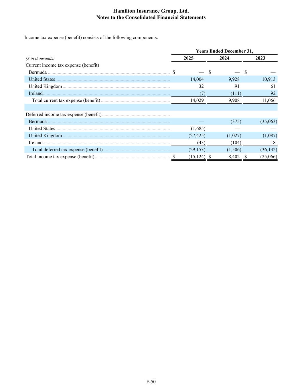 Income tax expense (benefit) consists of the following components: Years Ended December 31, ($ in thousands) 2025 2024 2023 Current income tax expense (benefit) Bermuda ................................................................................................... $ — $ — $ — United States ............................................................................................. 14,004 9,928 10,913 United Kingdom ....................................................................................... 32 91 61 Ireland ....................................................................................................... (7) (111) 92 Total current tax expense (benefit) ........................................................ 14,029 9,908 11,066 Deferred income tax expense (benefit) ....................................................... Bermuda ................................................................................................... — (375) (35,063) United States ............................................................................................. (1,685) — — United Kingdom ....................................................................................... (27,425) (1,027) (1,087) Ireland ....................................................................................................... (43) (104) 18 Total deferred tax expense (benefit) ...................................................... (29,153) (1,506) (36,132) Total income tax expense (benefit) ............................................................. $ (15,124) $ 8,402 $ (25,066) Hamilton Insurance Group, Ltd. Notes to the Consolidated Financial Statements F-50