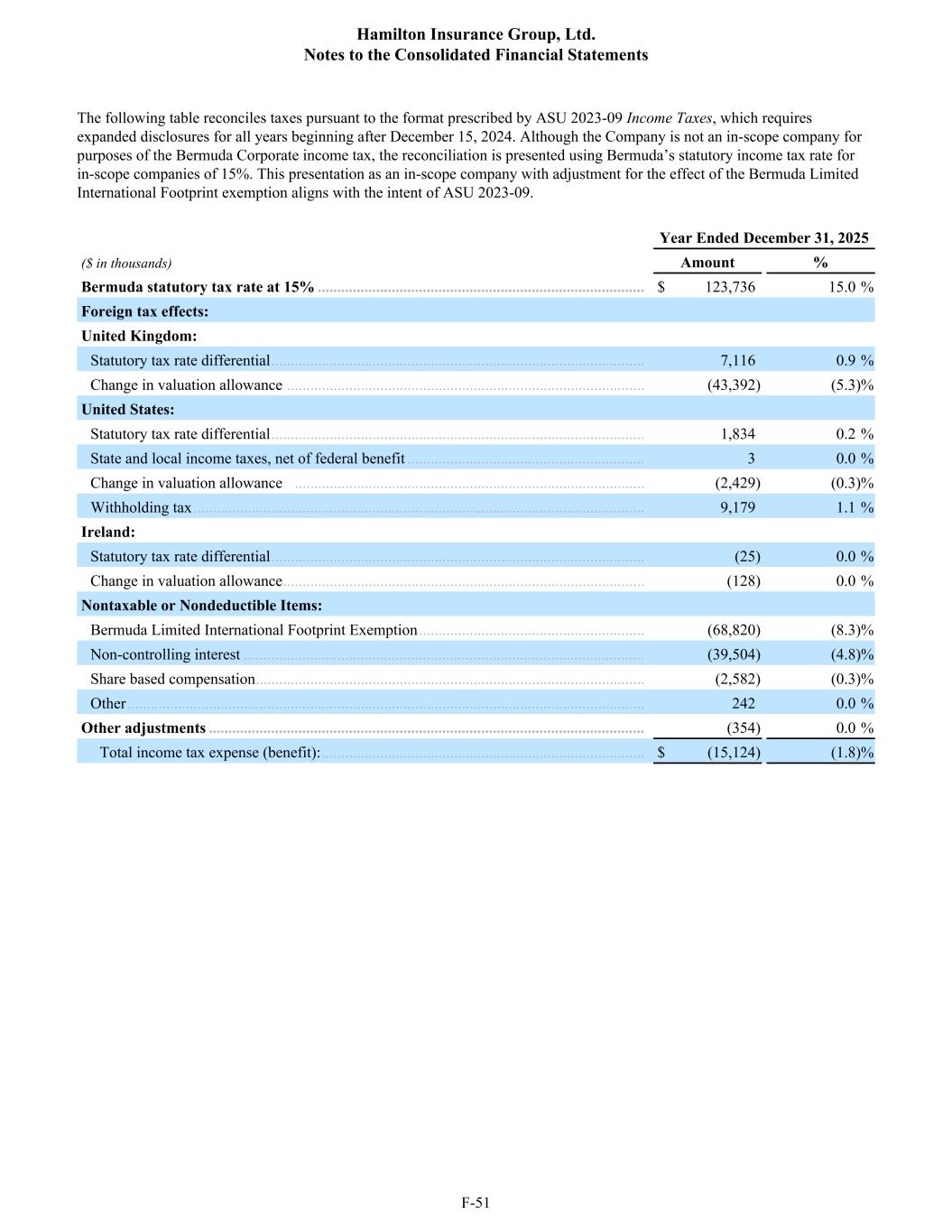 The following table reconciles taxes pursuant to the format prescribed by ASU 2023-09 Income Taxes, which requires expanded disclosures for all years beginning after December 15, 2024. Although the Company is not an in-scope company for purposes of the Bermuda Corporate income tax, the reconciliation is presented using Bermuda’s statutory income tax rate for in-scope companies of 15%. This presentation as an in-scope company with adjustment for the effect of the Bermuda Limited International Footprint exemption aligns with the intent of ASU 2023-09. Year Ended December 31, 2025 ($ in thousands) Amount % Bermuda statutory tax rate at 15% .................................................................................... $ 123,736 15.0 % Foreign tax effects: United Kingdom: Statutory tax rate differential ................................................................................................ 7,116 0.9 % Change in valuation allowance ............................................................................................ (43,392) (5.3) % United States: Statutory tax rate differential ................................................................................................ 1,834 0.2 % State and local income taxes, net of federal benefit ............................................................. 3 0.0 % Change in valuation allowance .......................................................................................... (2,429) (0.3) % Withholding tax .................................................................................................................... 9,179 1.1 % Ireland: Statutory tax rate differential ................................................................................................ (25) 0.0 % Change in valuation allowance ............................................................................................. (128) 0.0 % Nontaxable or Nondeductible Items: Bermuda Limited International Footprint Exemption .......................................................... (68,820) (8.3) % Non-controlling interest ....................................................................................................... (39,504) (4.8) % Share based compensation .................................................................................................... (2,582) (0.3) % Other ..................................................................................................................................... 242 0.0 % Other adjustments ................................................................................................................ (354) 0.0 % Total income tax expense (benefit): ................................................................................... $ (15,124) (1.8) % Hamilton Insurance Group, Ltd. Notes to the Consolidated Financial Statements F-51