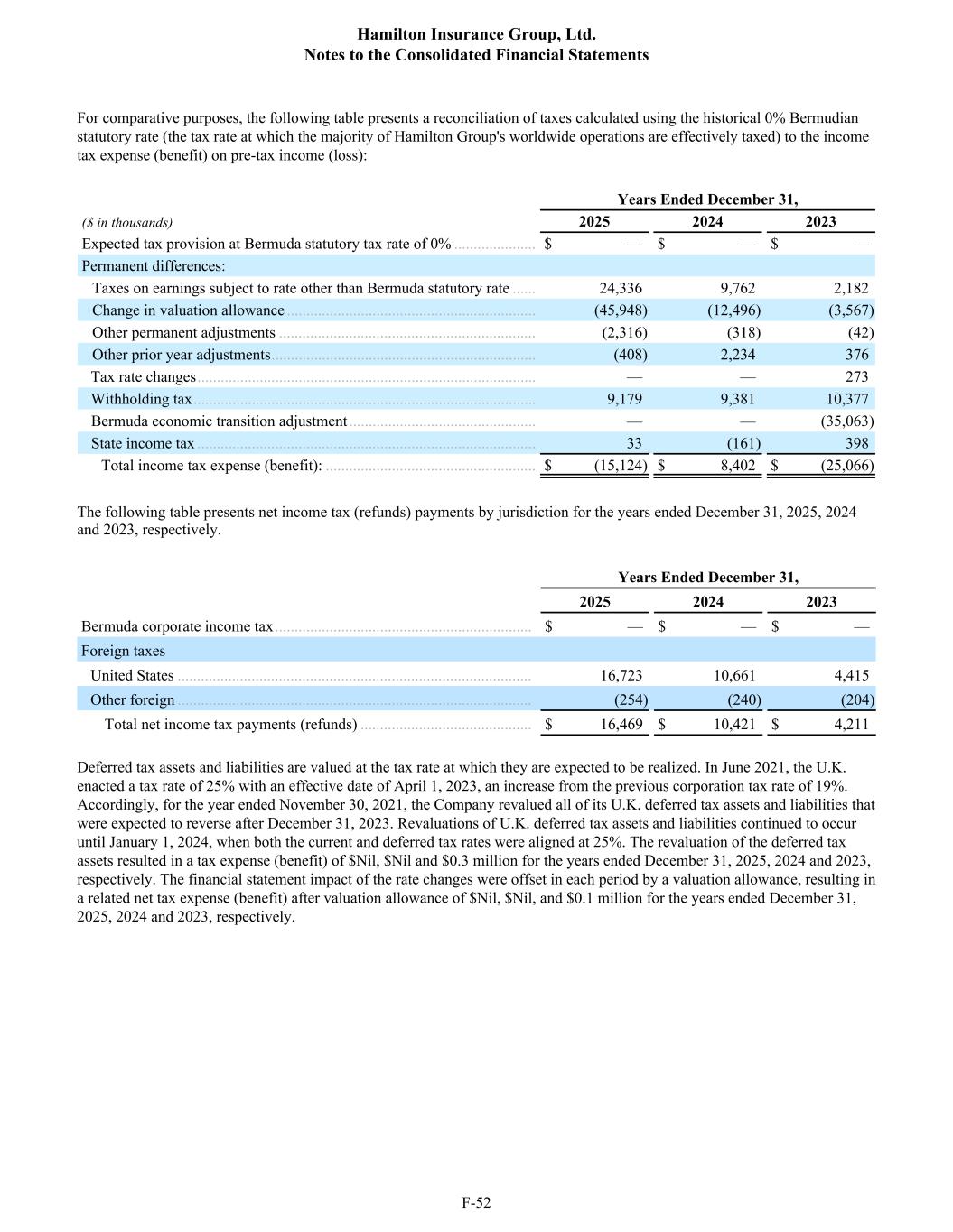 For comparative purposes, the following table presents a reconciliation of taxes calculated using the historical 0% Bermudian statutory rate (the tax rate at which the majority of Hamilton Group's worldwide operations are effectively taxed) to the income tax expense (benefit) on pre-tax income (loss): Years Ended December 31, ($ in thousands) 2025 2024 2023 Expected tax provision at Bermuda statutory tax rate of 0% ..................... $ — $ — $ — Permanent differences: Taxes on earnings subject to rate other than Bermuda statutory rate ...... 24,336 9,762 2,182 Change in valuation allowance ................................................................ (45,948) (12,496) (3,567) Other permanent adjustments .................................................................. (2,316) (318) (42) Other prior year adjustments .................................................................... (408) 2,234 376 Tax rate changes ....................................................................................... — — 273 Withholding tax ........................................................................................ 9,179 9,381 10,377 Bermuda economic transition adjustment ................................................ — — (35,063) State income tax ....................................................................................... 33 (161) 398 Total income tax expense (benefit): ...................................................... $ (15,124) $ 8,402 $ (25,066) The following table presents net income tax (refunds) payments by jurisdiction for the years ended December 31, 2025, 2024 and 2023, respectively. Years Ended December 31, 2025 2024 2023 Bermuda corporate income tax .................................................................. $ — $ — $ — Foreign taxes United States ........................................................................................... 16,723 10,661 4,415 Other foreign ........................................................................................... (254) (240) (204) Total net income tax payments (refunds) ............................................ $ 16,469 $ 10,421 $ 4,211 Deferred tax assets and liabilities are valued at the tax rate at which they are expected to be realized. In June 2021, the U.K. enacted a tax rate of 25% with an effective date of April 1, 2023, an increase from the previous corporation tax rate of 19%. Accordingly, for the year ended November 30, 2021, the Company revalued all of its U.K. deferred tax assets and liabilities that were expected to reverse after December 31, 2023. Revaluations of U.K. deferred tax assets and liabilities continued to occur until January 1, 2024, when both the current and deferred tax rates were aligned at 25%. The revaluation of the deferred tax assets resulted in a tax expense (benefit) of $Nil, $Nil and $0.3 million for the years ended December 31, 2025, 2024 and 2023, respectively. The financial statement impact of the rate changes were offset in each period by a valuation allowance, resulting in a related net tax expense (benefit) after valuation allowance of $Nil, $Nil, and $0.1 million for the years ended December 31, 2025, 2024 and 2023, respectively. Hamilton Insurance Group, Ltd. Notes to the Consolidated Financial Statements F-52