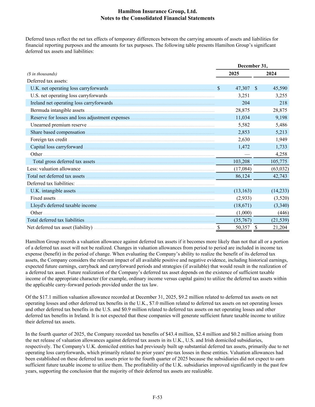 Deferred taxes reflect the net tax effects of temporary differences between the carrying amounts of assets and liabilities for financial reporting purposes and the amounts for tax purposes. The following table presents Hamilton Group’s significant deferred tax assets and liabilities: December 31, ($ in thousands) 2025 2024 Deferred tax assets: U.K. net operating loss carryforwards .................................................................................. $ 47,307 $ 45,590 U.S. net operating loss carryforwards ................................................................................... 3,251 3,255 Ireland net operating loss carryforwards ............................................................................... 204 218 Bermuda intangible assets ..................................................................................................... 28,875 28,875 Reserve for losses and loss adjustment expenses .................................................................. 11,034 9,198 Unearned premium reserve ................................................................................................... 5,582 5,486 Share based compensation .................................................................................................... 2,853 5,213 Foreign tax credit .................................................................................................................. 2,630 1,949 Capital loss carryforward ...................................................................................................... 1,472 1,733 Other ..................................................................................................................................... — 4,258 Total gross deferred tax assets ............................................................................................ 103,208 105,775 Less: valuation allowance ........................................................................................................ (17,084) (63,032) Total net deferred tax assets .................................................................................................... 86,124 42,743 Deferred tax liabilities: ............................................................................................................ U.K. intangible assets ............................................................................................................ (13,163) (14,233) Fixed assets ........................................................................................................................... (2,933) (3,520) Lloyd's deferred taxable income ........................................................................................... (18,671) (3,340) Other ..................................................................................................................................... (1,000) (446) Total deferred tax liabilities ..................................................................................................... (35,767) (21,539) Net deferred tax asset (liability) .............................................................................................. $ 50,357 $ 21,204 Hamilton Group records a valuation allowance against deferred tax assets if it becomes more likely than not that all or a portion of a deferred tax asset will not be realized. Changes in valuation allowances from period to period are included in income tax expense (benefit) in the period of change. When evaluating the Company’s ability to realize the benefit of its deferred tax assets, the Company considers the relevant impact of all available positive and negative evidence, including historical earnings, expected future earnings, carryback and carryforward periods and strategies (if available) that would result in the realization of a deferred tax asset. Future realization of the Company’s deferred tax asset depends on the existence of sufficient taxable income of the appropriate character (for example, ordinary income versus capital gains) to utilize the deferred tax assets within the applicable carry-forward periods provided under the tax law. Of the $17.1 million valuation allowance recorded at December 31, 2025, $9.2 million related to deferred tax assets on net operating losses and other deferred tax benefits in the U.K., $7.0 million related to deferred tax assets on net operating losses and other deferred tax benefits in the U.S. and $0.9 million related to deferred tax assets on net operating losses and other deferred tax benefits in Ireland. It is not expected that these companies will generate sufficient future taxable income to utilize their deferred tax assets. In the fourth quarter of 2025, the Company recorded tax benefits of $43.4 million, $2.4 million and $0.2 million arising from the net release of valuation allowances against deferred tax assets in its U.K., U.S. and Irish domiciled subsidiaries, respectively. The Company's U.K. domiciled entities had previously built up substantial deferred tax assets, primarily due to net operating loss carryforwards, which primarily related to prior years' pre-tax losses in these entities. Valuation allowances had been established on these deferred tax assets prior to the fourth quarter of 2025 because the subsidiaries did not expect to earn sufficient future taxable income to utilize them. The profitability of the U.K. subsidiaries improved significantly in the past few years, supporting the conclusion that the majority of their deferred tax assets are realizable. Hamilton Insurance Group, Ltd. Notes to the Consolidated Financial Statements F-53