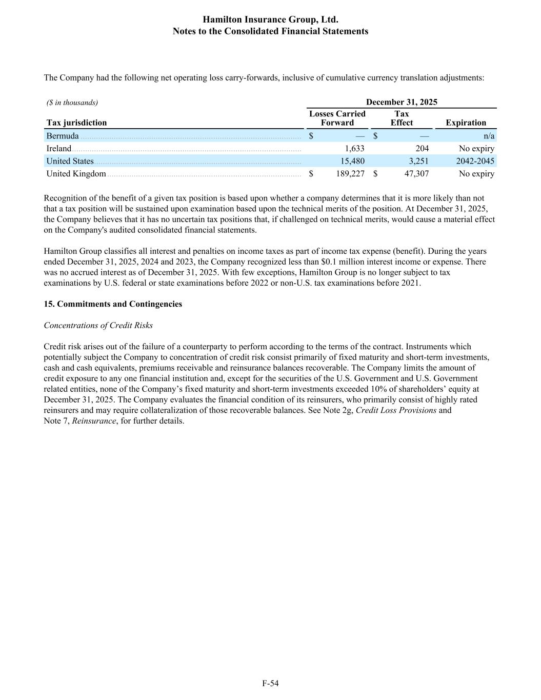 The Company had the following net operating loss carry-forwards, inclusive of cumulative currency translation adjustments: ($ in thousands) December 31, 2025 Tax jurisdiction Losses Carried Forward Tax Effect Expiration Bermuda .................................................................................................... $ — $ — n/a Ireland ........................................................................................................ 1,633 204 No expiry United States .............................................................................................. 15,480 3,251 2042-2045 United Kingdom ........................................................................................ $ 189,227 $ 47,307 No expiry Recognition of the benefit of a given tax position is based upon whether a company determines that it is more likely than not that a tax position will be sustained upon examination based upon the technical merits of the position. At December 31, 2025, the Company believes that it has no uncertain tax positions that, if challenged on technical merits, would cause a material effect on the Company's audited consolidated financial statements. Hamilton Group classifies all interest and penalties on income taxes as part of income tax expense (benefit). During the years ended December 31, 2025, 2024 and 2023, the Company recognized less than $0.1 million interest income or expense. There was no accrued interest as of December 31, 2025. With few exceptions, Hamilton Group is no longer subject to tax examinations by U.S. federal or state examinations before 2022 or non-U.S. tax examinations before 2021. 15. Commitments and Contingencies Concentrations of Credit Risks Credit risk arises out of the failure of a counterparty to perform according to the terms of the contract. Instruments which potentially subject the Company to concentration of credit risk consist primarily of fixed maturity and short-term investments, cash and cash equivalents, premiums receivable and reinsurance balances recoverable. The Company limits the amount of credit exposure to any one financial institution and, except for the securities of the U.S. Government and U.S. Government related entities, none of the Company’s fixed maturity and short-term investments exceeded 10% of shareholders’ equity at December 31, 2025. The Company evaluates the financial condition of its reinsurers, who primarily consist of highly rated reinsurers and may require collateralization of those recoverable balances. See Note 2g, Credit Loss Provisions and Note 7, Reinsurance, for further details. Hamilton Insurance Group, Ltd. Notes to the Consolidated Financial Statements F-54
