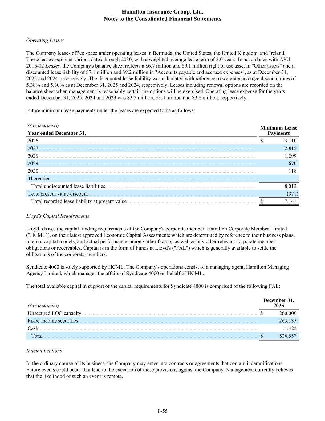 Operating Leases The Company leases office space under operating leases in Bermuda, the United States, the United Kingdom, and Ireland. These leases expire at various dates through 2030, with a weighted average lease term of 2.0 years. In accordance with ASU 2016-02 Leases, the Company's balance sheet reflects a $6.7 million and $9.1 million right of use asset in "Other assets" and a discounted lease liability of $7.1 million and $9.2 million in "Accounts payable and accrued expenses", as at December 31, 2025 and 2024, respectively. The discounted lease liability was calculated with reference to weighted average discount rates of 5.38% and 5.30% as at December 31, 2025 and 2024, respectively. Leases including renewal options are recorded on the balance sheet when management is reasonably certain the options will be exercised. Operating lease expense for the years ended December 31, 2025, 2024 and 2023 was $3.5 million, $3.4 million and $3.8 million, respectively. Future minimum lease payments under the leases are expected to be as follows: ($ in thousands) Minimum Lease PaymentsYear ended December 31, 2026 ................................................................................................................................................................... $ 3,110 2027 ................................................................................................................................................................... 2,815 2028 ................................................................................................................................................................... 1,299 2029 ................................................................................................................................................................... 670 2030 ................................................................................................................................................................... 118 Thereafter ........................................................................................................................................................... — Total undiscounted lease liabilities ................................................................................................................. 8,012 Less: present value discount .............................................................................................................................. (871) Total recorded lease liability at present value ................................................................................................. $ 7,141 Lloyd's Capital Requirements Lloyd’s bases the capital funding requirements of the Company's corporate member, Hamilton Corporate Member Limited ("HCML"), on their latest approved Economic Capital Assessments which are determined by reference to their business plans, internal capital models, and actual performance, among other factors, as well as any other relevant corporate member obligations or receivables. Capital is in the form of Funds at Lloyd's ("FAL") which is generally available to settle the obligations of the corporate members. Syndicate 4000 is solely supported by HCML. The Company's operations consist of a managing agent, Hamilton Managing Agency Limited, which manages the affairs of Syndicate 4000 on behalf of HCML. The total available capital in support of the capital requirements for Syndicate 4000 is comprised of the following FAL: ($ in thousands) December 31, 2025 Unsecured LOC capacity .................................................................................................................................... $ 260,000 Fixed income securities ....................................................................................................................................... 263,135 Cash ..................................................................................................................................................................... 1,422 Total ................................................................................................................................................................. $ 524,557 Indemnifications In the ordinary course of its business, the Company may enter into contracts or agreements that contain indemnifications. Future events could occur that lead to the execution of these provisions against the Company. Management currently believes that the likelihood of such an event is remote. Hamilton Insurance Group, Ltd. Notes to the Consolidated Financial Statements F-55