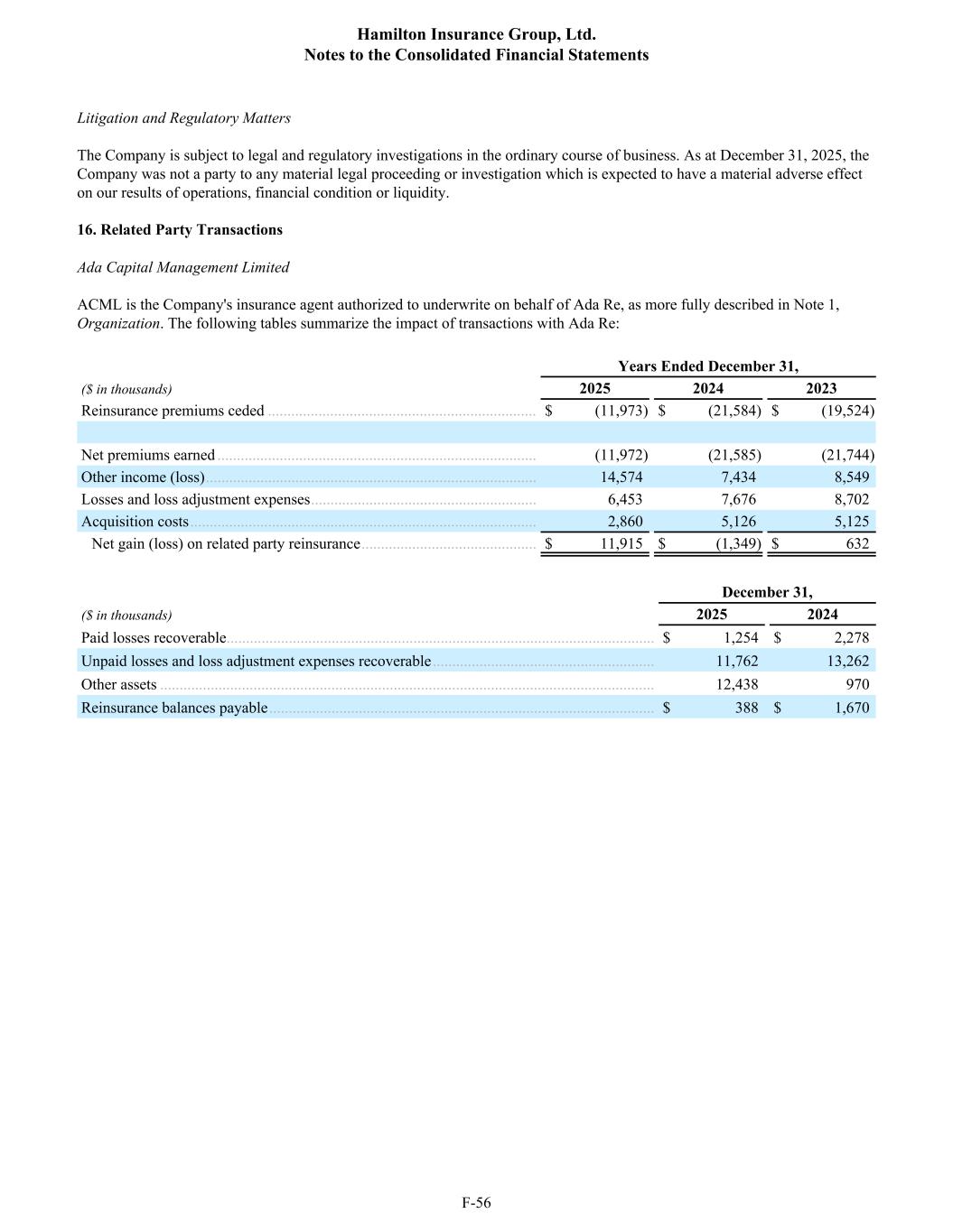 Litigation and Regulatory Matters The Company is subject to legal and regulatory investigations in the ordinary course of business. As at December 31, 2025, the Company was not a party to any material legal proceeding or investigation which is expected to have a material adverse effect on our results of operations, financial condition or liquidity. 16. Related Party Transactions Ada Capital Management Limited ACML is the Company's insurance agent authorized to underwrite on behalf of Ada Re, as more fully described in Note 1, Organization. The following tables summarize the impact of transactions with Ada Re: Years Ended December 31, ($ in thousands) 2025 2024 2023 Reinsurance premiums ceded ..................................................................... $ (11,973) $ (21,584) $ (19,524) Net premiums earned .................................................................................. (11,972) (21,585) (21,744) Other income (loss) ..................................................................................... 14,574 7,434 8,549 Losses and loss adjustment expenses .......................................................... 6,453 7,676 8,702 Acquisition costs ......................................................................................... 2,860 5,126 5,125 Net gain (loss) on related party reinsurance ............................................. $ 11,915 $ (1,349) $ 632 December 31, ($ in thousands) 2025 2024 Paid losses recoverable .............................................................................................................. $ 1,254 $ 2,278 Unpaid losses and loss adjustment expenses recoverable ......................................................... 11,762 13,262 Other assets ............................................................................................................................... 12,438 970 Reinsurance balances payable ................................................................................................... $ 388 $ 1,670 Hamilton Insurance Group, Ltd. Notes to the Consolidated Financial Statements F-56