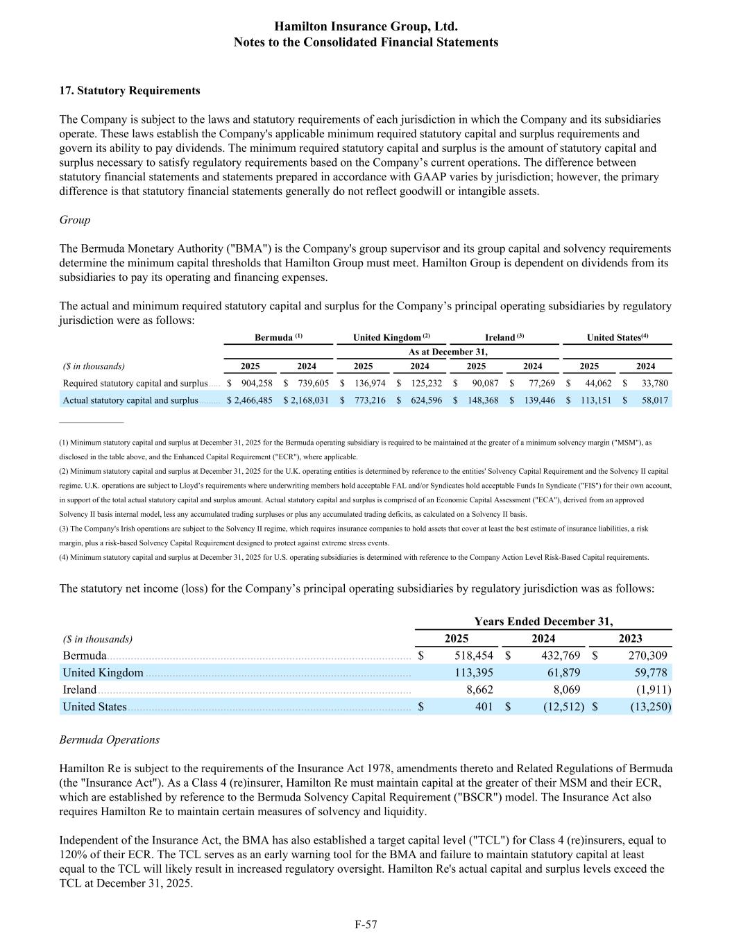 17. Statutory Requirements The Company is subject to the laws and statutory requirements of each jurisdiction in which the Company and its subsidiaries operate. These laws establish the Company's applicable minimum required statutory capital and surplus requirements and govern its ability to pay dividends. The minimum required statutory capital and surplus is the amount of statutory capital and surplus necessary to satisfy regulatory requirements based on the Company’s current operations. The difference between statutory financial statements and statements prepared in accordance with GAAP varies by jurisdiction; however, the primary difference is that statutory financial statements generally do not reflect goodwill or intangible assets. Group The Bermuda Monetary Authority ("BMA") is the Company's group supervisor and its group capital and solvency requirements determine the minimum capital thresholds that Hamilton Group must meet. Hamilton Group is dependent on dividends from its subsidiaries to pay its operating and financing expenses. The actual and minimum required statutory capital and surplus for the Company’s principal operating subsidiaries by regulatory jurisdiction were as follows: Bermuda (1) United Kingdom (2) Ireland (3) United States(4) As at December 31, ($ in thousands) 2025 2024 2025 2024 2025 2024 2025 2024 Required statutory capital and surplus ..... $ 904,258 $ 739,605 $ 136,974 $ 125,232 $ 90,087 $ 77,269 $ 44,062 $ 33,780 Actual statutory capital and surplus ......... $ 2,466,485 $ 2,168,031 $ 773,216 $ 624,596 $ 148,368 $ 139,446 $ 113,151 $ 58,017 ____________ (1) Minimum statutory capital and surplus at December 31, 2025 for the Bermuda operating subsidiary is required to be maintained at the greater of a minimum solvency margin ("MSM"), as disclosed in the table above, and the Enhanced Capital Requirement ("ECR"), where applicable. (2) Minimum statutory capital and surplus at December 31, 2025 for the U.K. operating entities is determined by reference to the entities' Solvency Capital Requirement and the Solvency II capital regime. U.K. operations are subject to Lloyd’s requirements where underwriting members hold acceptable FAL and/or Syndicates hold acceptable Funds In Syndicate ("FIS") for their own account, in support of the total actual statutory capital and surplus amount. Actual statutory capital and surplus is comprised of an Economic Capital Assessment ("ECA"), derived from an approved Solvency II basis internal model, less any accumulated trading surpluses or plus any accumulated trading deficits, as calculated on a Solvency II basis. (3) The Company's Irish operations are subject to the Solvency II regime, which requires insurance companies to hold assets that cover at least the best estimate of insurance liabilities, a risk margin, plus a risk-based Solvency Capital Requirement designed to protect against extreme stress events. (4) Minimum statutory capital and surplus at December 31, 2025 for U.S. operating subsidiaries is determined with reference to the Company Action Level Risk-Based Capital requirements. The statutory net income (loss) for the Company’s principal operating subsidiaries by regulatory jurisdiction was as follows: Years Ended December 31, ($ in thousands) 2025 2024 2023 Bermuda ...................................................................................................... $ 518,454 $ 432,769 $ 270,309 United Kingdom ......................................................................................... 113,395 61,879 59,778 Ireland ......................................................................................................... 8,662 8,069 (1,911) United States ............................................................................................... $ 401 $ (12,512) $ (13,250) Bermuda Operations Hamilton Re is subject to the requirements of the Insurance Act 1978, amendments thereto and Related Regulations of Bermuda (the "Insurance Act"). As a Class 4 (re)insurer, Hamilton Re must maintain capital at the greater of their MSM and their ECR, which are established by reference to the Bermuda Solvency Capital Requirement ("BSCR") model. The Insurance Act also requires Hamilton Re to maintain certain measures of solvency and liquidity. Independent of the Insurance Act, the BMA has also established a target capital level ("TCL") for Class 4 (re)insurers, equal to 120% of their ECR. The TCL serves as an early warning tool for the BMA and failure to maintain statutory capital at least equal to the TCL will likely result in increased regulatory oversight. Hamilton Re's actual capital and surplus levels exceed the TCL at December 31, 2025. Hamilton Insurance Group, Ltd. Notes to the Consolidated Financial Statements F-57