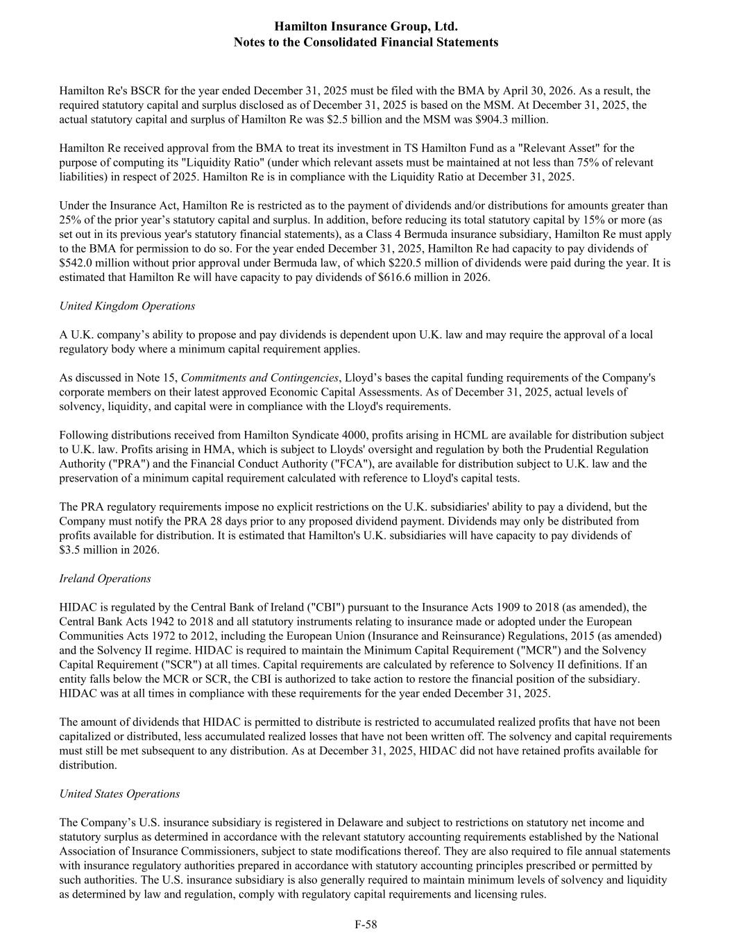 Hamilton Re's BSCR for the year ended December 31, 2025 must be filed with the BMA by April 30, 2026. As a result, the required statutory capital and surplus disclosed as of December 31, 2025 is based on the MSM. At December 31, 2025, the actual statutory capital and surplus of Hamilton Re was $2.5 billion and the MSM was $904.3 million. Hamilton Re received approval from the BMA to treat its investment in TS Hamilton Fund as a "Relevant Asset" for the purpose of computing its "Liquidity Ratio" (under which relevant assets must be maintained at not less than 75% of relevant liabilities) in respect of 2025. Hamilton Re is in compliance with the Liquidity Ratio at December 31, 2025. Under the Insurance Act, Hamilton Re is restricted as to the payment of dividends and/or distributions for amounts greater than 25% of the prior year’s statutory capital and surplus. In addition, before reducing its total statutory capital by 15% or more (as set out in its previous year's statutory financial statements), as a Class 4 Bermuda insurance subsidiary, Hamilton Re must apply to the BMA for permission to do so. For the year ended December 31, 2025, Hamilton Re had capacity to pay dividends of $542.0 million without prior approval under Bermuda law, of which $220.5 million of dividends were paid during the year. It is estimated that Hamilton Re will have capacity to pay dividends of $616.6 million in 2026. United Kingdom Operations A U.K. company’s ability to propose and pay dividends is dependent upon U.K. law and may require the approval of a local regulatory body where a minimum capital requirement applies. As discussed in Note 15, Commitments and Contingencies, Lloyd’s bases the capital funding requirements of the Company's corporate members on their latest approved Economic Capital Assessments. As of December 31, 2025, actual levels of solvency, liquidity, and capital were in compliance with the Lloyd's requirements. Following distributions received from Hamilton Syndicate 4000, profits arising in HCML are available for distribution subject to U.K. law. Profits arising in HMA, which is subject to Lloyds' oversight and regulation by both the Prudential Regulation Authority ("PRA") and the Financial Conduct Authority ("FCA"), are available for distribution subject to U.K. law and the preservation of a minimum capital requirement calculated with reference to Lloyd's capital tests. The PRA regulatory requirements impose no explicit restrictions on the U.K. subsidiaries' ability to pay a dividend, but the Company must notify the PRA 28 days prior to any proposed dividend payment. Dividends may only be distributed from profits available for distribution. It is estimated that Hamilton's U.K. subsidiaries will have capacity to pay dividends of $3.5 million in 2026. Ireland Operations HIDAC is regulated by the Central Bank of Ireland ("CBI") pursuant to the Insurance Acts 1909 to 2018 (as amended), the Central Bank Acts 1942 to 2018 and all statutory instruments relating to insurance made or adopted under the European Communities Acts 1972 to 2012, including the European Union (Insurance and Reinsurance) Regulations, 2015 (as amended) and the Solvency II regime. HIDAC is required to maintain the Minimum Capital Requirement ("MCR") and the Solvency Capital Requirement ("SCR") at all times. Capital requirements are calculated by reference to Solvency II definitions. If an entity falls below the MCR or SCR, the CBI is authorized to take action to restore the financial position of the subsidiary. HIDAC was at all times in compliance with these requirements for the year ended December 31, 2025. The amount of dividends that HIDAC is permitted to distribute is restricted to accumulated realized profits that have not been capitalized or distributed, less accumulated realized losses that have not been written off. The solvency and capital requirements must still be met subsequent to any distribution. As at December 31, 2025, HIDAC did not have retained profits available for distribution. United States Operations The Company’s U.S. insurance subsidiary is registered in Delaware and subject to restrictions on statutory net income and statutory surplus as determined in accordance with the relevant statutory accounting requirements established by the National Association of Insurance Commissioners, subject to state modifications thereof. They are also required to file annual statements with insurance regulatory authorities prepared in accordance with statutory accounting principles prescribed or permitted by such authorities. The U.S. insurance subsidiary is also generally required to maintain minimum levels of solvency and liquidity as determined by law and regulation, comply with regulatory capital requirements and licensing rules. Hamilton Insurance Group, Ltd. Notes to the Consolidated Financial Statements F-58