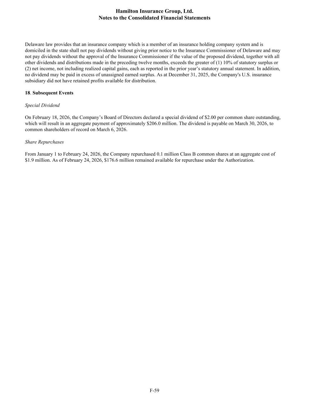 Delaware law provides that an insurance company which is a member of an insurance holding company system and is domiciled in the state shall not pay dividends without giving prior notice to the Insurance Commissioner of Delaware and may not pay dividends without the approval of the Insurance Commissioner if the value of the proposed dividend, together with all other dividends and distributions made in the preceding twelve months, exceeds the greater of (1) 10% of statutory surplus or (2) net income, not including realized capital gains, each as reported in the prior year’s statutory annual statement. In addition, no dividend may be paid in excess of unassigned earned surplus. As at December 31, 2025, the Company's U.S. insurance subsidiary did not have retained profits available for distribution. 18. Subsequent Events Special Dividend On February 18, 2026, the Company’s Board of Directors declared a special dividend of $2.00 per common share outstanding, which will result in an aggregate payment of approximately $206.0 million. The dividend is payable on March 30, 2026, to common shareholders of record on March 6, 2026. Share Repurchases From January 1 to February 24, 2026, the Company repurchased 0.1 million Class B common shares at an aggregate cost of $1.9 million. As of February 24, 2026, $176.6 million remained available for repurchase under the Authorization. Hamilton Insurance Group, Ltd. Notes to the Consolidated Financial Statements F-59