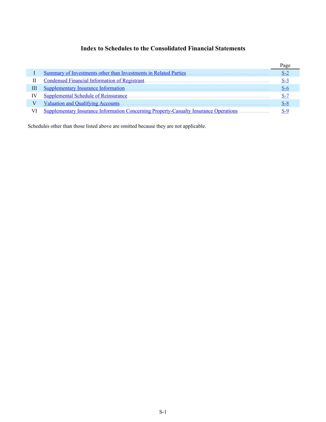 Index to Schedules to the Consolidated Financial Statements Page I Summary of Investments other than Investments in Related Parties .............................................................. S-2 II Condensed Financial Information of Registrant .............................................................................................. S-3 III Supplementary Insurance Information ............................................................................................................ S-6 IV Supplemental Schedule of Reinsurance .......................................................................................................... S-7 V Valuation and Qualifying Accounts ................................................................................................................ S-8 VI Supplementary Insurance Information Concerning Property-Casualty Insurance Operations ....................... S-9 Schedules other than those listed above are omitted because they are not applicable. S-1