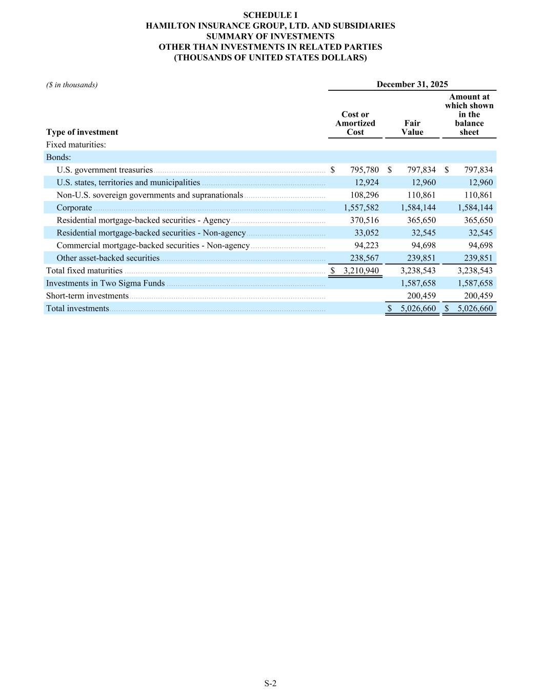 ($ in thousands) December 31, 2025 Type of investment Cost or Amortized Cost Fair Value Amount at which shown in the balance sheet Fixed maturities: Bonds: U.S. government treasuries .............................................................................. $ 795,780 $ 797,834 $ 797,834 U.S. states, territories and municipalities ........................................................ 12,924 12,960 12,960 Non-U.S. sovereign governments and supranationals ..................................... 108,296 110,861 110,861 Corporate ......................................................................................................... 1,557,582 1,584,144 1,584,144 Residential mortgage-backed securities - Agency ........................................... 370,516 365,650 365,650 Residential mortgage-backed securities - Non-agency .................................... 33,052 32,545 32,545 Commercial mortgage-backed securities - Non-agency .................................. 94,223 94,698 94,698 Other asset-backed securities ........................................................................... 238,567 239,851 239,851 Total fixed maturities ........................................................................................... $ 3,210,940 3,238,543 3,238,543 Investments in Two Sigma Funds ........................................................................ 1,587,658 1,587,658 Short-term investments ......................................................................................... 200,459 200,459 Total investments .................................................................................................. $ 5,026,660 $ 5,026,660 SCHEDULE I HAMILTON INSURANCE GROUP, LTD. AND SUBSIDIARIES SUMMARY OF INVESTMENTS OTHER THAN INVESTMENTS IN RELATED PARTIES (THOUSANDS OF UNITED STATES DOLLARS) S-2