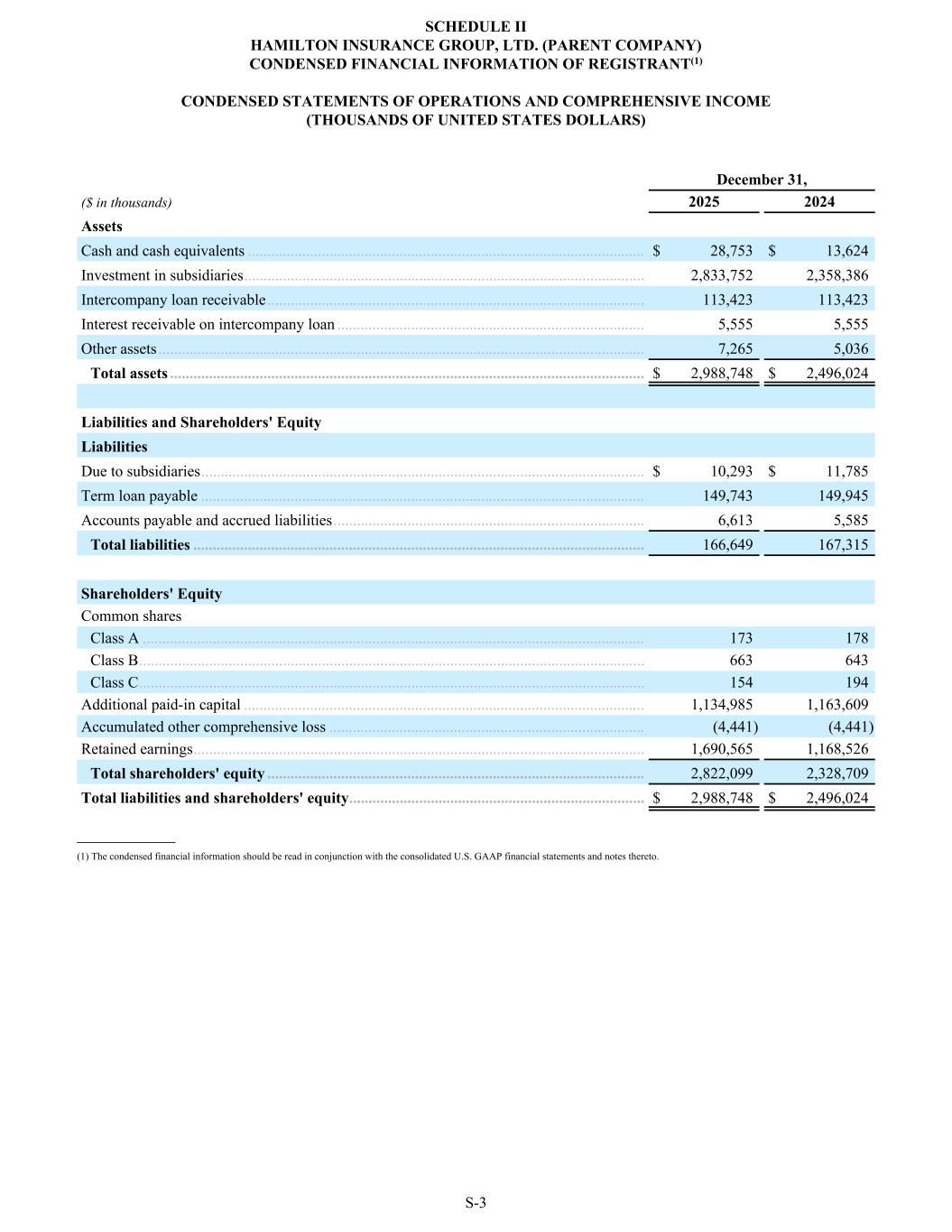 December 31, ($ in thousands) 2025 2024 Assets Cash and cash equivalents ...................................................................................................... $ 28,753 $ 13,624 Investment in subsidiaries ....................................................................................................... 2,833,752 2,358,386 Intercompany loan receivable ................................................................................................. 113,423 113,423 Interest receivable on intercompany loan ............................................................................... 5,555 5,555 Other assets ............................................................................................................................. 7,265 5,036 Total assets .......................................................................................................................... $ 2,988,748 $ 2,496,024 Liabilities and Shareholders' Equity Liabilities Due to subsidiaries .................................................................................................................. $ 10,293 $ 11,785 Term loan payable .................................................................................................................. 149,743 149,945 Accounts payable and accrued liabilities ................................................................................ 6,613 5,585 Total liabilities .................................................................................................................... 166,649 167,315 Shareholders' Equity Common shares Class A ................................................................................................................................. 173 178 Class B .................................................................................................................................. 663 643 Class C .................................................................................................................................. 154 194 Additional paid-in capital ....................................................................................................... 1,134,985 1,163,609 Accumulated other comprehensive loss ................................................................................. (4,441) (4,441) Retained earnings .................................................................................................................... 1,690,565 1,168,526 Total shareholders' equity ................................................................................................. 2,822,099 2,328,709 Total liabilities and shareholders' equity ............................................................................ $ 2,988,748 $ 2,496,024 (1) The condensed financial information should be read in conjunction with the consolidated U.S. GAAP financial statements and notes thereto. SCHEDULE II HAMILTON INSURANCE GROUP, LTD. (PARENT COMPANY) CONDENSED FINANCIAL INFORMATION OF REGISTRANT(1) CONDENSED STATEMENTS OF OPERATIONS AND COMPREHENSIVE INCOME (THOUSANDS OF UNITED STATES DOLLARS) S-3