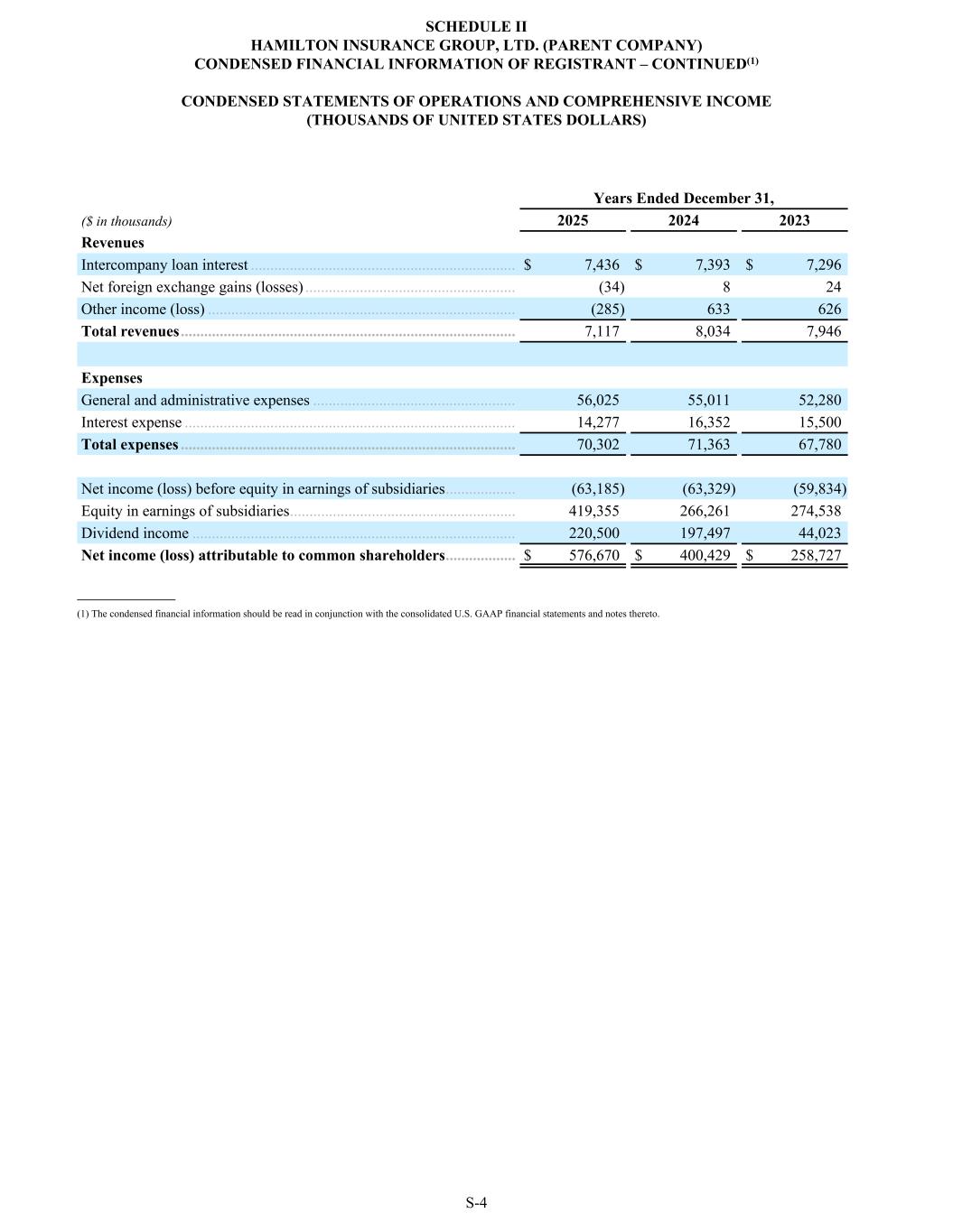 Years Ended December 31, ($ in thousands) 2025 2024 2023 Revenues Intercompany loan interest .................................................................... $ 7,436 $ 7,393 $ 7,296 Net foreign exchange gains (losses) ...................................................... (34) 8 24 Other income (loss) ............................................................................... (285) 633 626 Total revenues ...................................................................................... 7,117 8,034 7,946 Expenses General and administrative expenses .................................................... 56,025 55,011 52,280 Interest expense ..................................................................................... 14,277 16,352 15,500 Total expenses ...................................................................................... 70,302 71,363 67,780 Net income (loss) before equity in earnings of subsidiaries .................. (63,185) (63,329) (59,834) Equity in earnings of subsidiaries .......................................................... 419,355 266,261 274,538 Dividend income ................................................................................... 220,500 197,497 44,023 Net income (loss) attributable to common shareholders .................. $ 576,670 $ 400,429 $ 258,727 (1) The condensed financial information should be read in conjunction with the consolidated U.S. GAAP financial statements and notes thereto. SCHEDULE II HAMILTON INSURANCE GROUP, LTD. (PARENT COMPANY) CONDENSED FINANCIAL INFORMATION OF REGISTRANT – CONTINUED(1) CONDENSED STATEMENTS OF OPERATIONS AND COMPREHENSIVE INCOME (THOUSANDS OF UNITED STATES DOLLARS) S-4