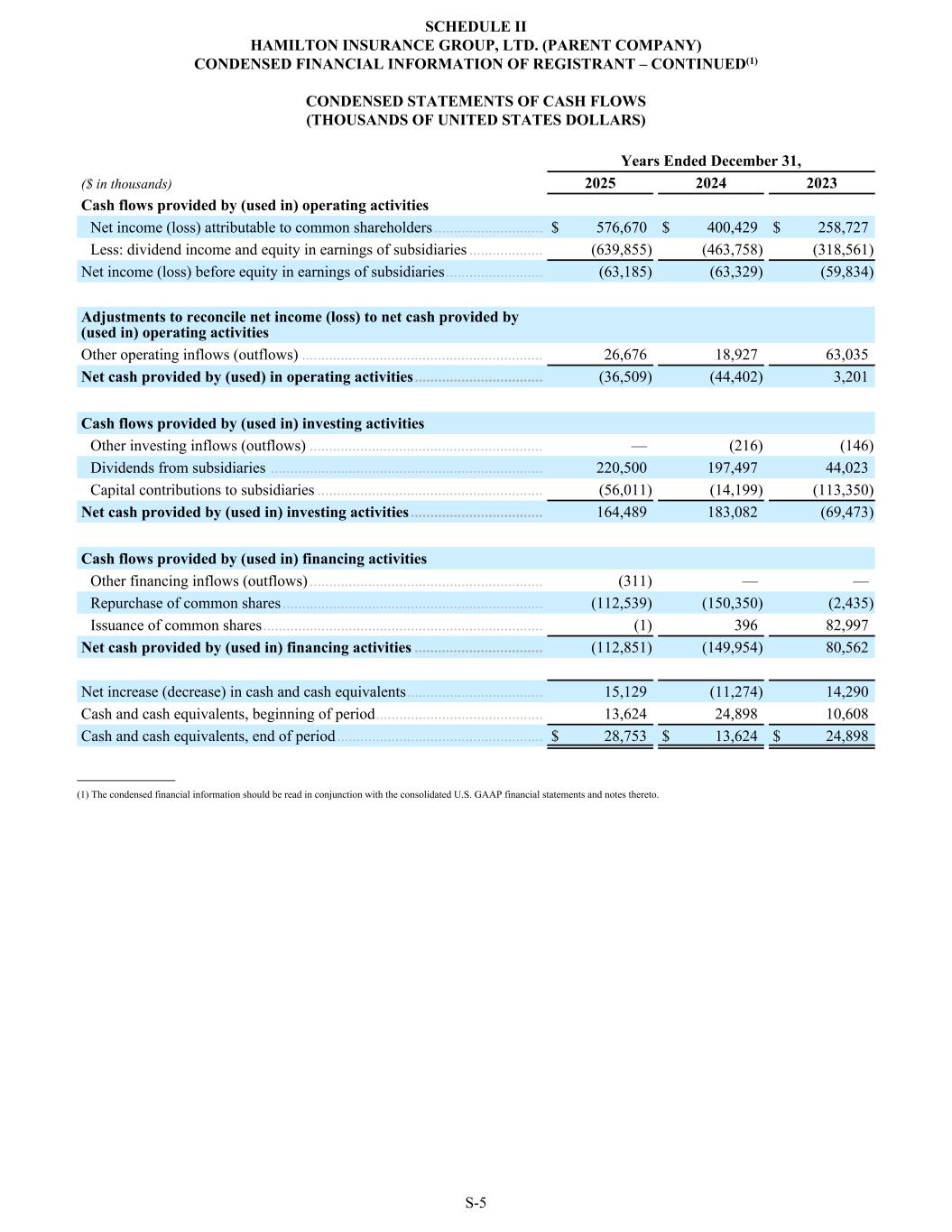Years Ended December 31, ($ in thousands) 2025 2024 2023 Cash flows provided by (used in) operating activities Net income (loss) attributable to common shareholders ............................ $ 576,670 $ 400,429 $ 258,727 Less: dividend income and equity in earnings of subsidiaries ................... (639,855) (463,758) (318,561) Net income (loss) before equity in earnings of subsidiaries ......................... (63,185) (63,329) (59,834) Adjustments to reconcile net income (loss) to net cash provided by (used in) operating activities Other operating inflows (outflows) .............................................................. 26,676 18,927 63,035 Net cash provided by (used) in operating activities ................................. (36,509) (44,402) 3,201 Cash flows provided by (used in) investing activities Other investing inflows (outflows) ............................................................ — (216) (146) Dividends from subsidiaries ...................................................................... 220,500 197,497 44,023 Capital contributions to subsidiaries .......................................................... (56,011) (14,199) (113,350) Net cash provided by (used in) investing activities .................................. 164,489 183,082 (69,473) Cash flows provided by (used in) financing activities Other financing inflows (outflows) ............................................................ (311) — — Repurchase of common shares ................................................................... (112,539) (150,350) (2,435) Issuance of common shares ........................................................................ (1) 396 82,997 Net cash provided by (used in) financing activities ................................. (112,851) (149,954) 80,562 Net increase (decrease) in cash and cash equivalents ................................... 15,129 (11,274) 14,290 Cash and cash equivalents, beginning of period ........................................... 13,624 24,898 10,608 Cash and cash equivalents, end of period ..................................................... $ 28,753 $ 13,624 $ 24,898 (1) The condensed financial information should be read in conjunction with the consolidated U.S. GAAP financial statements and notes thereto. SCHEDULE II HAMILTON INSURANCE GROUP, LTD. (PARENT COMPANY) CONDENSED FINANCIAL INFORMATION OF REGISTRANT – CONTINUED(1) CONDENSED STATEMENTS OF CASH FLOWS (THOUSANDS OF UNITED STATES DOLLARS) S-5