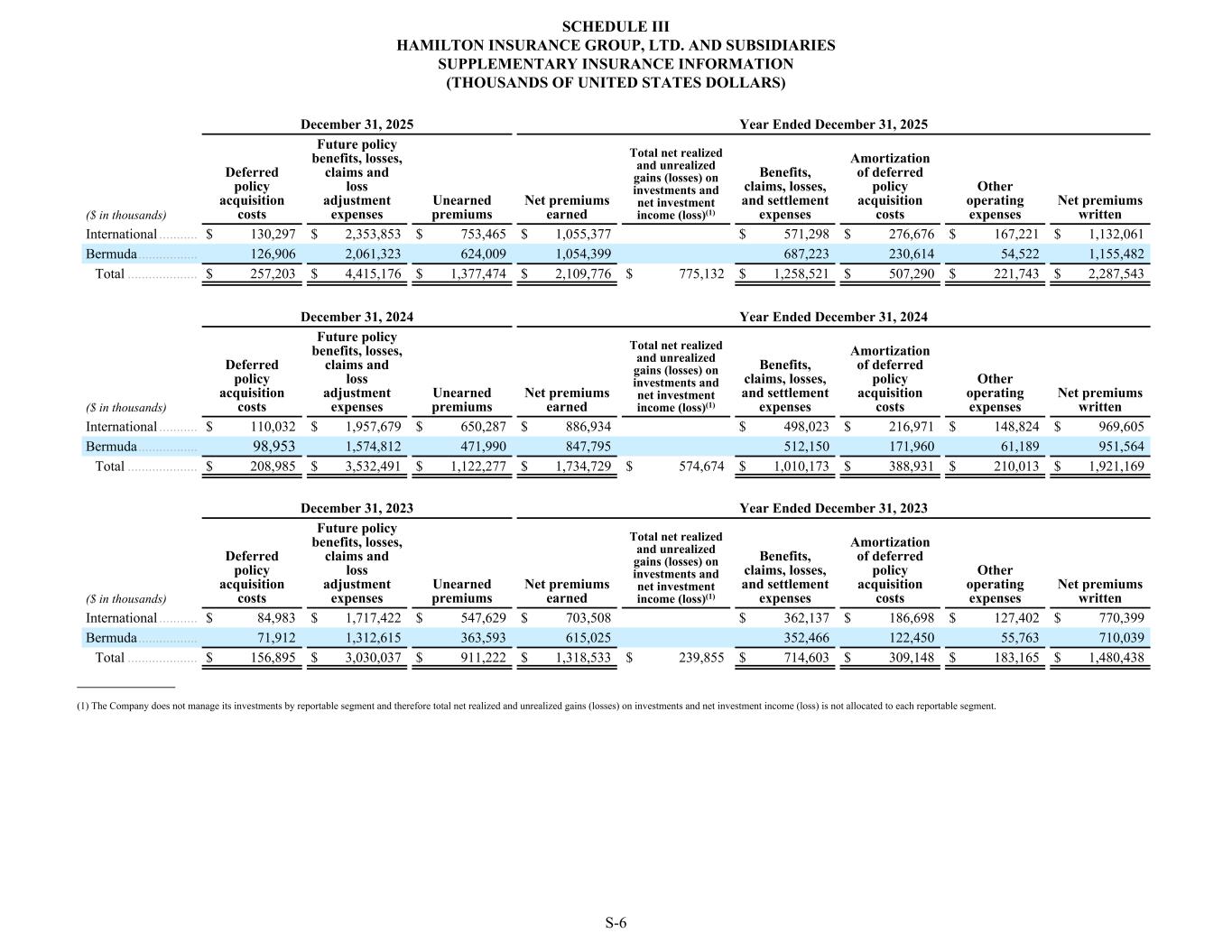 December 31, 2025 Year Ended December 31, 2025 ($ in thousands) Deferred policy acquisition costs Future policy benefits, losses, claims and loss adjustment expenses Unearned premiums Net premiums earned Total net realized and unrealized gains (losses) on investments and net investment income (loss)(1) Benefits, claims, losses, and settlement expenses Amortization of deferred policy acquisition costs Other operating expenses Net premiums written International ........... $ 130,297 $ 2,353,853 $ 753,465 $ 1,055,377 $ 571,298 $ 276,676 $ 167,221 $ 1,132,061 Bermuda ................. 126,906 2,061,323 624,009 1,054,399 687,223 230,614 54,522 1,155,482 Total .................... $ 257,203 $ 4,415,176 $ 1,377,474 $ 2,109,776 $ 775,132 $ 1,258,521 $ 507,290 $ 221,743 $ 2,287,543 December 31, 2024 Year Ended December 31, 2024 ($ in thousands) Deferred policy acquisition costs Future policy benefits, losses, claims and loss adjustment expenses Unearned premiums Net premiums earned Total net realized and unrealized gains (losses) on investments and net investment income (loss)(1) Benefits, claims, losses, and settlement expenses Amortization of deferred policy acquisition costs Other operating expenses Net premiums written International ........... $ 110,032 $ 1,957,679 $ 650,287 $ 886,934 $ 498,023 $ 216,971 $ 148,824 $ 969,605 Bermuda ................. 98,953 1,574,812 471,990 847,795 512,150 171,960 61,189 951,564 Total .................... $ 208,985 $ 3,532,491 $ 1,122,277 $ 1,734,729 $ 574,674 $ 1,010,173 $ 388,931 $ 210,013 $ 1,921,169 December 31, 2023 Year Ended December 31, 2023 ($ in thousands) Deferred policy acquisition costs Future policy benefits, losses, claims and loss adjustment expenses Unearned premiums Net premiums earned Total net realized and unrealized gains (losses) on investments and net investment income (loss)(1) Benefits, claims, losses, and settlement expenses Amortization of deferred policy acquisition costs Other operating expenses Net premiums written International ........... $ 84,983 $ 1,717,422 $ 547,629 $ 703,508 $ 362,137 $ 186,698 $ 127,402 $ 770,399 Bermuda ................. 71,912 1,312,615 363,593 615,025 352,466 122,450 55,763 710,039 Total .................... $ 156,895 $ 3,030,037 $ 911,222 $ 1,318,533 $ 239,855 $ 714,603 $ 309,148 $ 183,165 $ 1,480,438 (1) The Company does not manage its investments by reportable segment and therefore total net realized and unrealized gains (losses) on investments and net investment income (loss) is not allocated to each reportable segment. SCHEDULE III HAMILTON INSURANCE GROUP, LTD. AND SUBSIDIARIES SUPPLEMENTARY INSURANCE INFORMATION (THOUSANDS OF UNITED STATES DOLLARS) S-6