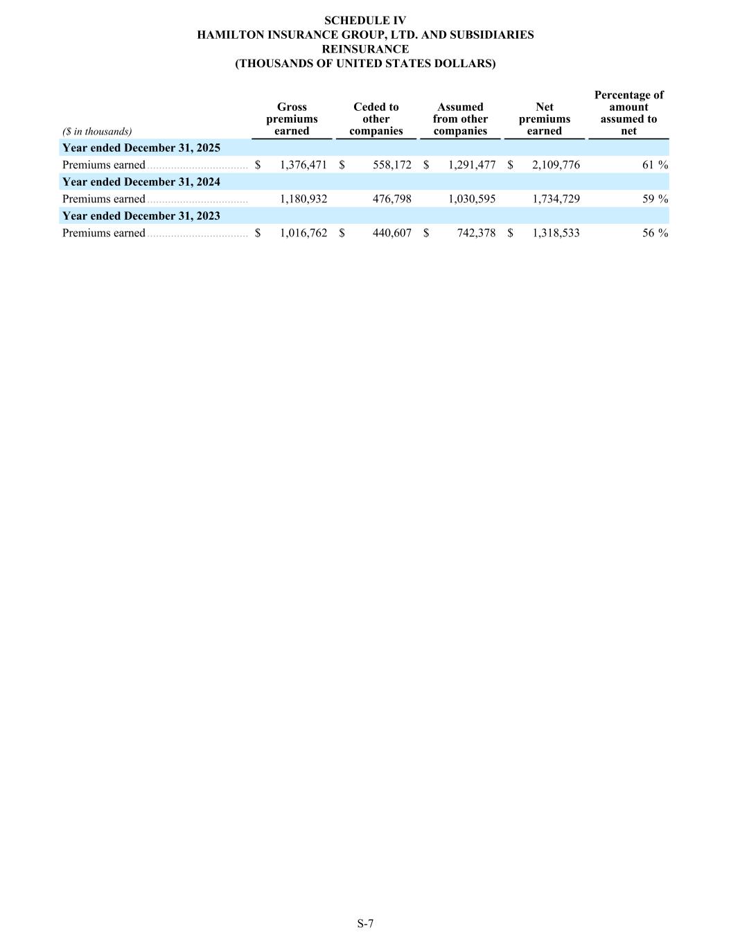 ($ in thousands) Gross premiums earned Ceded to other companies Assumed from other companies Net premiums earned Percentage of amount assumed to net Year ended December 31, 2025 Premiums earned .................................. $ 1,376,471 $ 558,172 $ 1,291,477 $ 2,109,776 61 % Year ended December 31, 2024 Premiums earned .................................. 1,180,932 476,798 1,030,595 1,734,729 59 % Year ended December 31, 2023 Premiums earned .................................. $ 1,016,762 $ 440,607 $ 742,378 $ 1,318,533 56 % SCHEDULE IV HAMILTON INSURANCE GROUP, LTD. AND SUBSIDIARIES REINSURANCE (THOUSANDS OF UNITED STATES DOLLARS) S-7