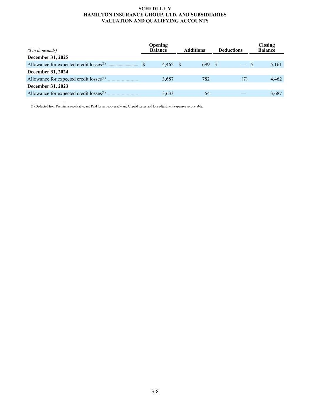 ($ in thousands) Opening Balance Additions Deductions Closing Balance December 31, 2025 Allowance for expected credit losses(1) ............................ $ 4,462 $ 699 $ — $ 5,161 December 31, 2024 Allowance for expected credit losses(1) ......................... 3,687 782 (7) 4,462 December 31, 2023 Allowance for expected credit losses(1) ......................... 3,633 54 — 3,687 (1) Deducted from Premiums receivable, and Paid losses recoverable and Unpaid losses and loss adjustment expenses recoverable. SCHEDULE V HAMILTON INSURANCE GROUP, LTD. AND SUBSIDIARIES VALUATION AND QUALIFYING ACCOUNTS S-8