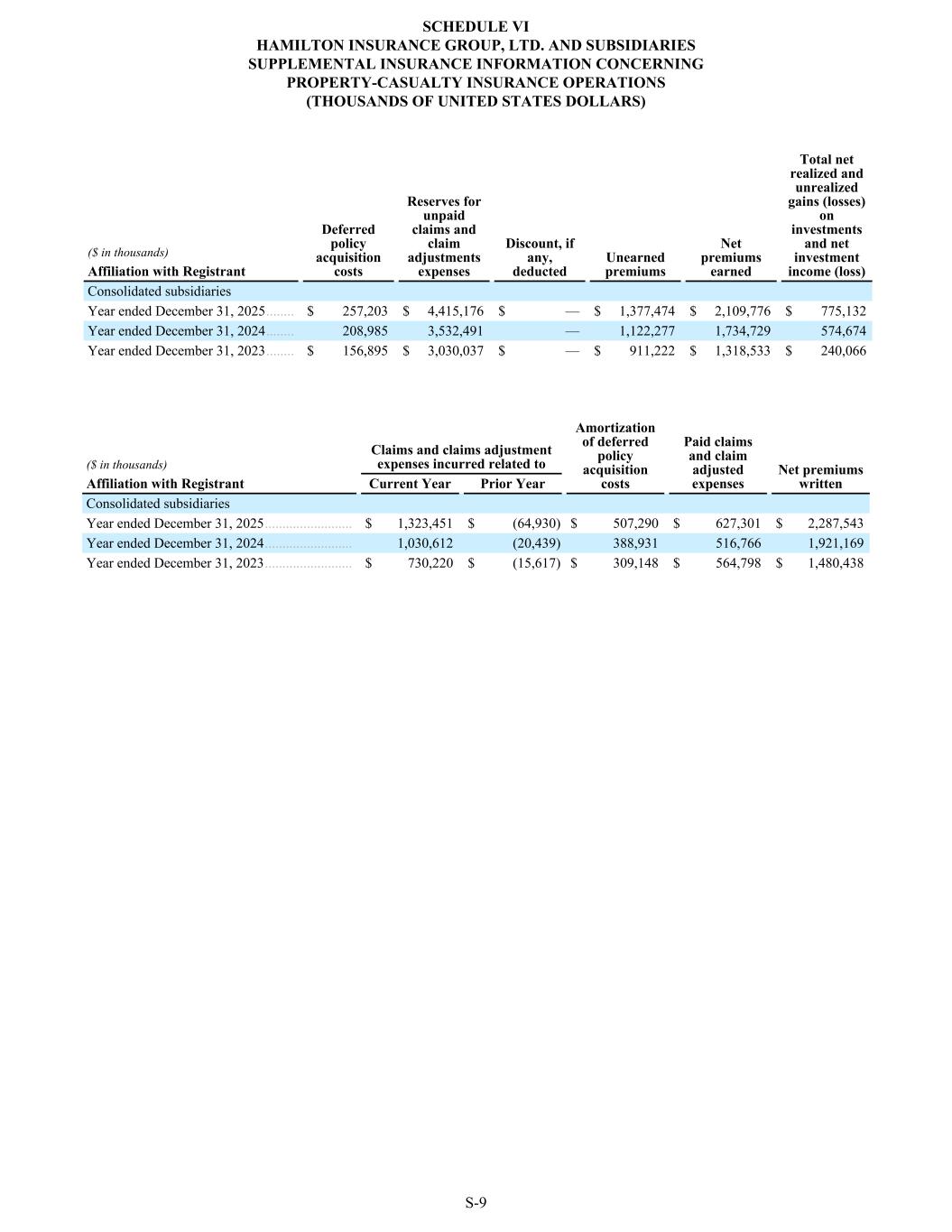 Deferred policy acquisition costs Reserves for unpaid claims and claim adjustments expenses Discount, if any, deducted Unearned premiums Net premiums earned Total net realized and unrealized gains (losses) on investments and net investment income (loss) ($ in thousands) Affiliation with Registrant Consolidated subsidiaries Year ended December 31, 2025 ........ $ 257,203 $ 4,415,176 $ — $ 1,377,474 $ 2,109,776 $ 775,132 Year ended December 31, 2024 ........ 208,985 3,532,491 — 1,122,277 1,734,729 574,674 Year ended December 31, 2023 ........ $ 156,895 $ 3,030,037 $ — $ 911,222 $ 1,318,533 $ 240,066 Amortization of deferred policy acquisition costs Paid claims and claim adjusted expenses Net premiums written ($ in thousands) Claims and claims adjustment expenses incurred related to Affiliation with Registrant Current Year Prior Year Consolidated subsidiaries Year ended December 31, 2025 ......................... $ 1,323,451 $ (64,930) $ 507,290 $ 627,301 $ 2,287,543 Year ended December 31, 2024 ......................... 1,030,612 (20,439) 388,931 516,766 1,921,169 Year ended December 31, 2023 ......................... $ 730,220 $ (15,617) $ 309,148 $ 564,798 $ 1,480,438 SCHEDULE VI HAMILTON INSURANCE GROUP, LTD. AND SUBSIDIARIES SUPPLEMENTAL INSURANCE INFORMATION CONCERNING PROPERTY-CASUALTY INSURANCE OPERATIONS (THOUSANDS OF UNITED STATES DOLLARS) S-9